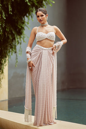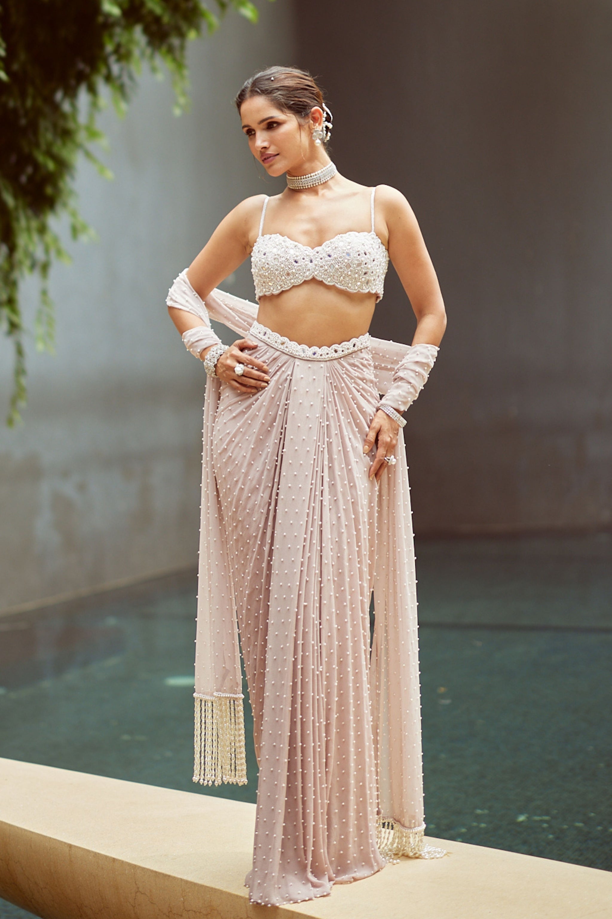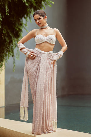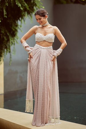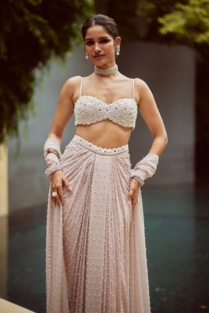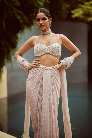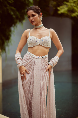 • Light beige satin draped skirt set paired with a heavily mirror and pearl embroidered blouse and a satin stole.