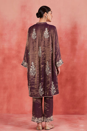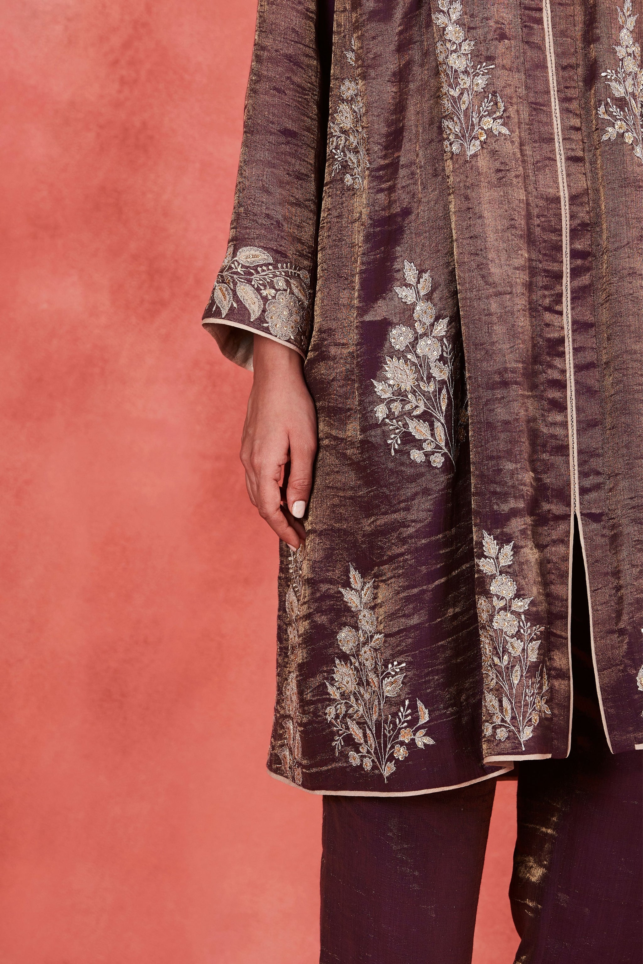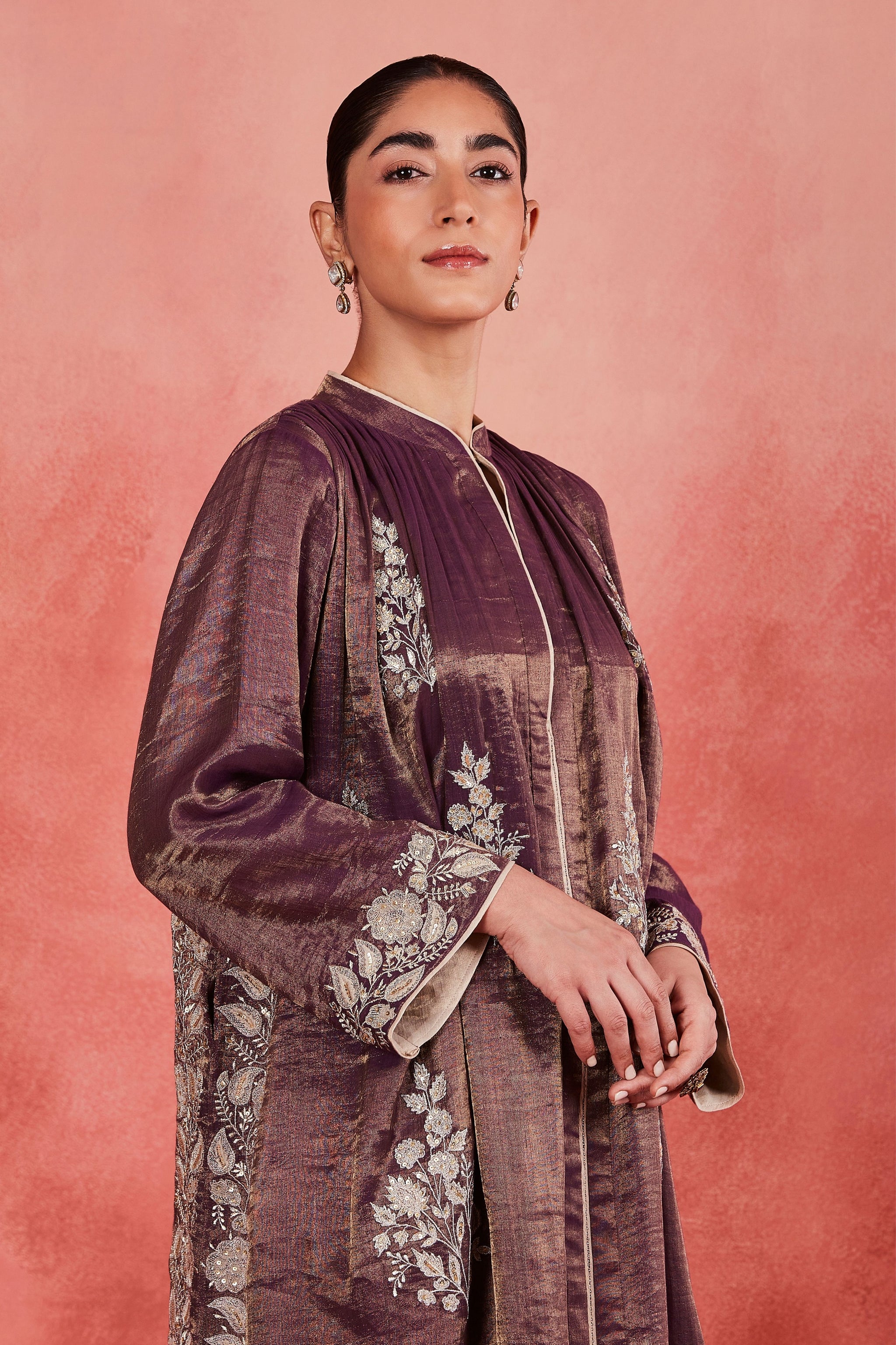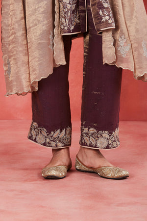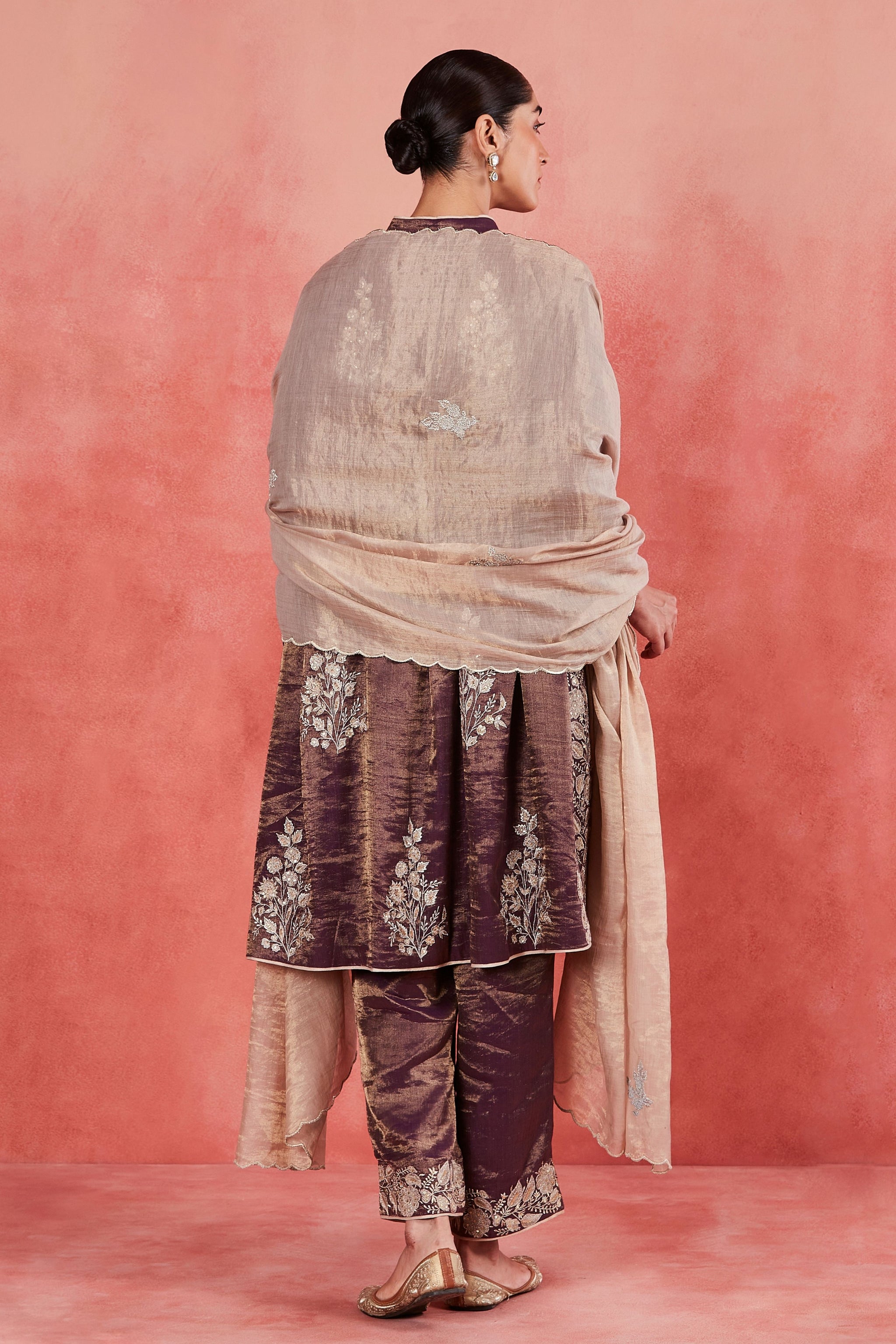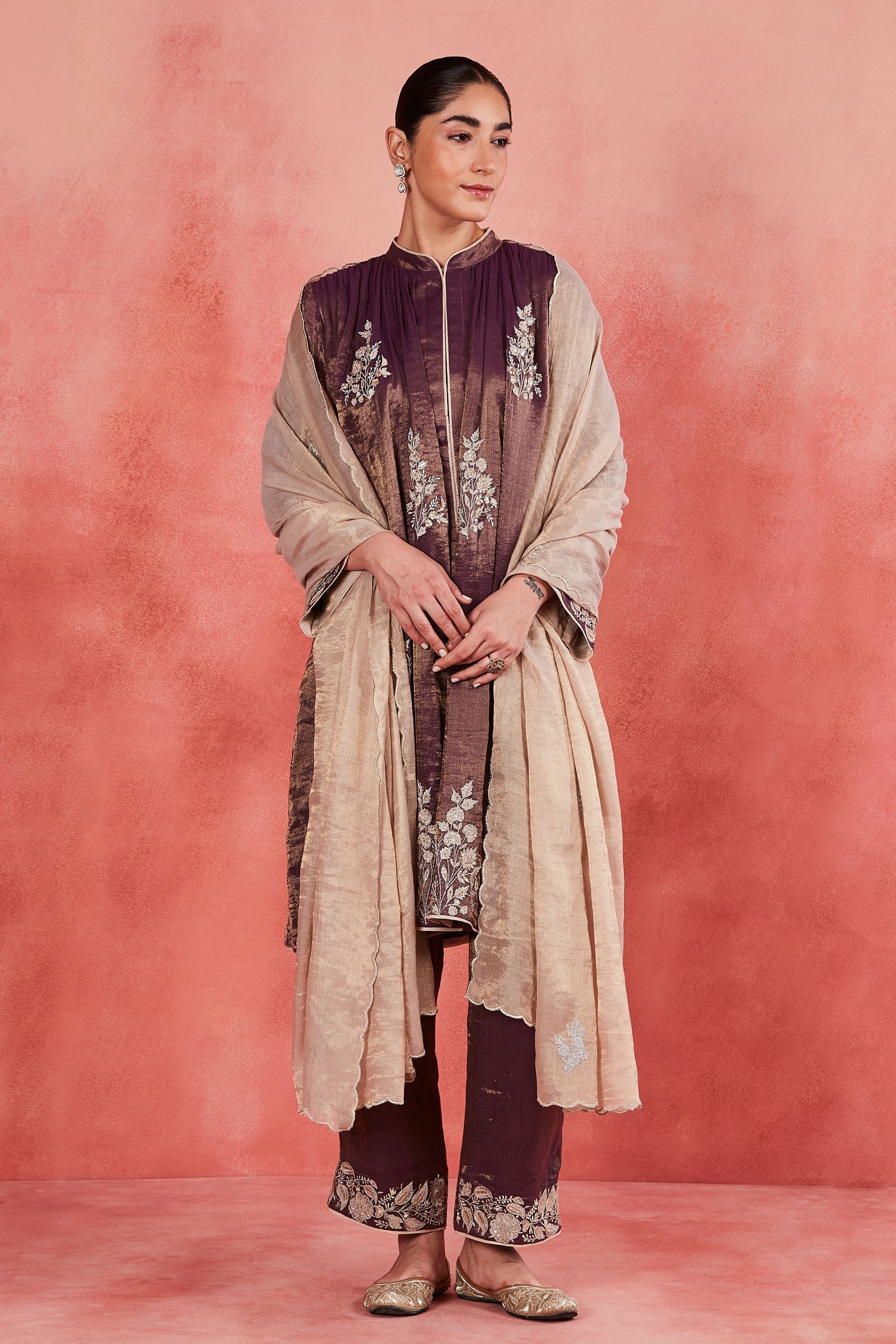 • This is a dark purple gathered kurta set in handwoven cotton tissue with chinese collar and slit, loose full sleeves, and convenient side pockets. Paired with matching straight pants and a beige handwoven silk tissue dupatta.The ensemble is adorned with gold zari and silk thread embroidery in a graceful floral jaal pattern, enhanced with gold sequins. It’s finished with contrasting piping and scalloped detailing. This handcrafted ensemble showcases unique charm and character. It may have slight irregularities in pattern, colour, or texture, celebrating the craftsmanship and individuality of each piece. Embrace these variations as a part of the product's story, crafted with care and attention to detail.