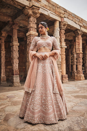 • Our skin colour wedding organza lehenga is designed with gorgeous floral and mirror work is combined perfectly with a exquisite net dupatta and a stunning embroidered raw silk blouse.
