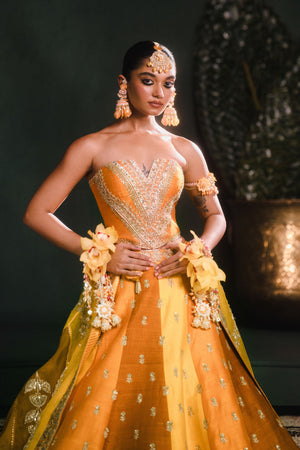 • Glittering like the hues of a sunrise, the son patissa lehenga is a perfect ensemble for the bride who is a burst of sunshine. A joyful resplendant silk lehenga with our raj pankh and chand-phool motifs nestled within geometrical layout. The blouse unlike others, is a structured corset blouse heavily embroidered in intricate gold sitara embroidery. The dupatta is also patched with shades of ochre and hosts an enlarged raj pankh motif that brings the whole look together. Comes with a separate can can.