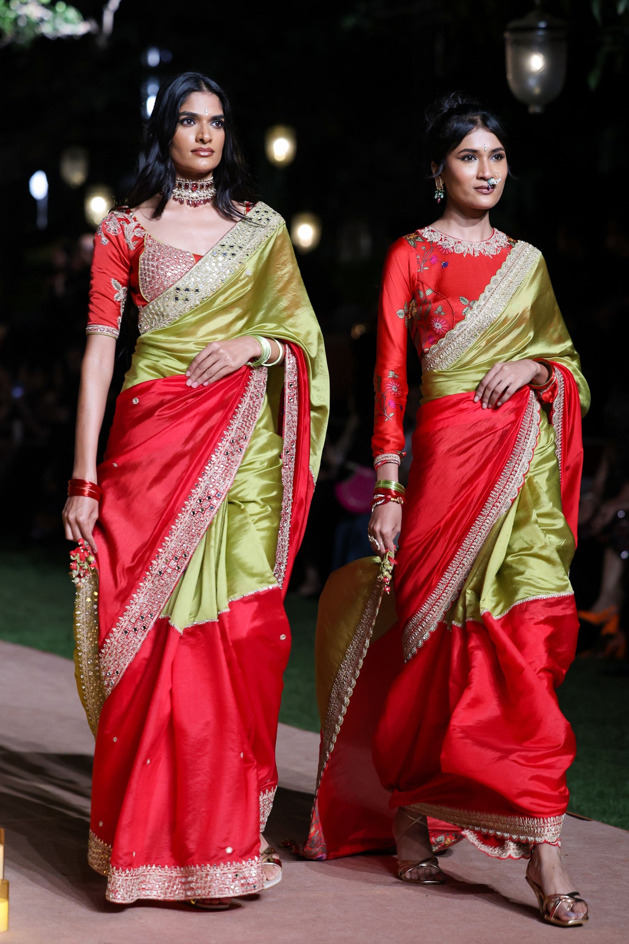 • Our classic dual tone surkh laal and dry heena green saree is meant to make you feel like rajasthan's royalty. The sari and blouse is enriched with gold kaanch, patra ka kaam and salma accents, exuding unmatched regal opulence. The entire set is a blend of grandeur with comfort by using lightweight materials and exquisite embellishments.