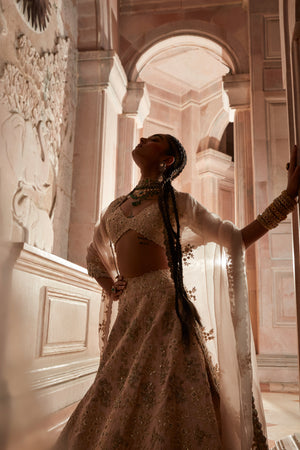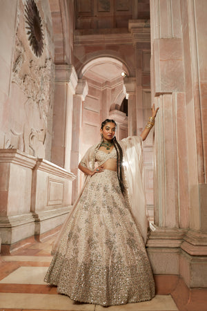 • All over zardosi and resham embroidered bunches lehenga with heavily embroidered bottom paired with plunge neck blouse with detailed mid sleeves and zardosi and resham embroidered dupatta.