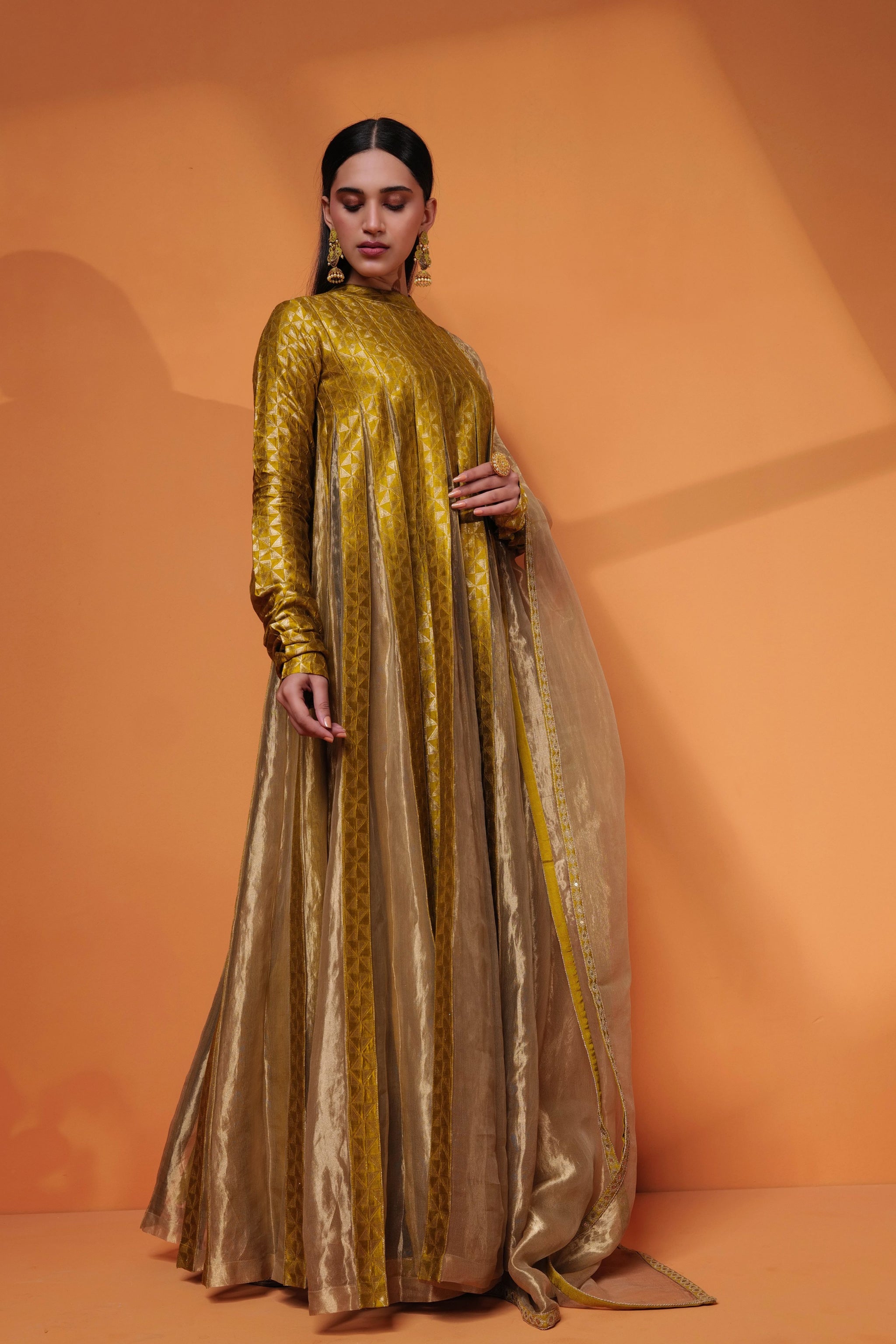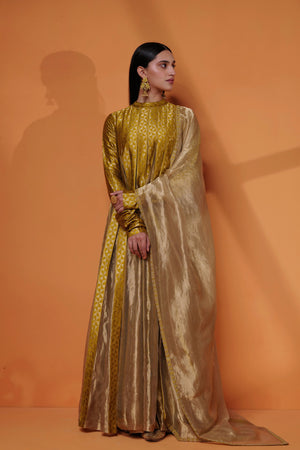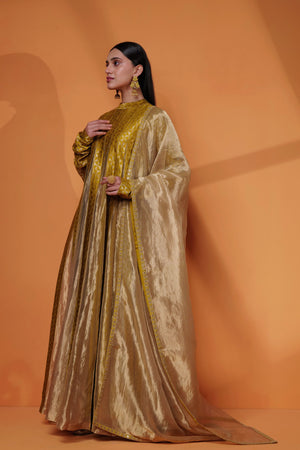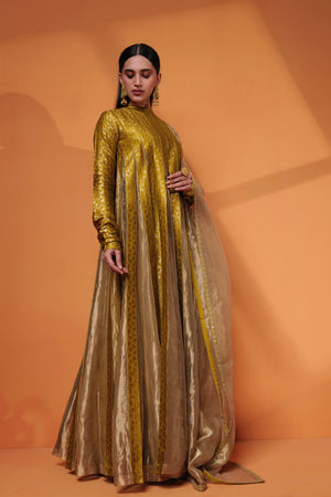 • Pure hand woven banarasi kataan silk and zari tissue pleated tall gown with churi sleeves. Pure zari tissue dupatta embellished with couching embroidery border.