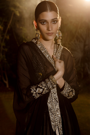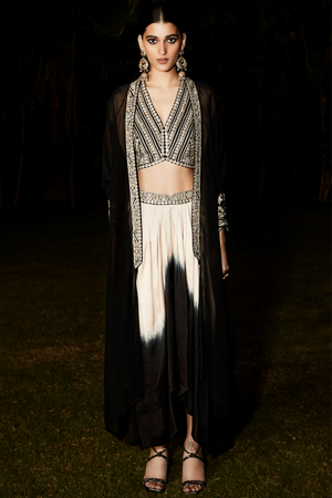 • Tarnished silver embroidery in vintage zardozi, aztec & flora inspired artworks. The blouse is created with a greako-roman influence. A winged closed cuff cape created in plant based organza georgette. The draped skirt is an experimental omre on silk with the iconic matsya v belt line.