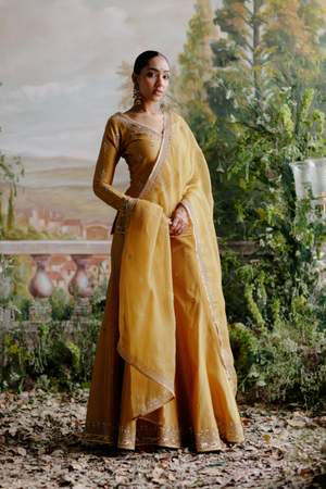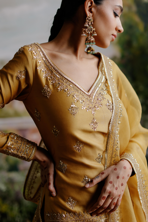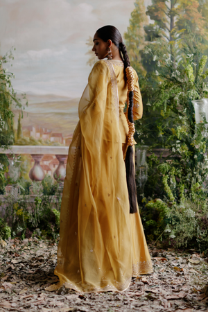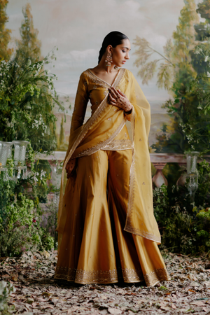 • Featuring a Tuscany mustard Chanderi kurta sharara set paired with organza base dupatta with antique gold dori and aari embroidery.