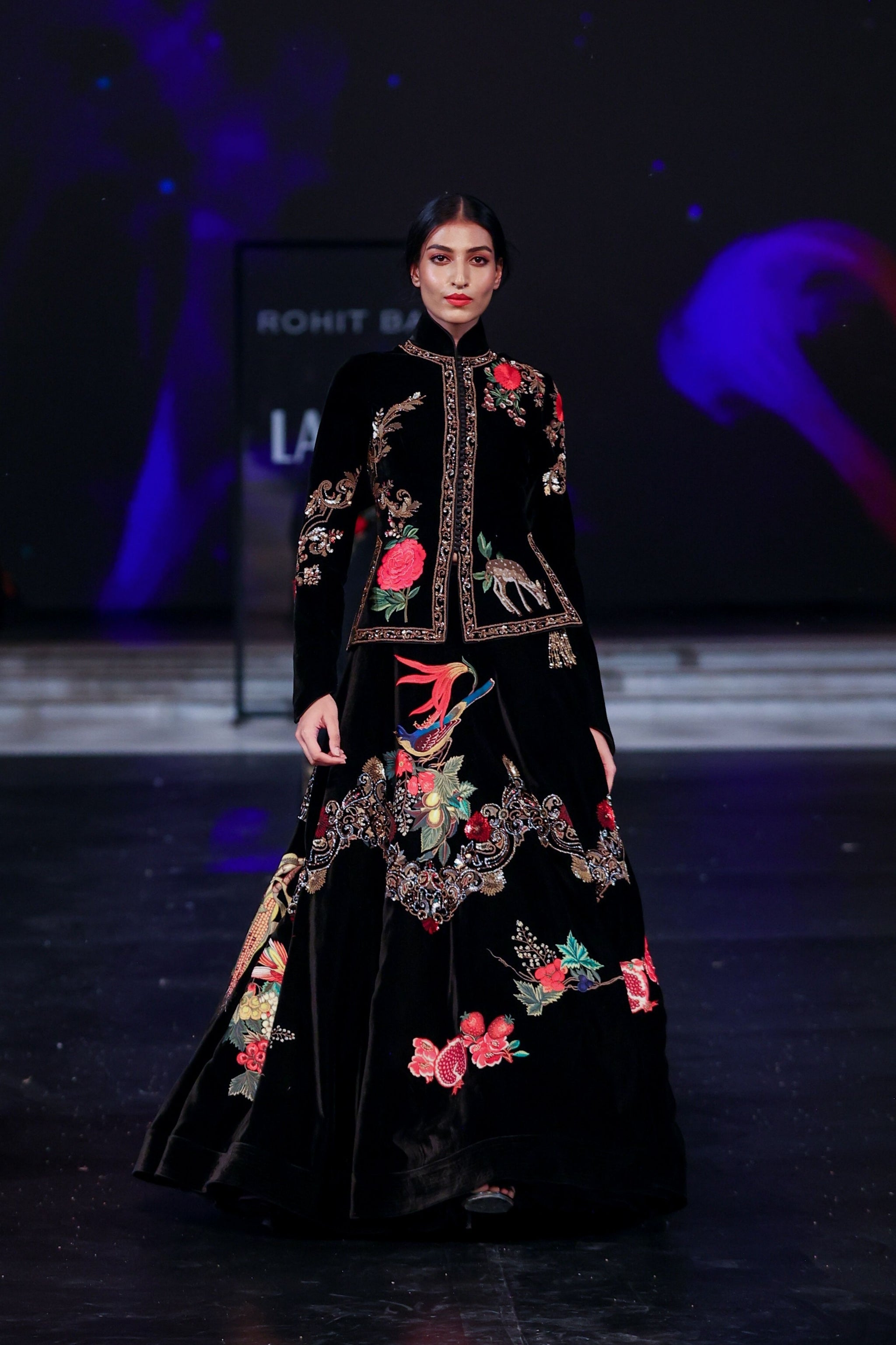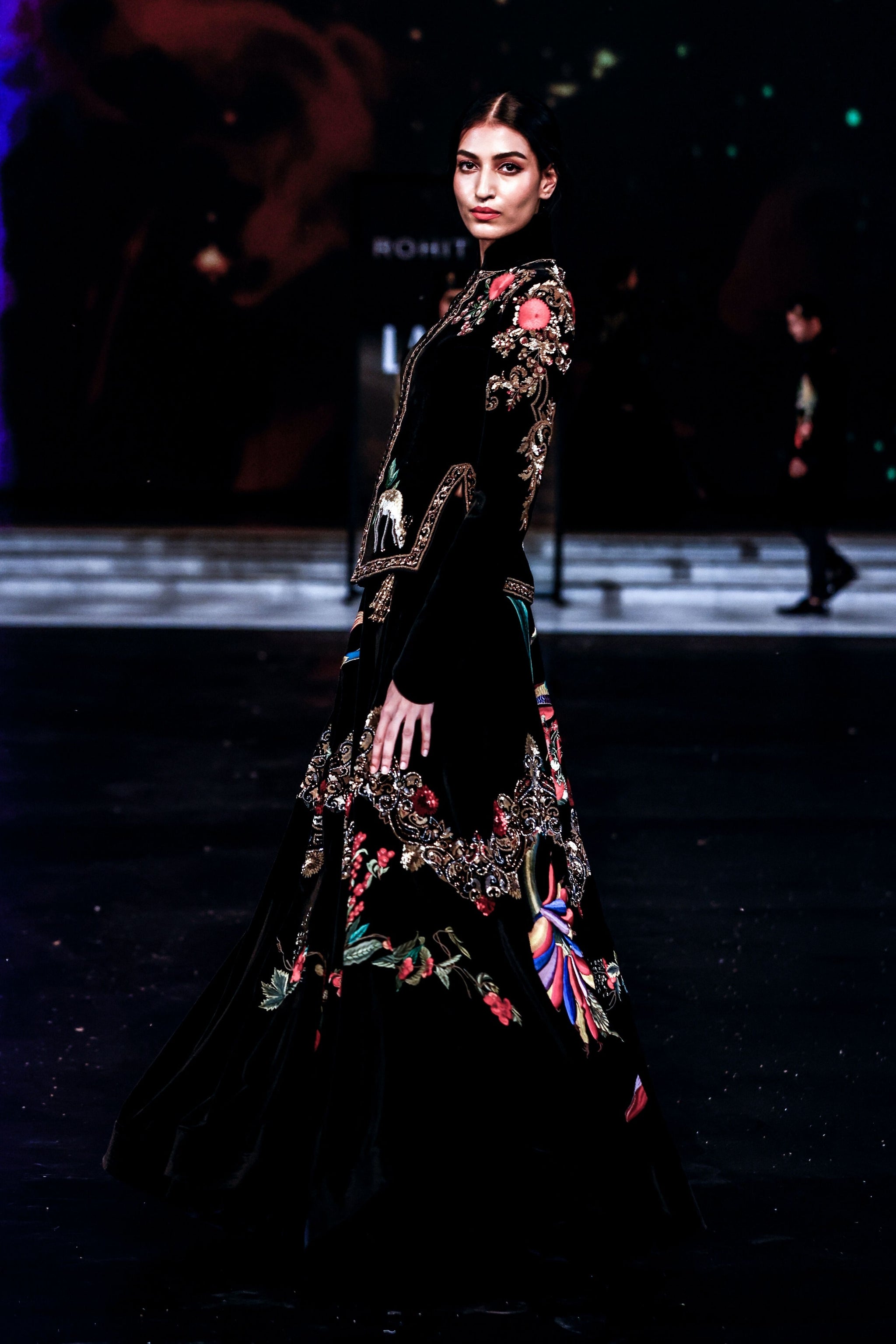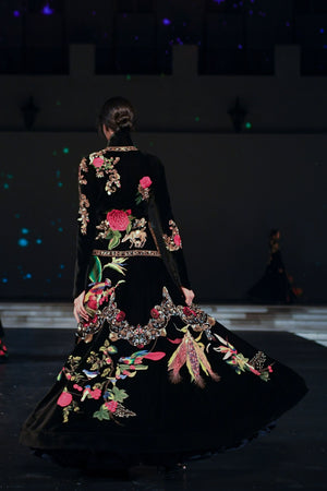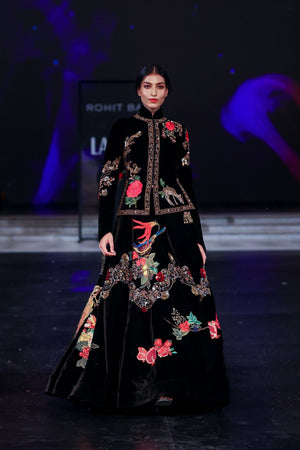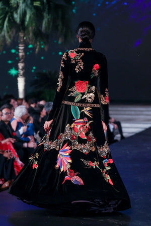 • This exquisite set features a velvet lehenga with 12 kalis, showcasing intricate handwork embroidery that adds a touch of sophistication and charm. The velvet short jacket complements the lehenga perfectly, with delicate dori work and embroidered detailing, creating a refined, elegant look. This designer ensemble is crafted for special occasions, blending timeless luxury with modern flair, perfect for those seeking a standout piece for festive events