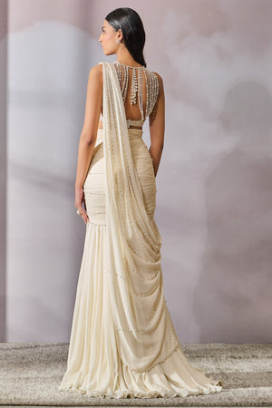 • Signature concept saree paired with a blouse adorned with pearl strands and embellished with diamond studs.