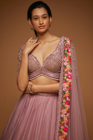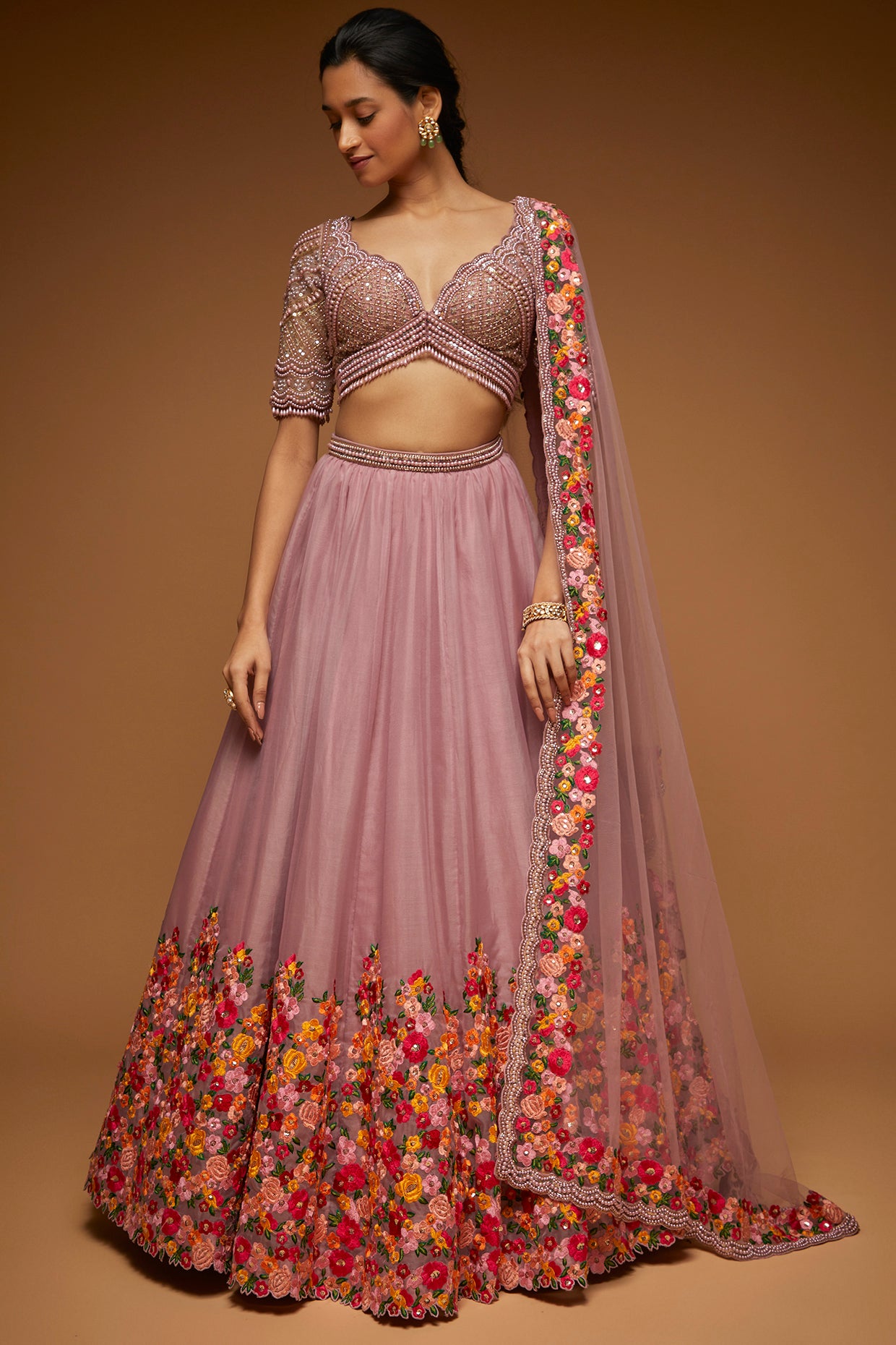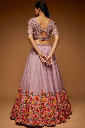 • Inspired by vrindawan, is this lavender mist lehenga in multicolor floral resham work with sequin and overall heavy pearl and bead embroidered blouse along with tulle dupatta with floral border.