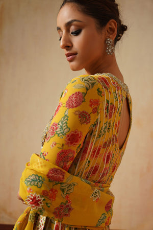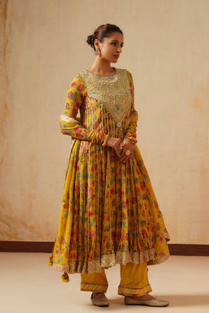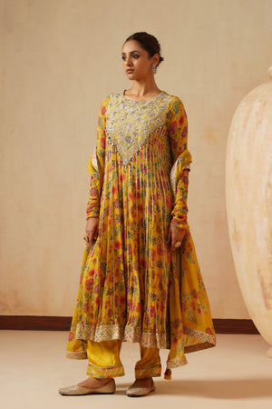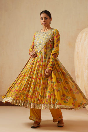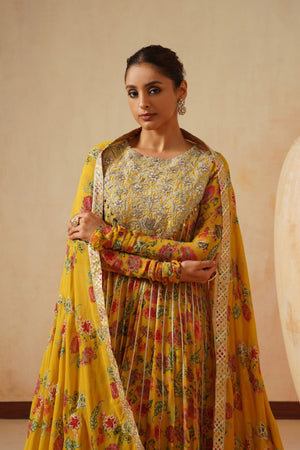 • The pleated Anarkali with Churi Sleeves in Printed Georgette with a Dabka and Silver Zari Embroidered Yoke with Gota Stripes and a broad Gota Border in the signature Simar Dugal Design.
