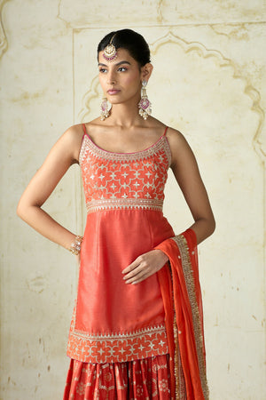 • This vibrant traditional ensemble radiates festive elegance with its youthful silhouette. The sleeveless kurta is adorned with delicate embroidery on the neckline and waistline, paired with a sharara featuring intricate woven patterns and a richly embellished hem. The look is completed with a sheer dupatta.