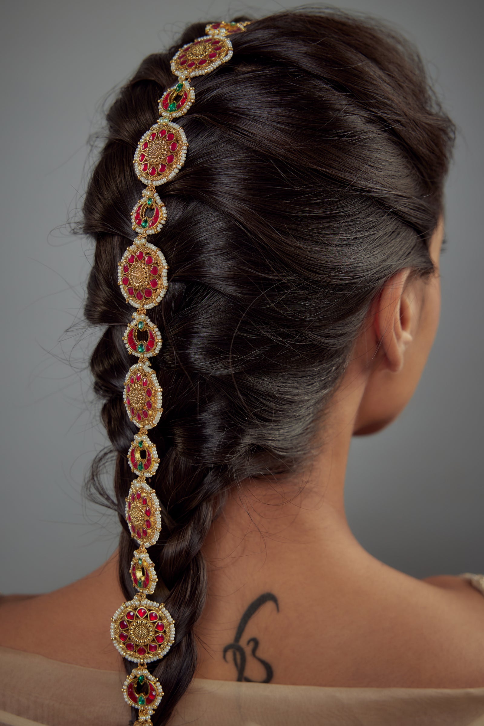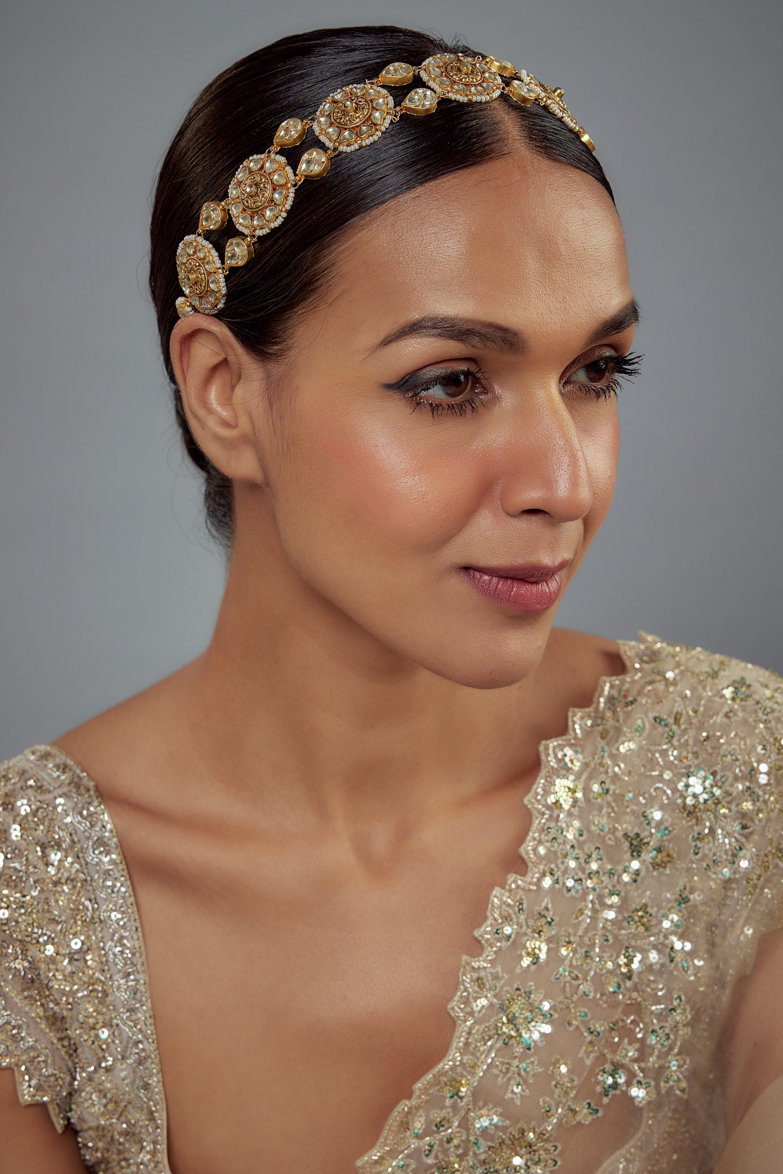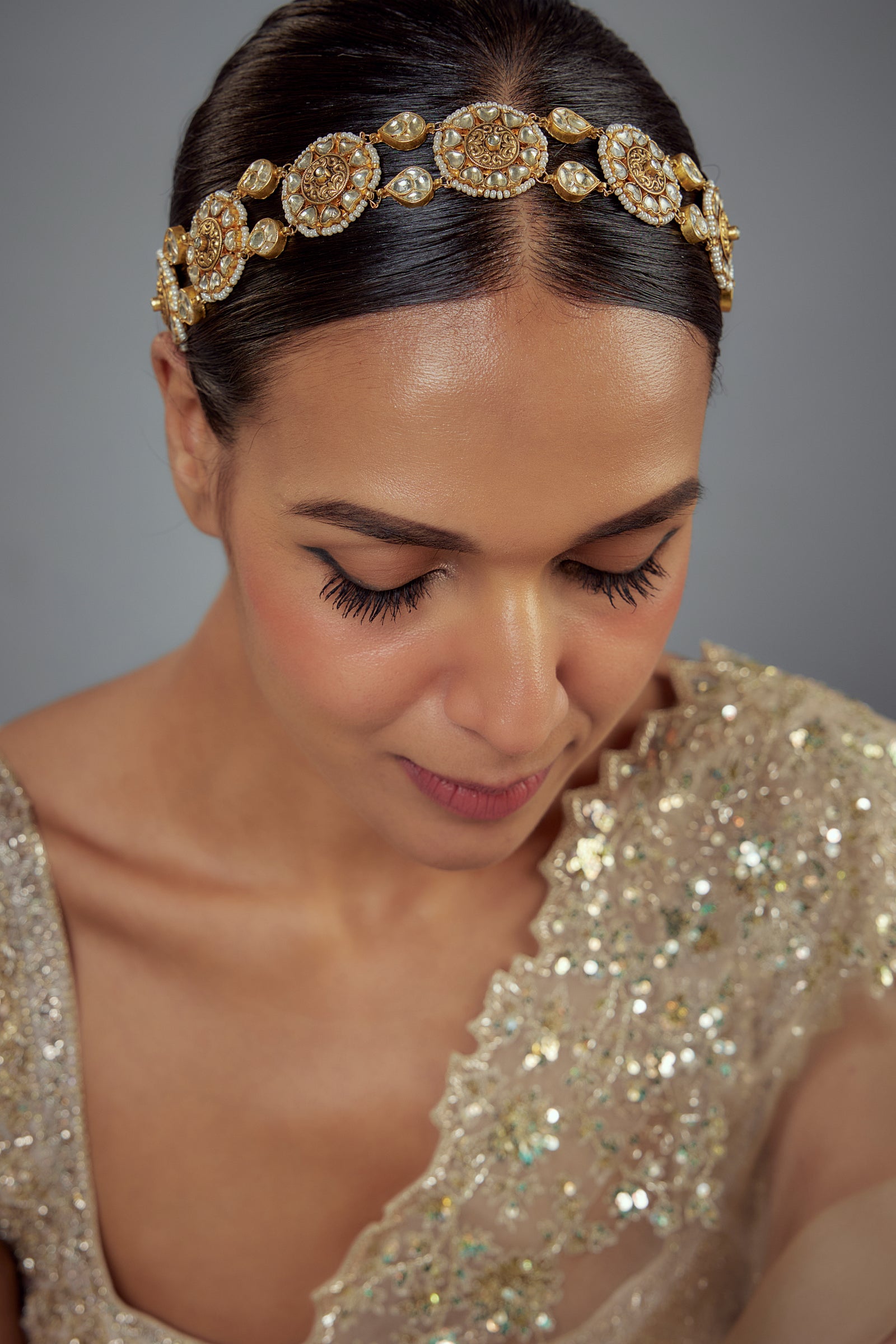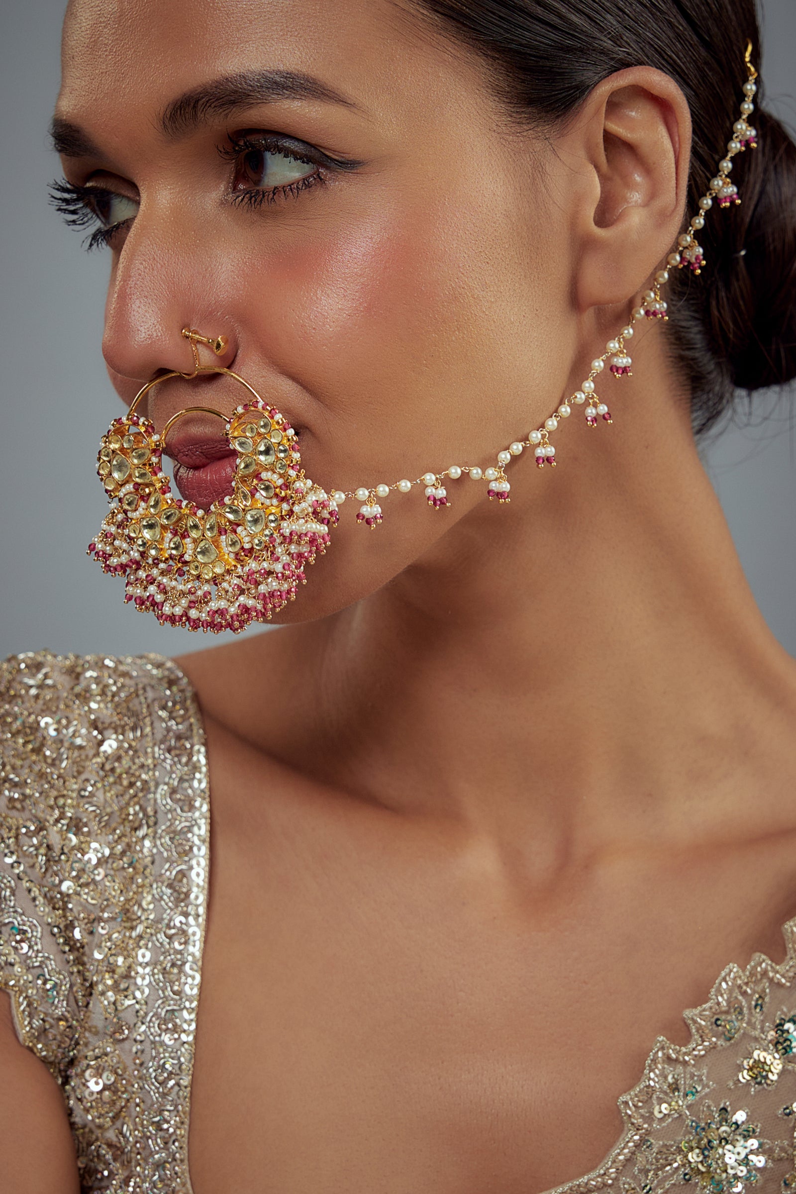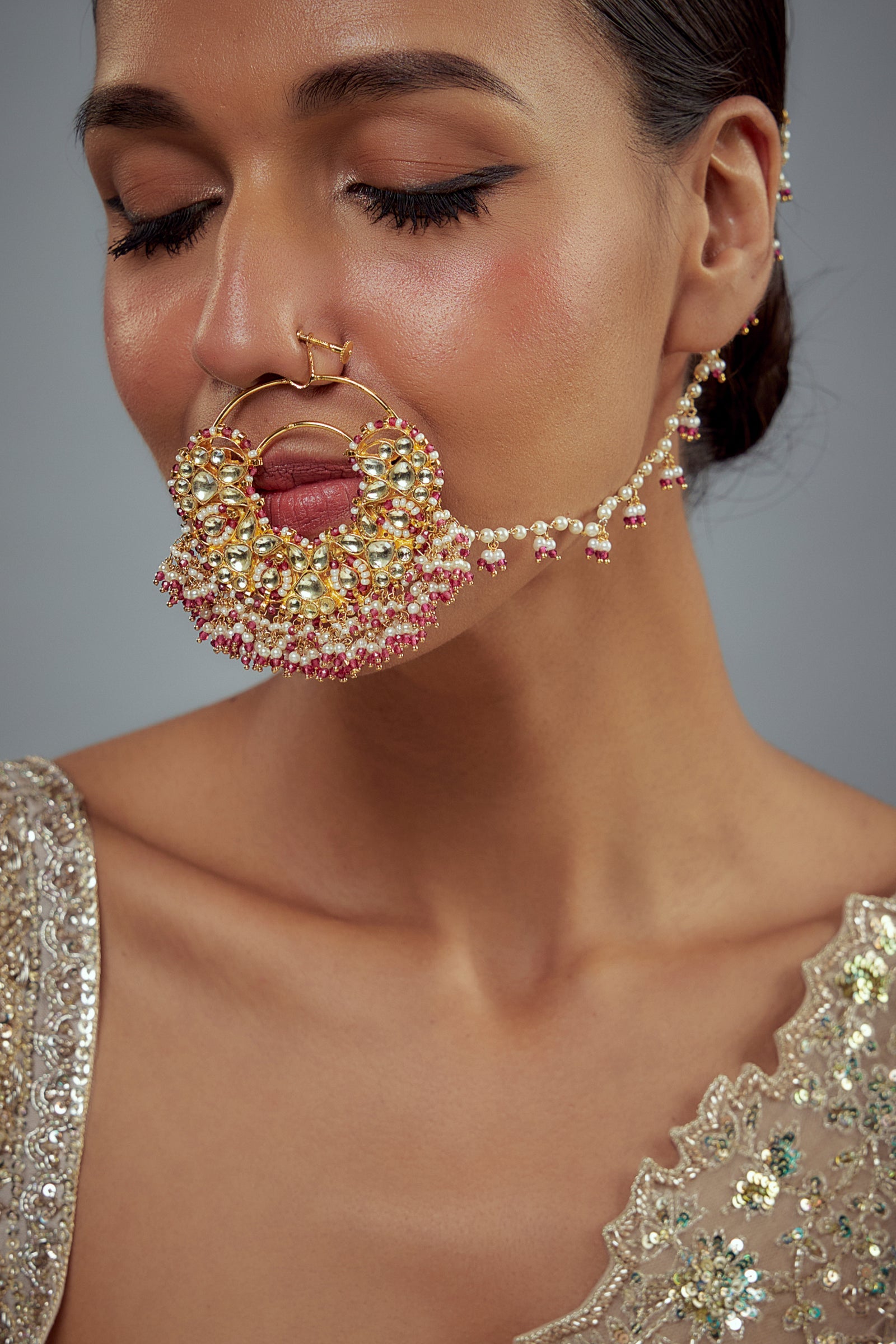 • A delicate gold-toned nath featuring an intricate floral motif with kundan embellishments & a dainty pearl chain attachment. Perfect for weddings & festive occasions, blending tradition with elegance.
