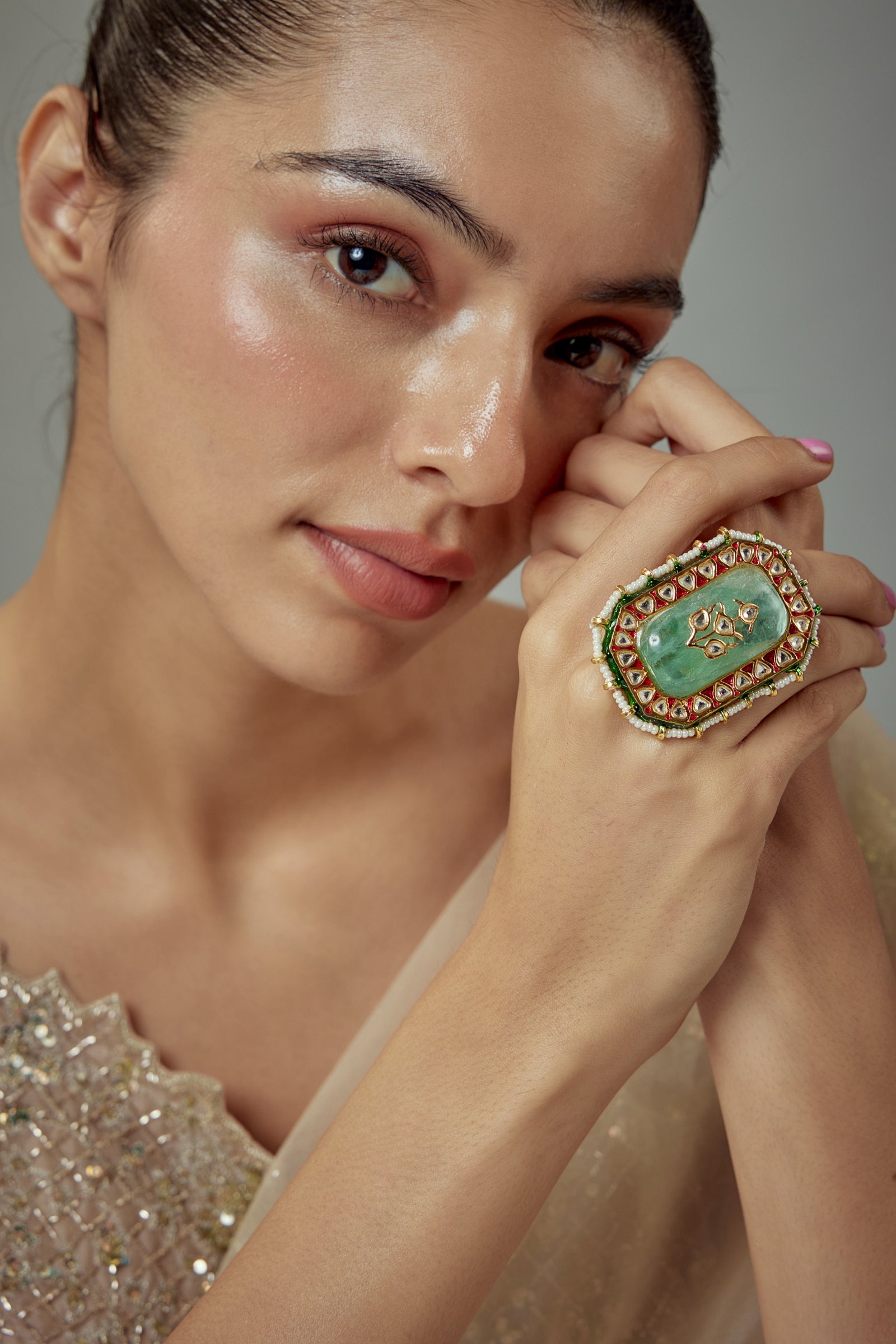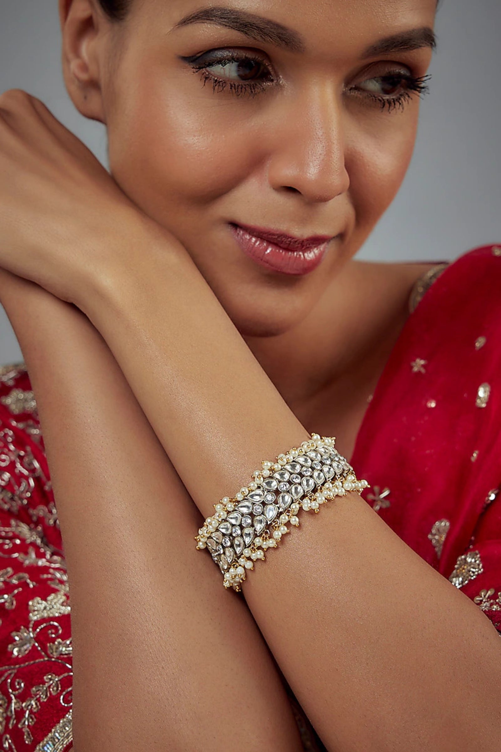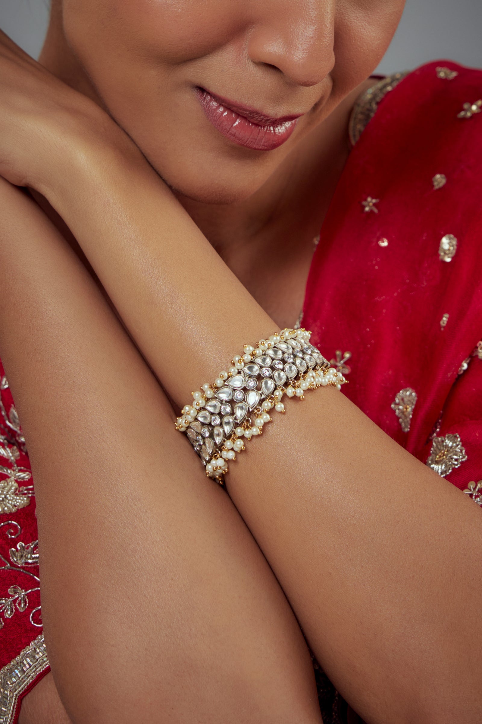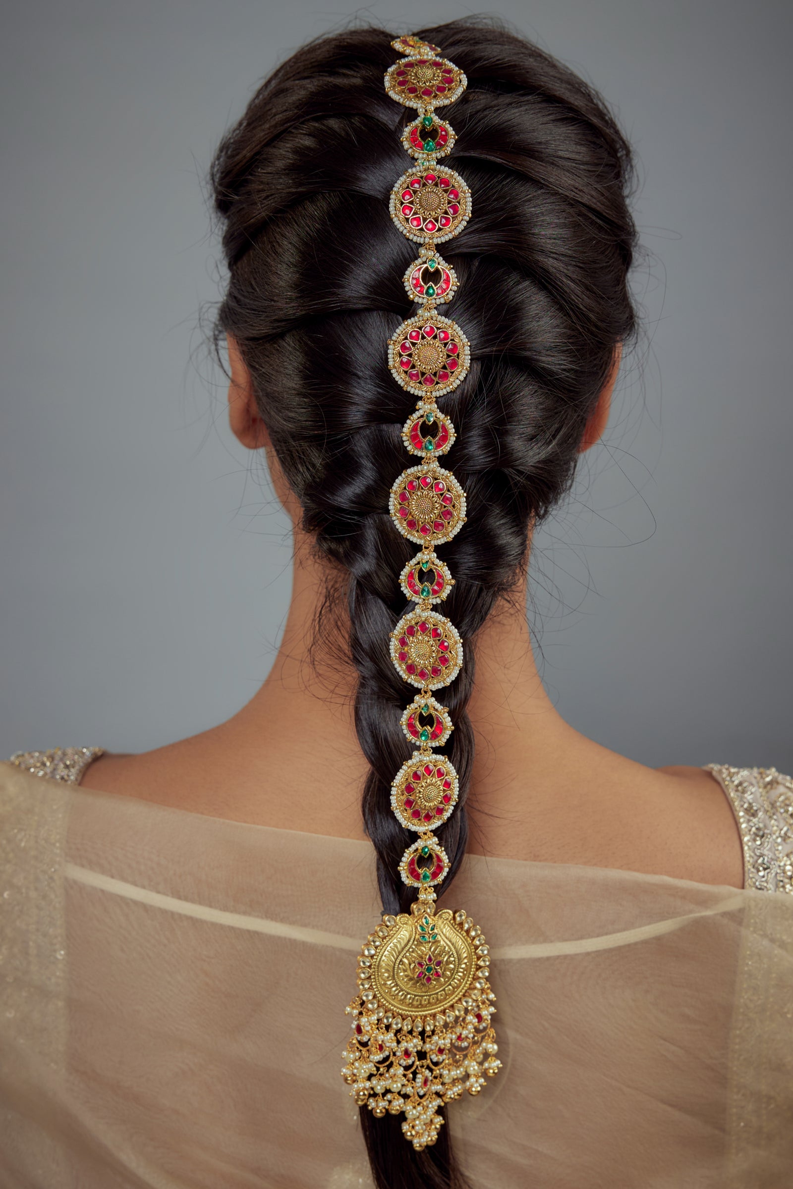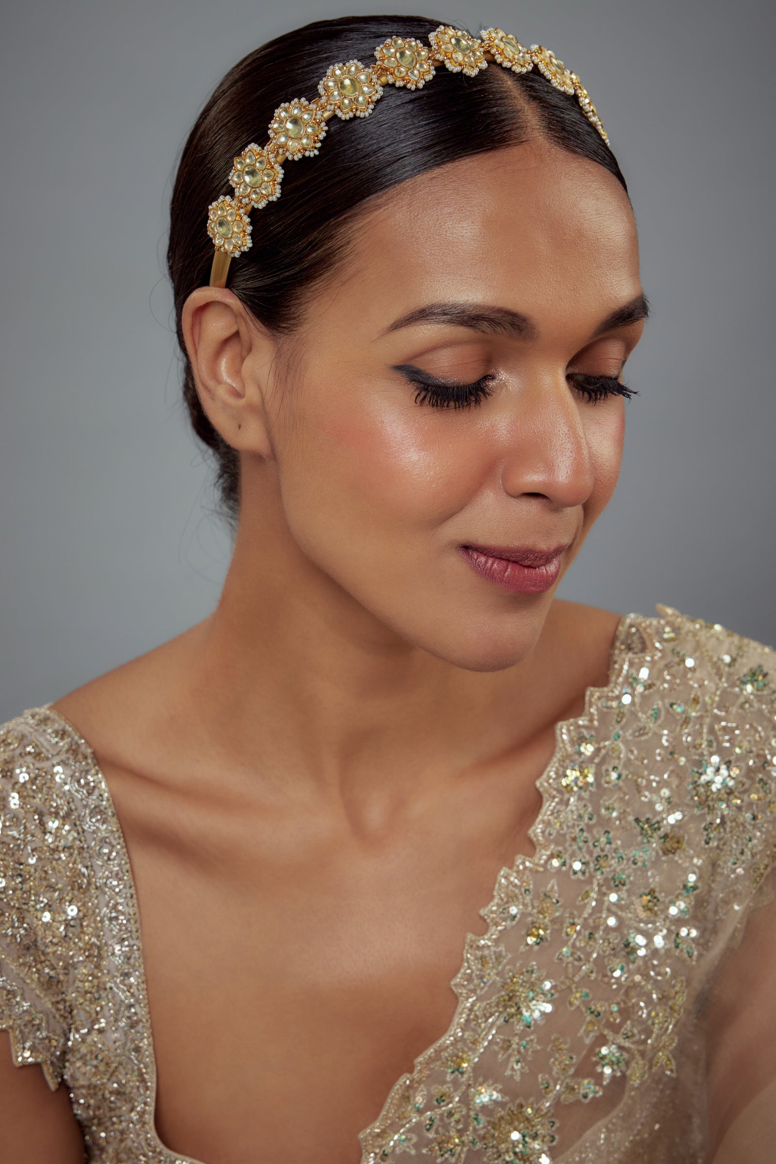 • A delicate gold-toned nath featuring an intricate floral motif with kundan embellishments & a dainty pearl chain attachment. Perfect for weddings & festive occasions, blending tradition with elegance.