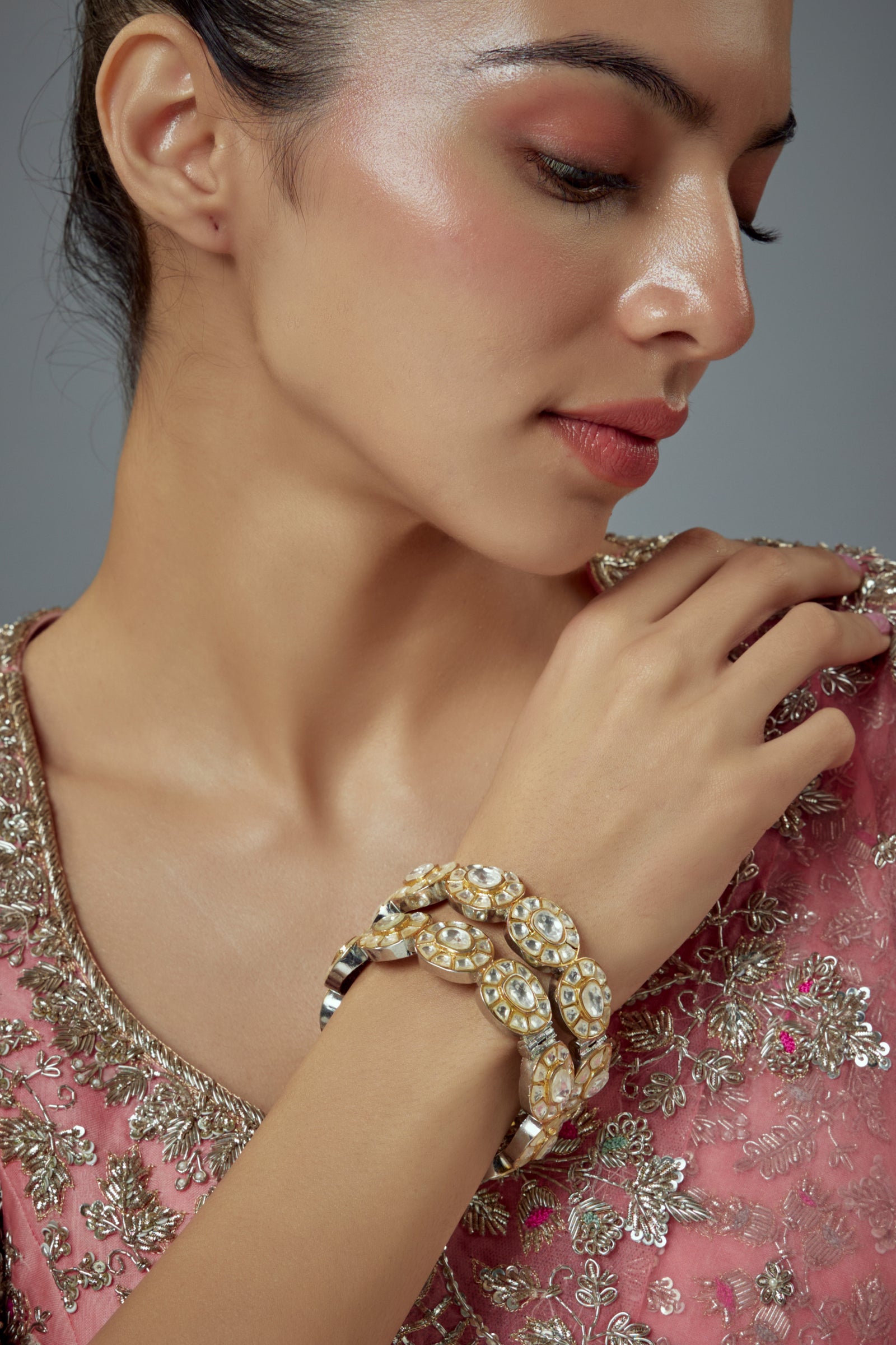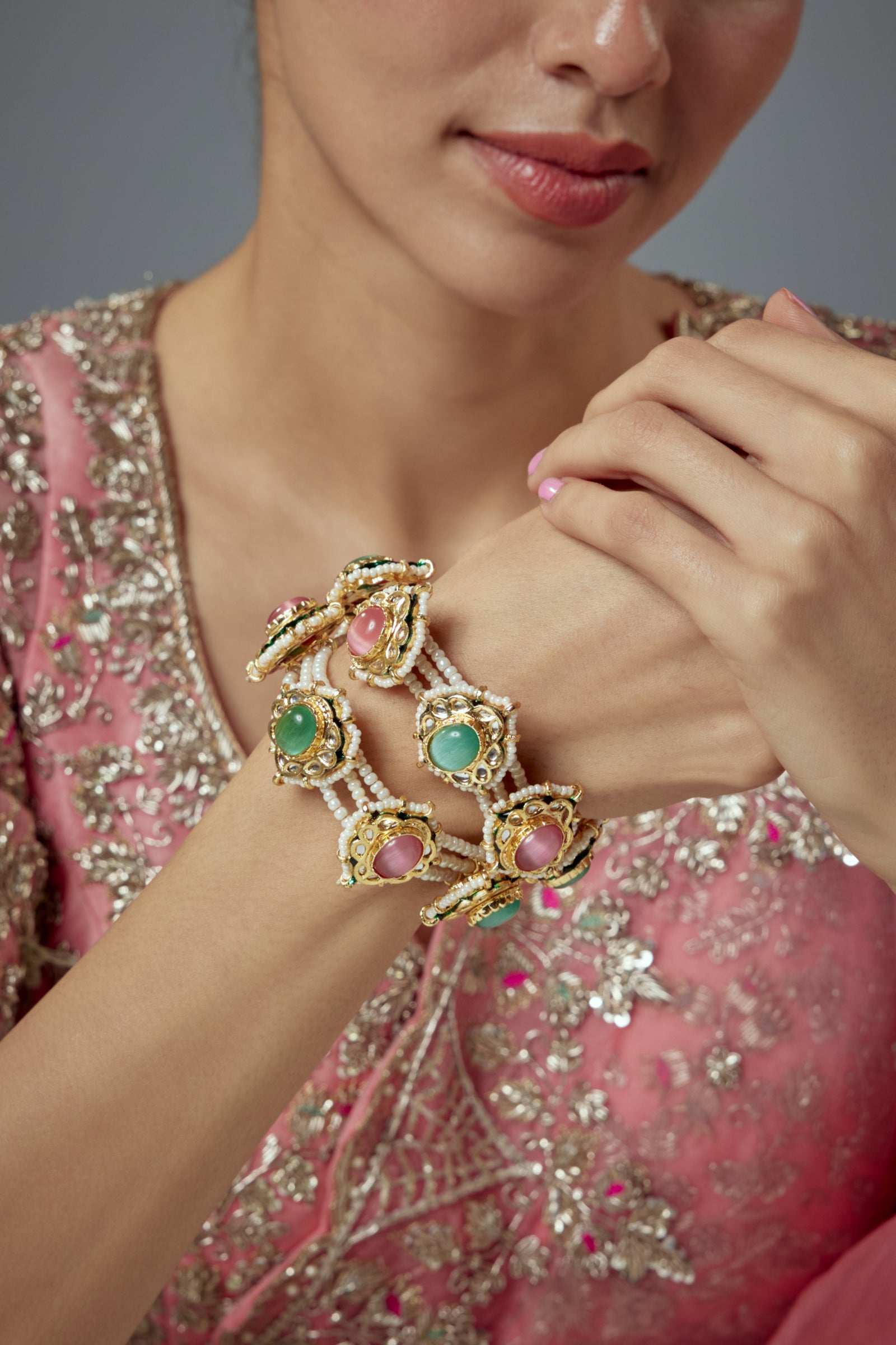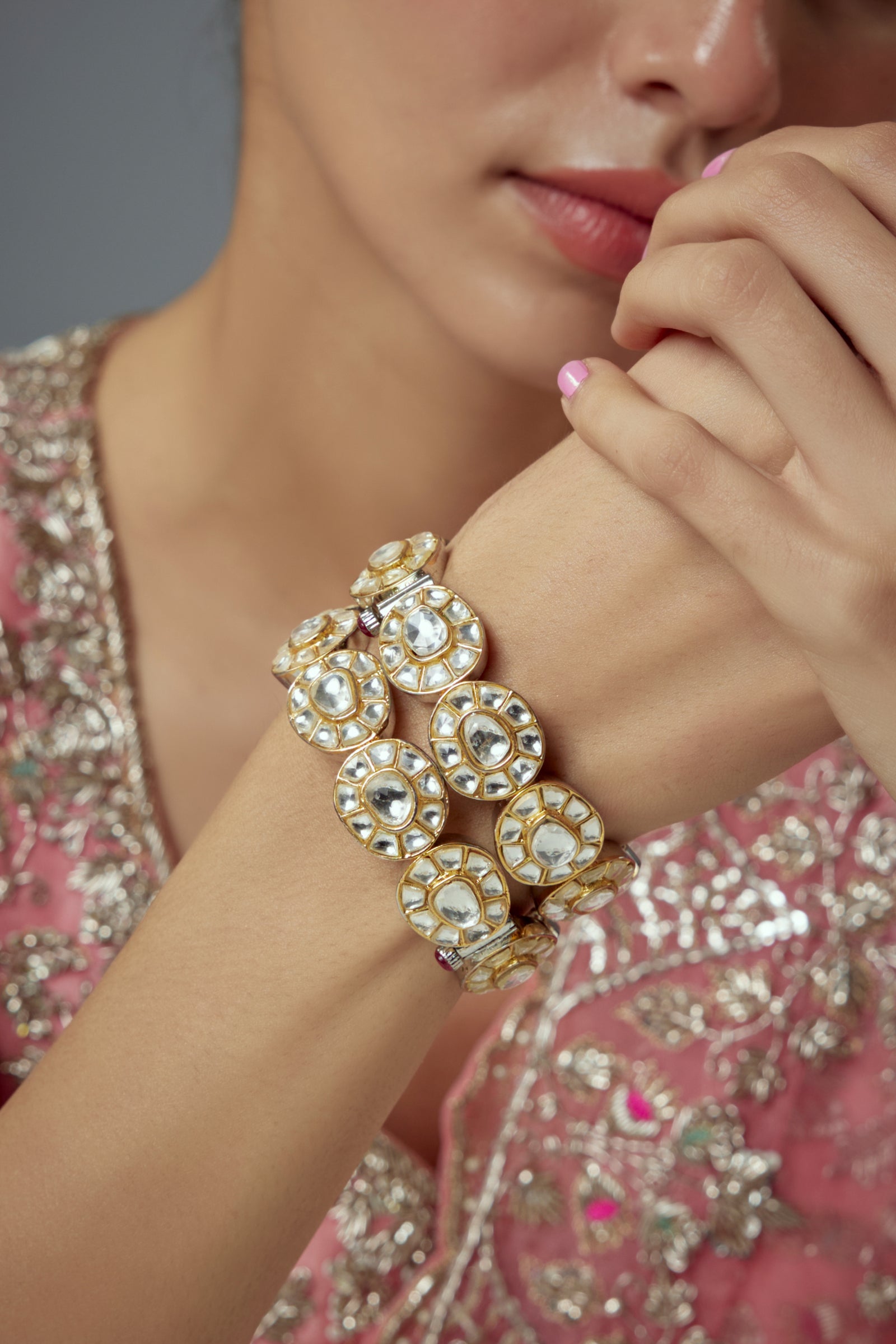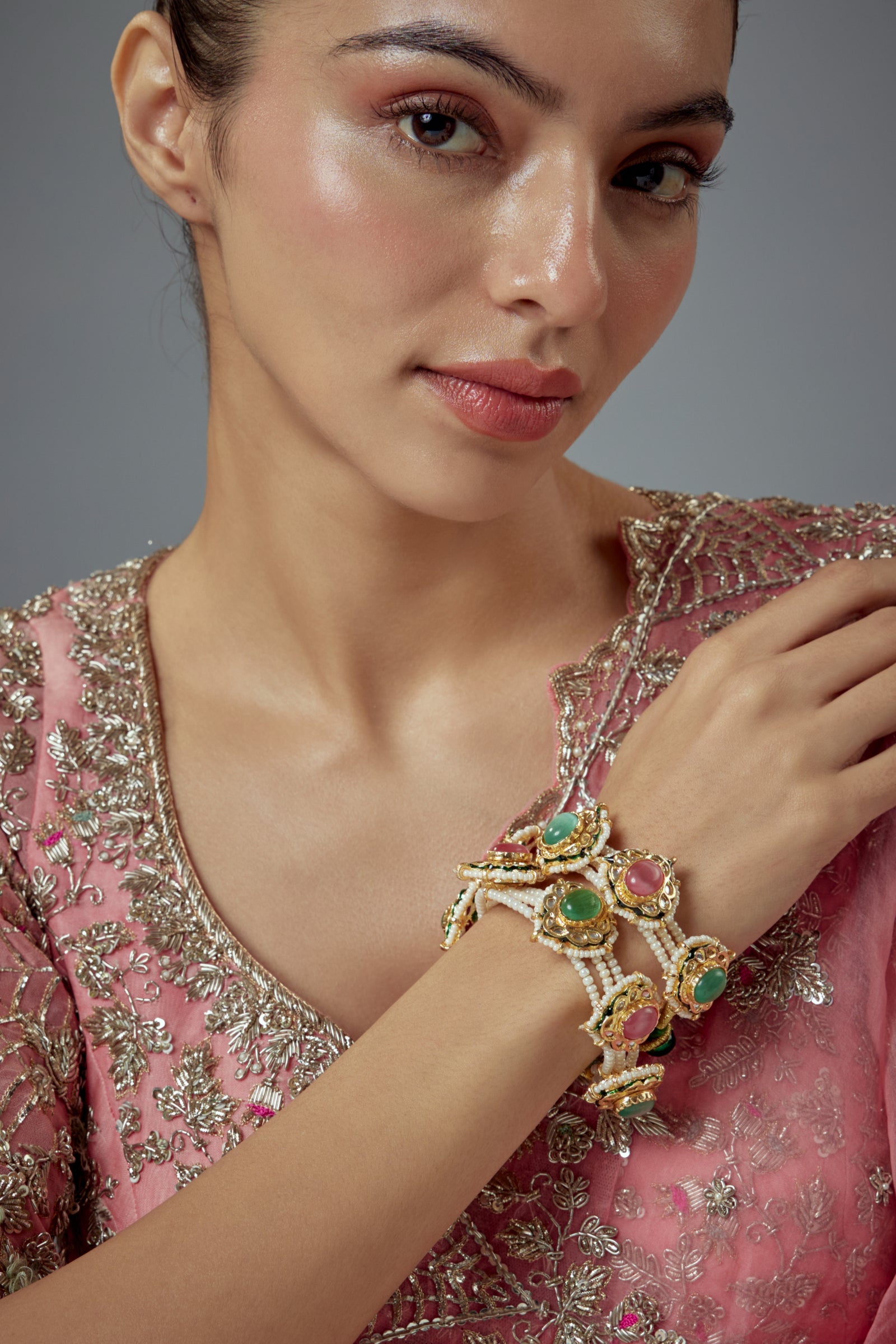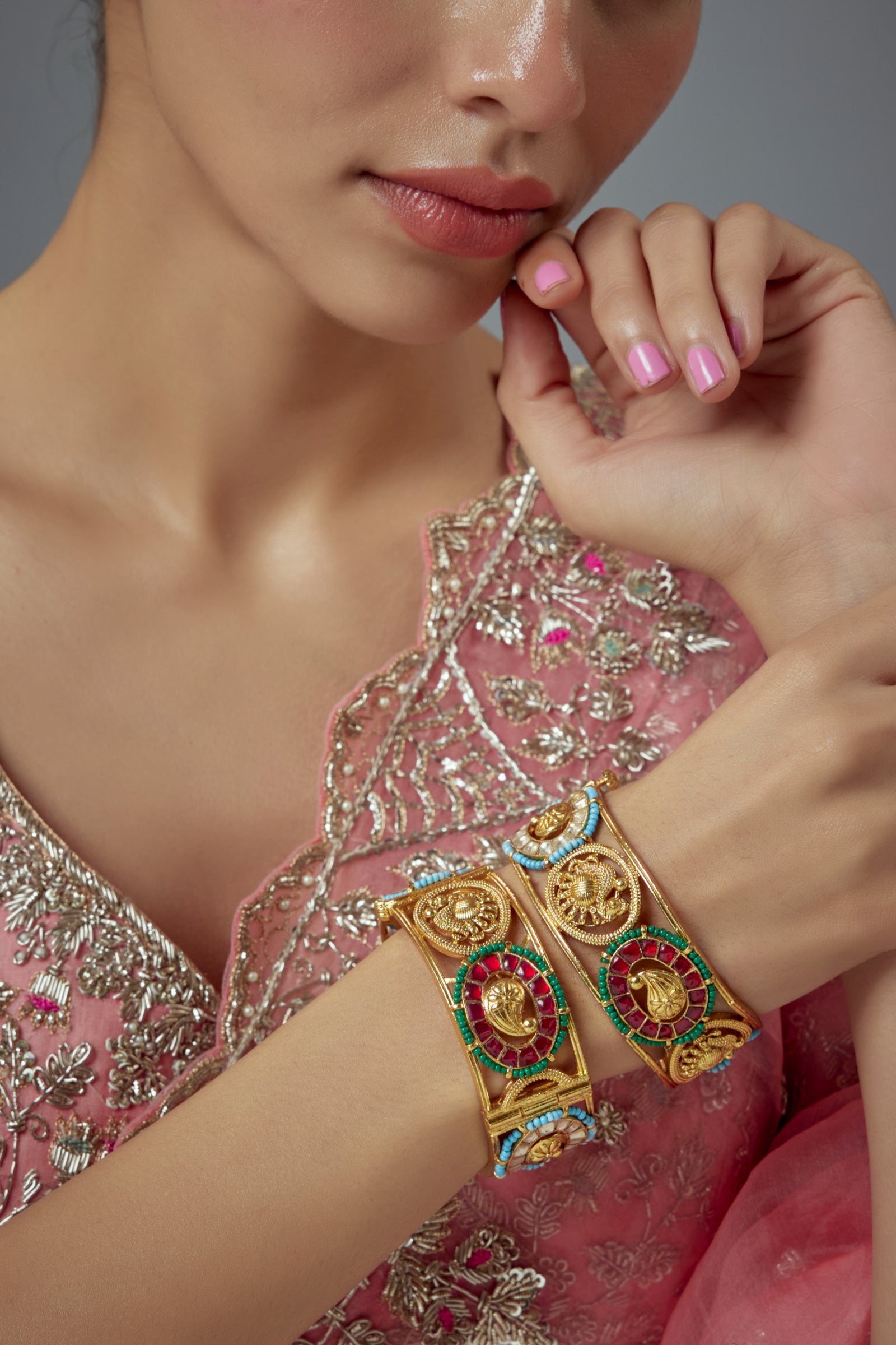 • A delicate gold-toned nath featuring an intricate floral motif with kundan embellishments & a dainty pearl chain attachment. Perfect for weddings & festive occasions, blending tradition with elegance.