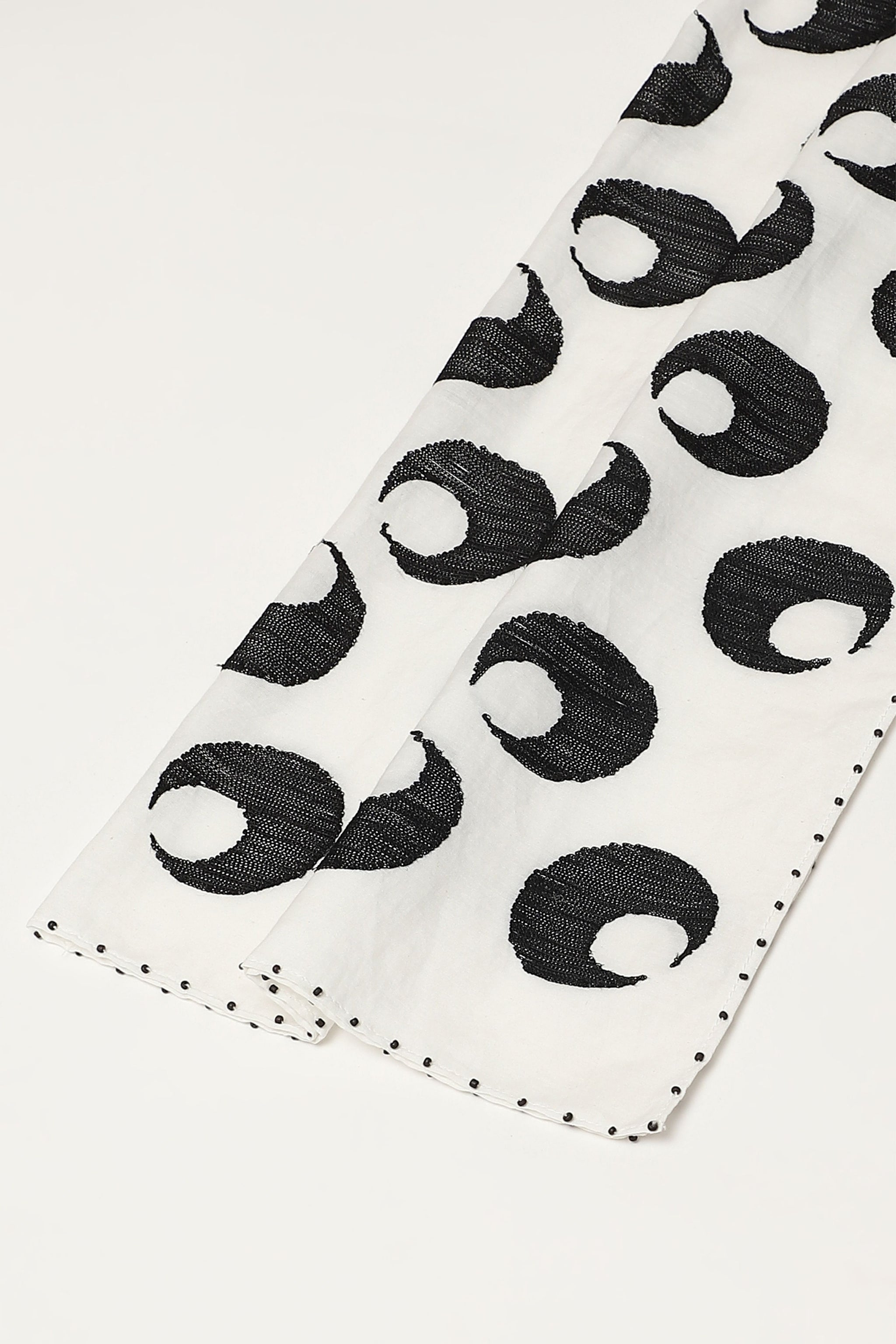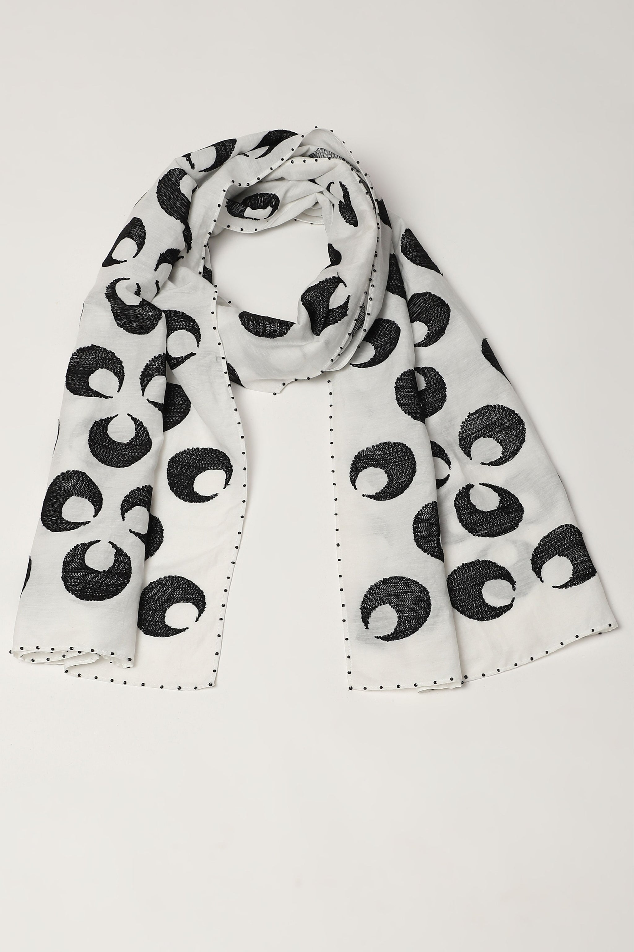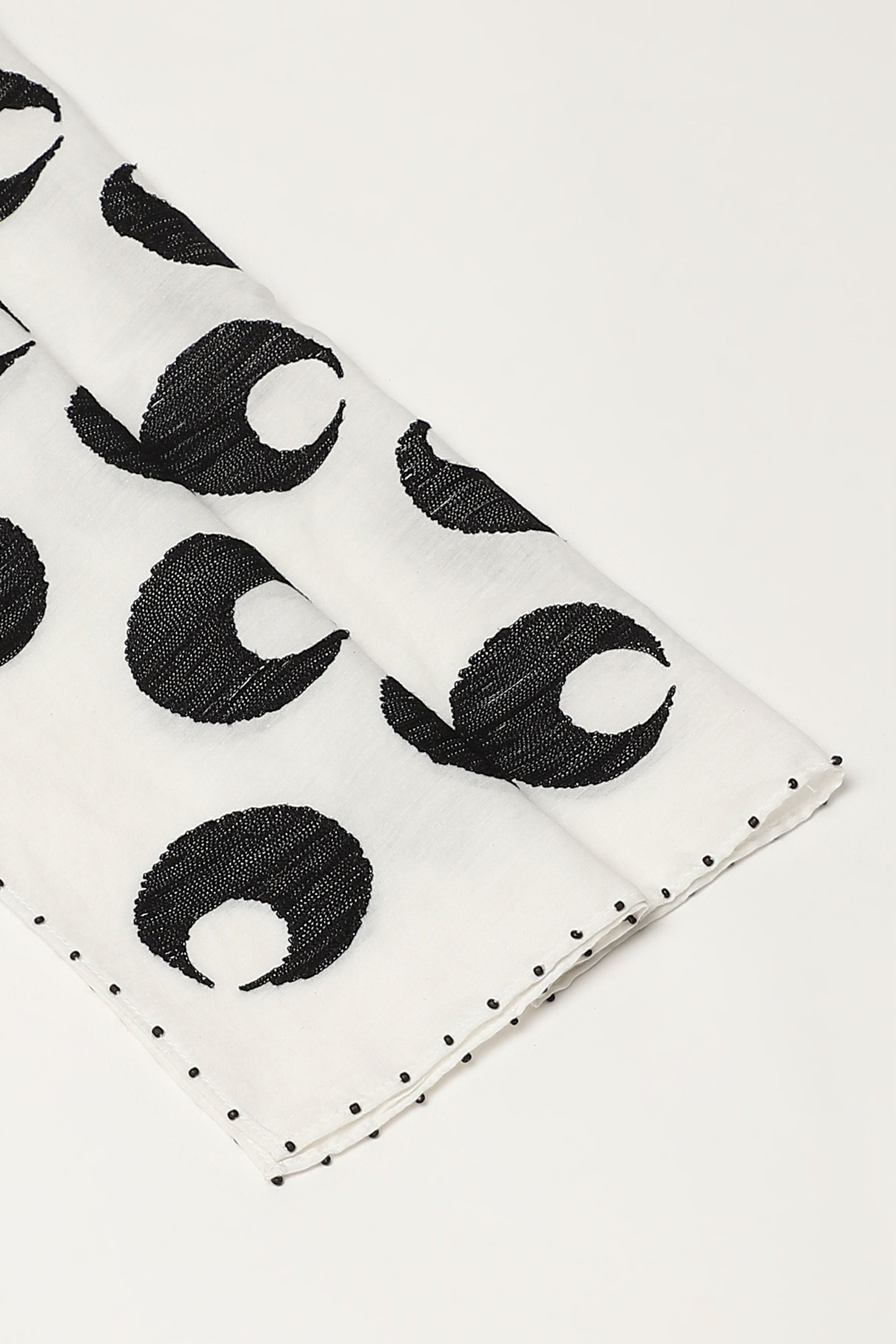 • The turkish moon, embroidered with silk on an ivory scarf. Crafted in a blend of silk and cotton, the crescent moon motifs on this creation are crewel embroidered with silk yarn.