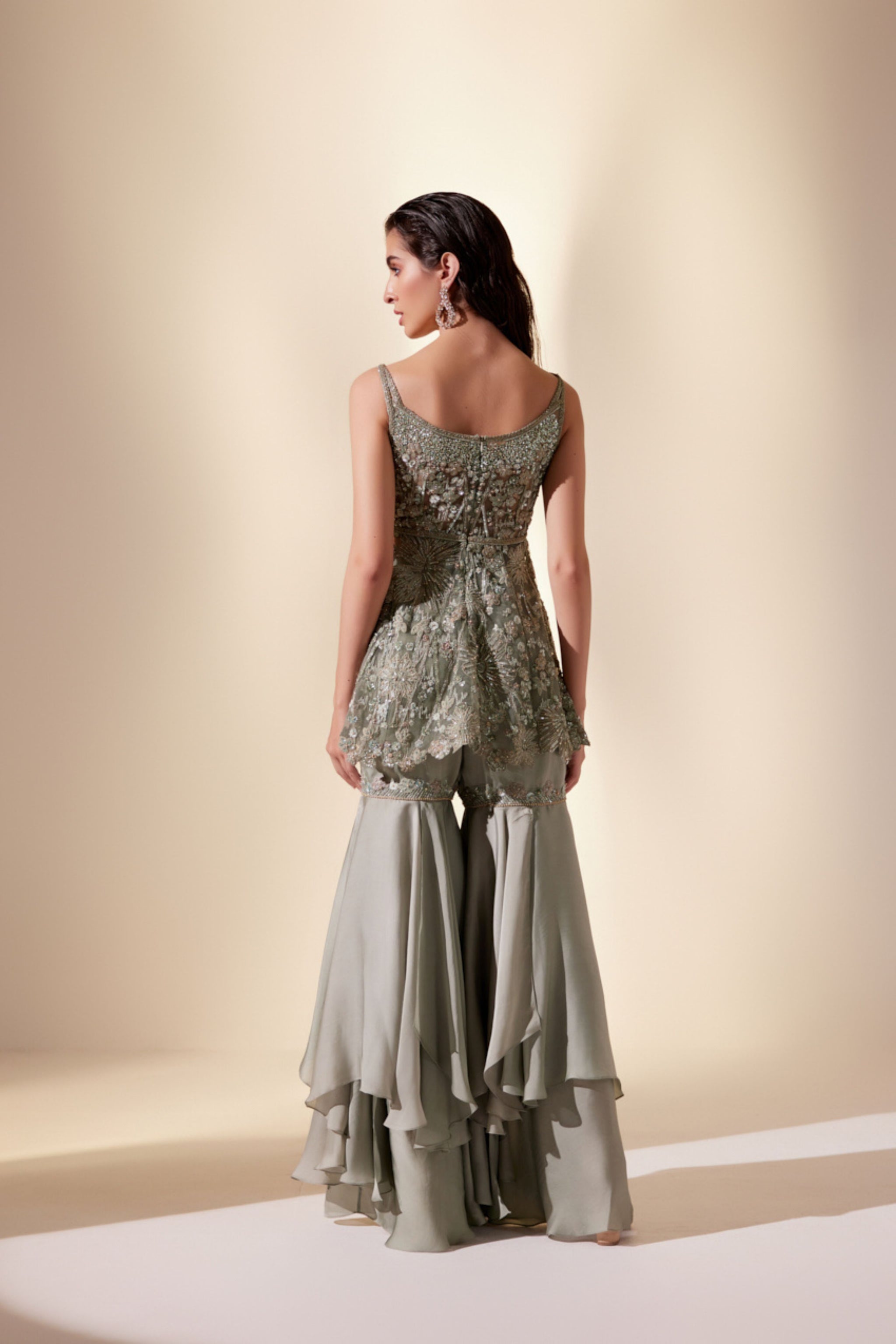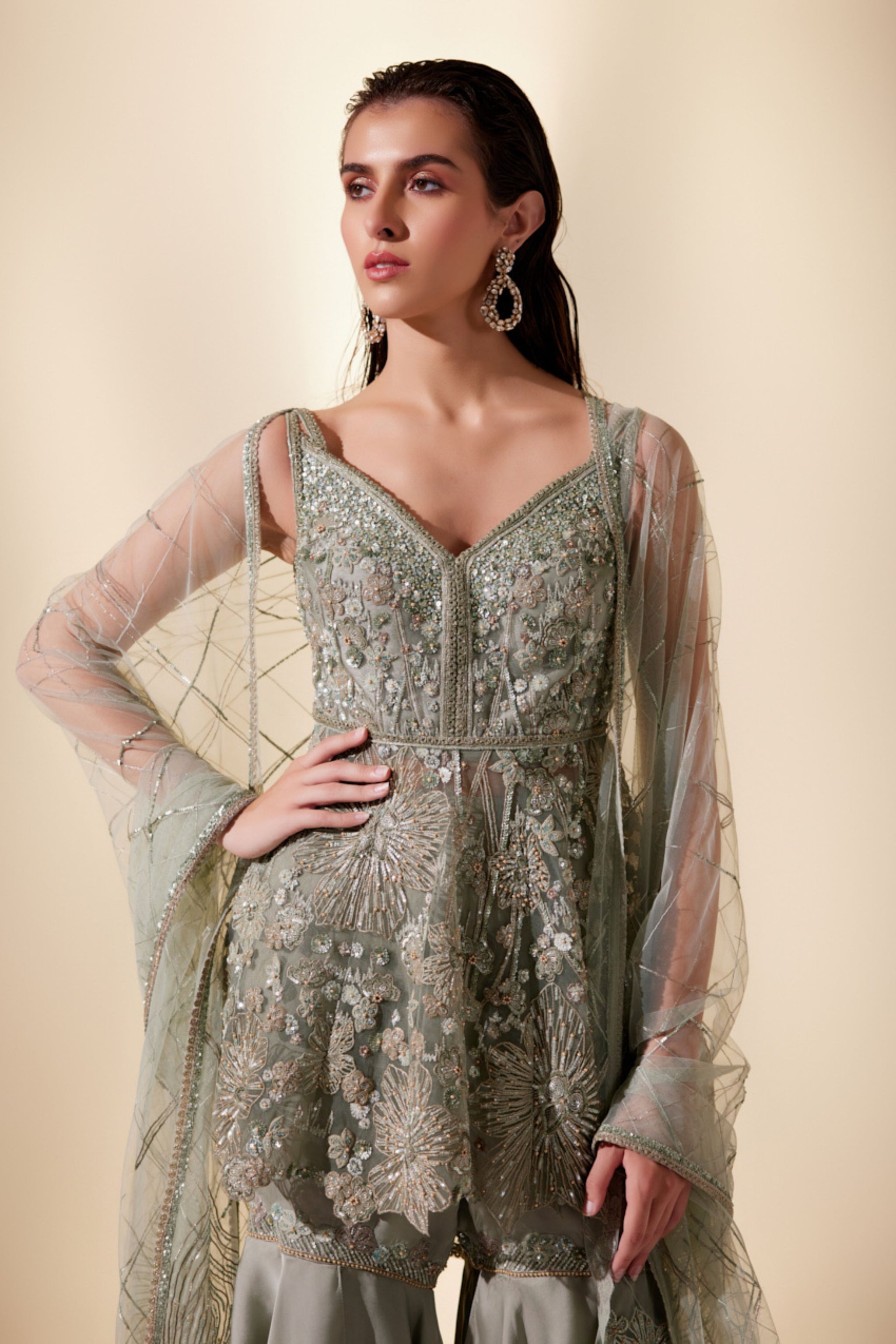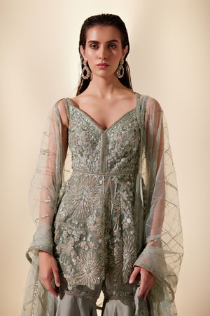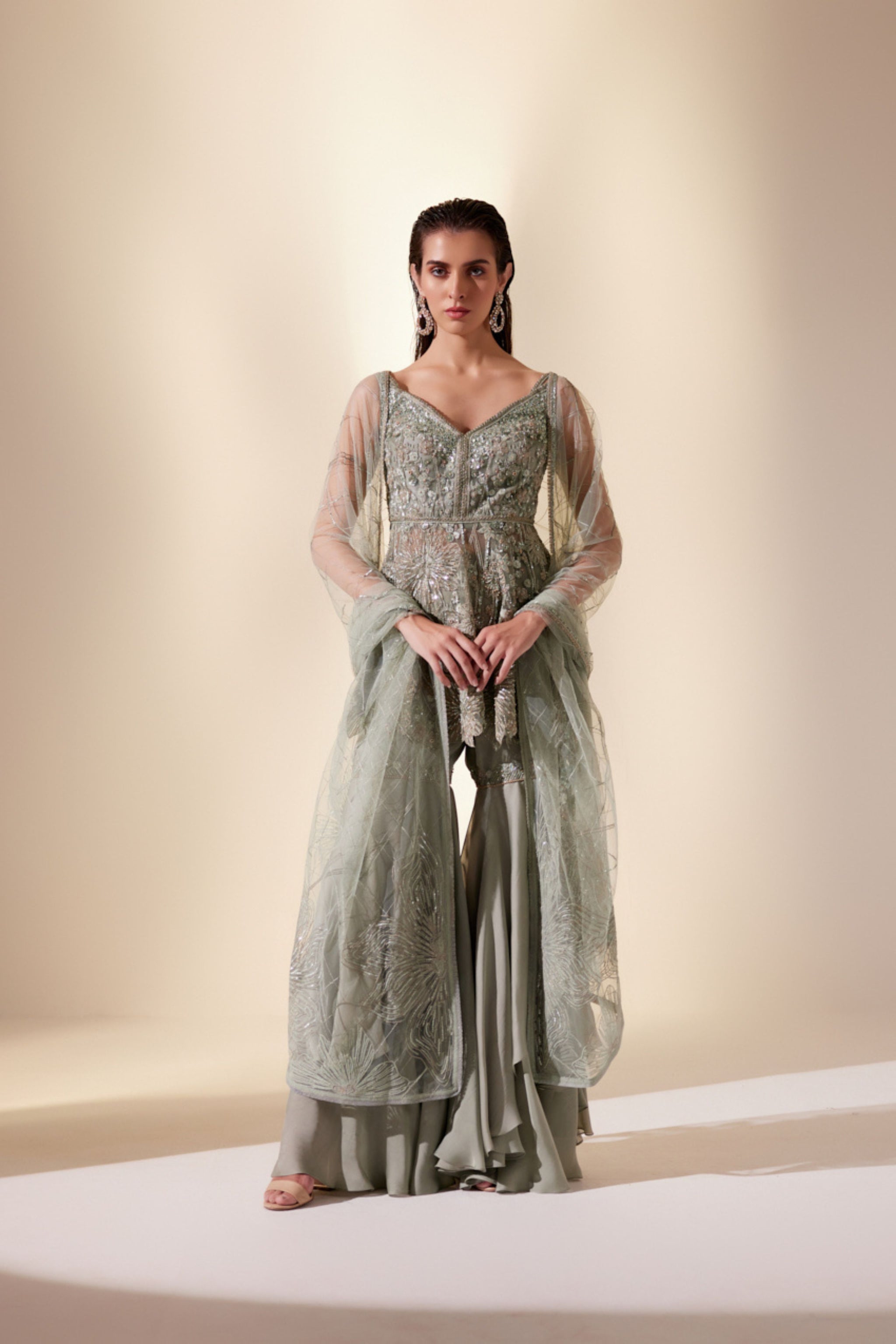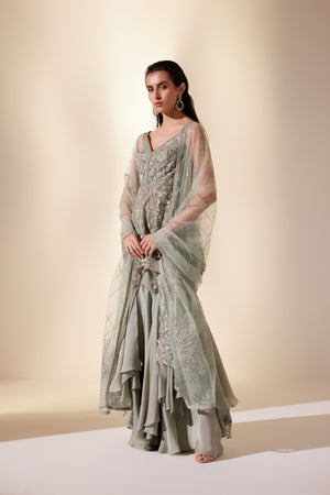 • Crafted in a soft pastel green hue, the embroidered kurta gracefully pairs with a swirl-patterned sharara, blending elegance with contemporary charm.