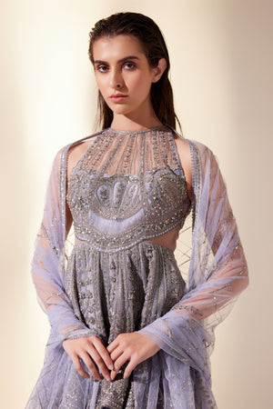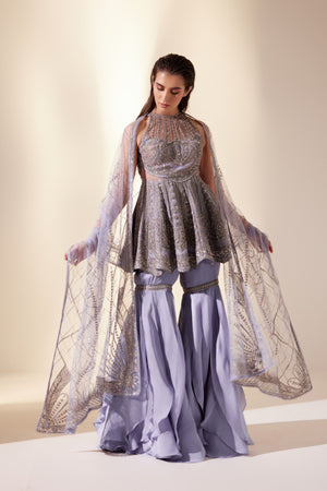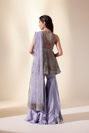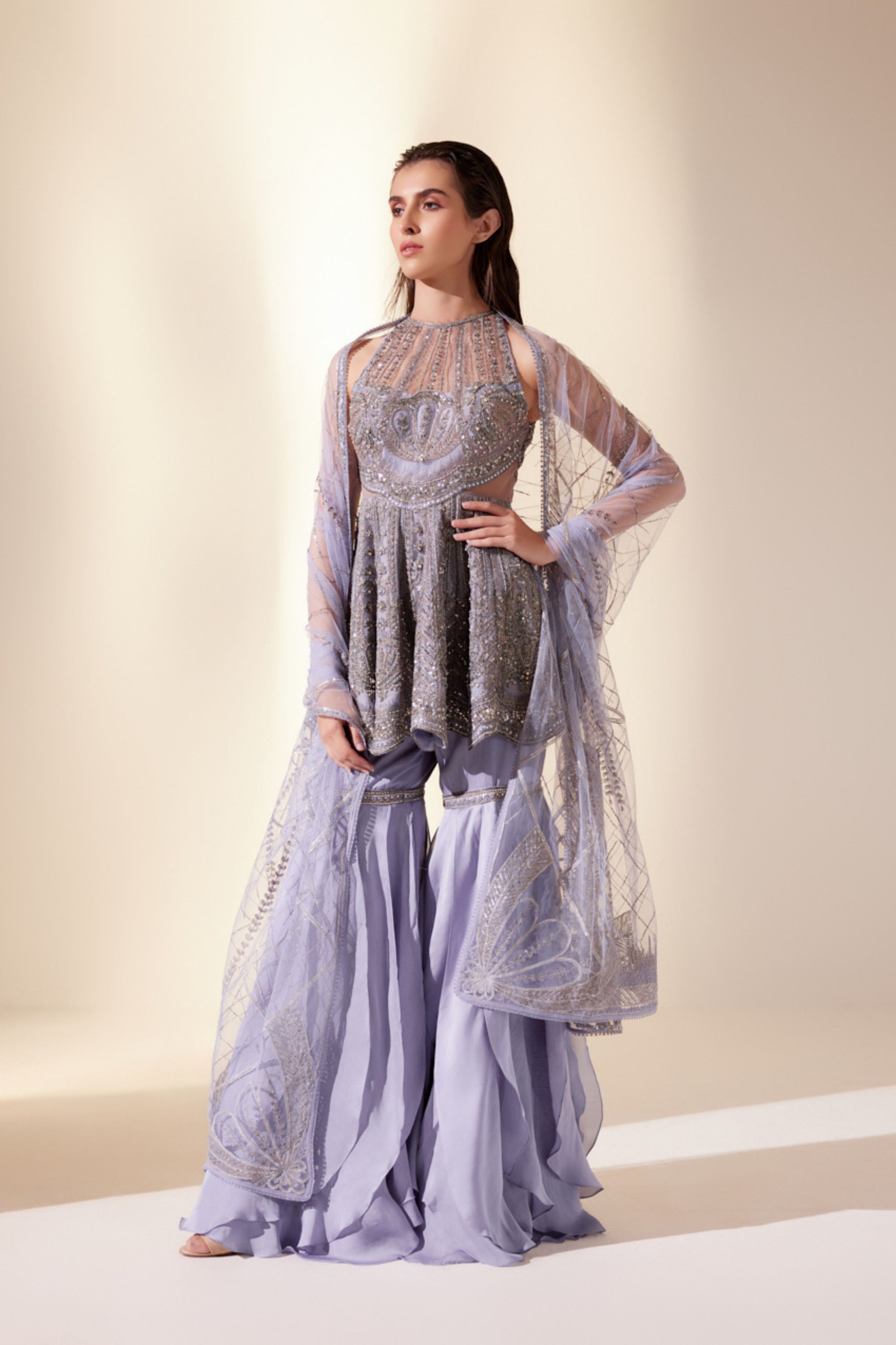 • Crafted in a lilac hue embroidered kurta paired with swirl pattern sharara