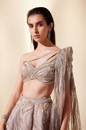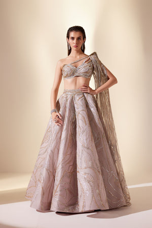 • The flowing lehenga, paired with a matching blouse featuring delicate work and corsages on shoulders with brimming dramatic drapes.