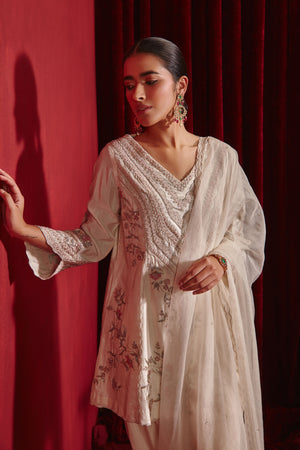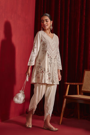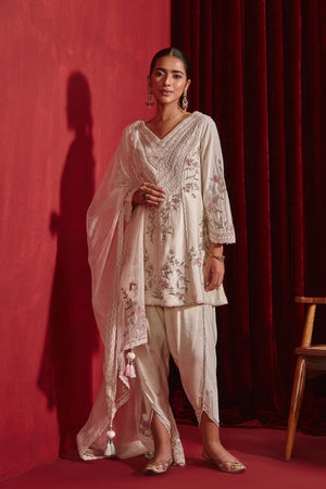 • Intricately embroidered short kurta, paired with a lace embellished dhoti and delicately embroidered dupatta