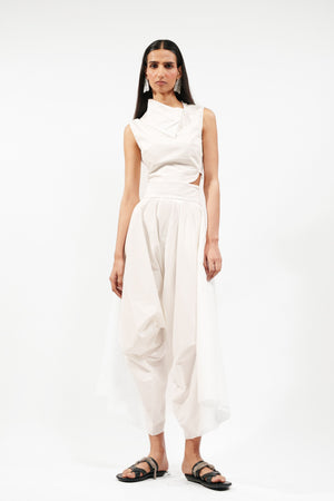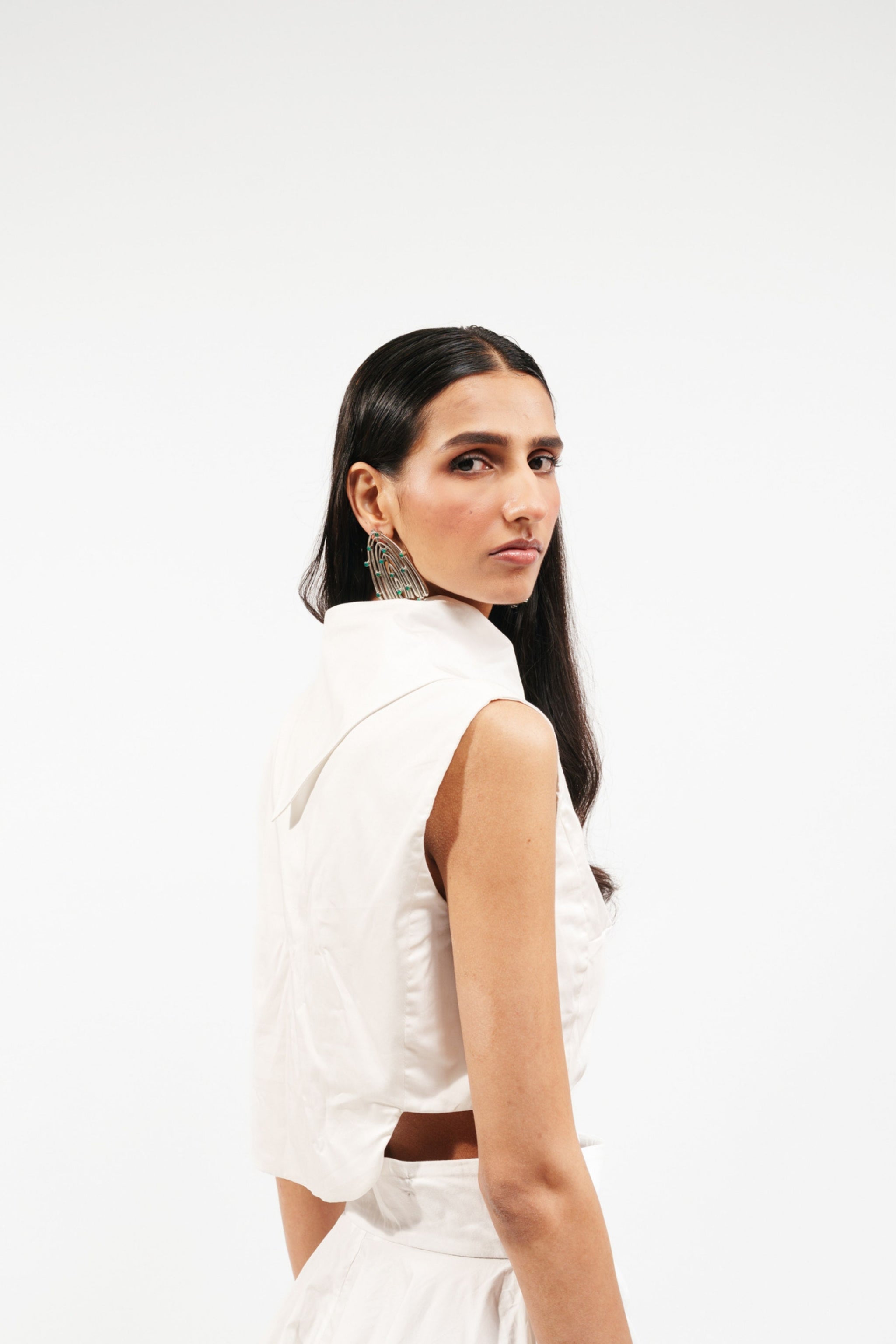 • A structured high-collar top paired with fluid flared trousers, redefining power dressing.