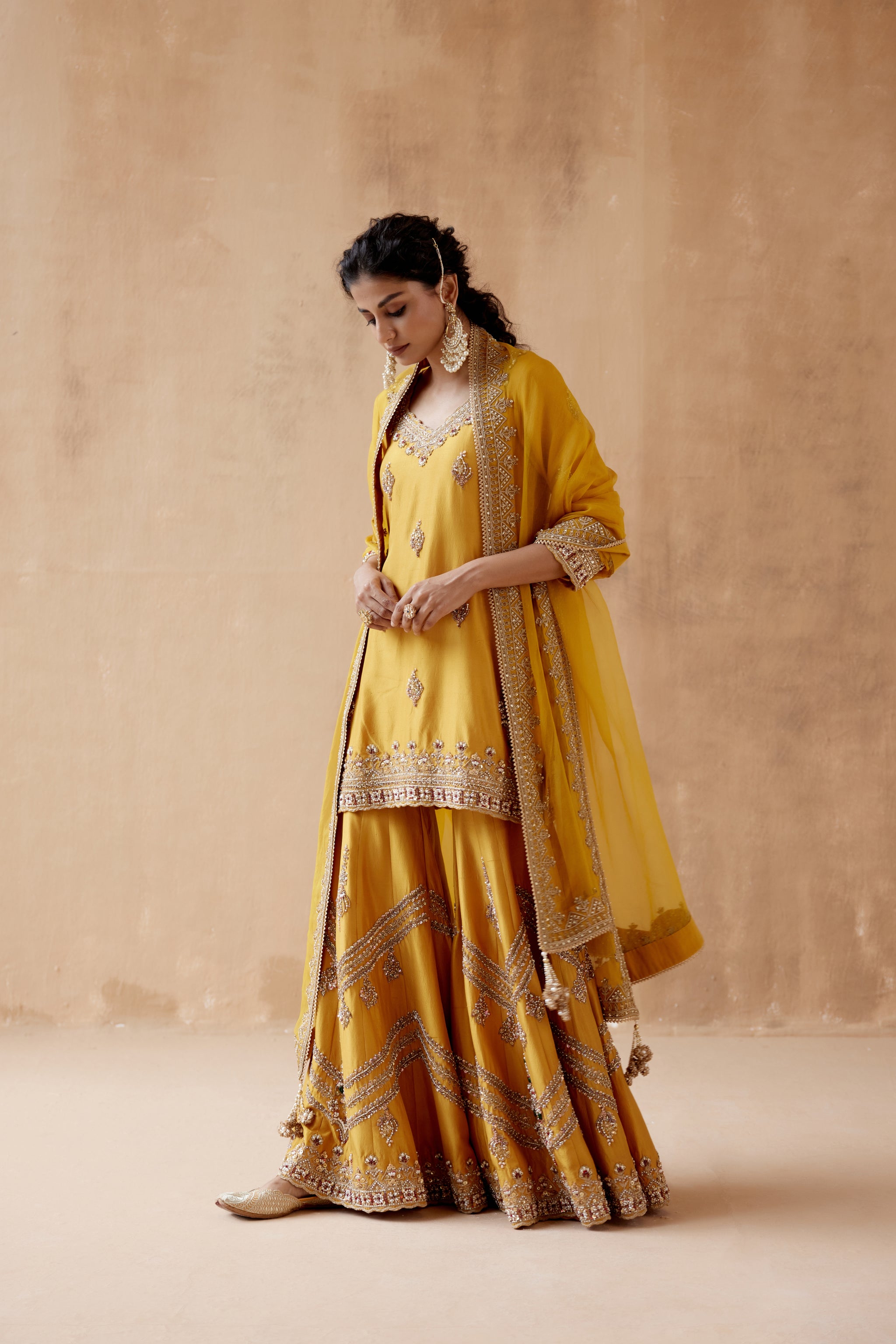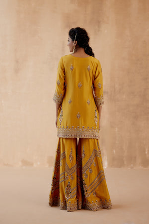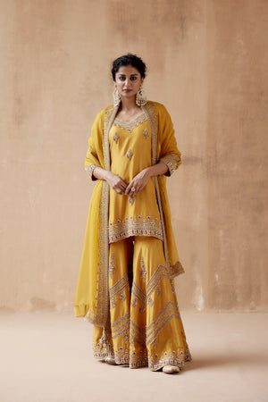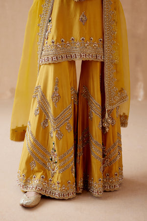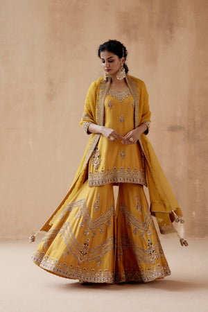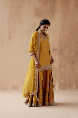 • Mustard kurta sharara with gold floral thread embroidery highlighted with various embellishments. Paired with embroidered dupatta.