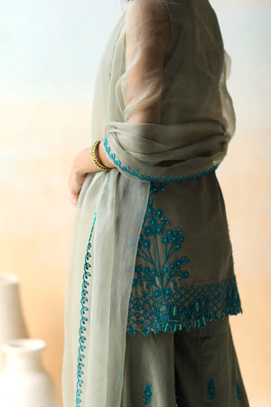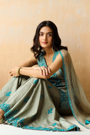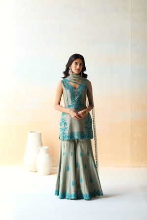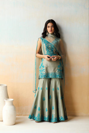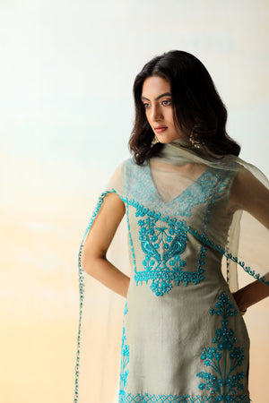 • A sea salt green kurta set with sharara in dupion silk base with turquoise floral thread embroidery highlighted with sequins, cut dana and various other embellishments. It is paired with an embroidered organza dupatta.