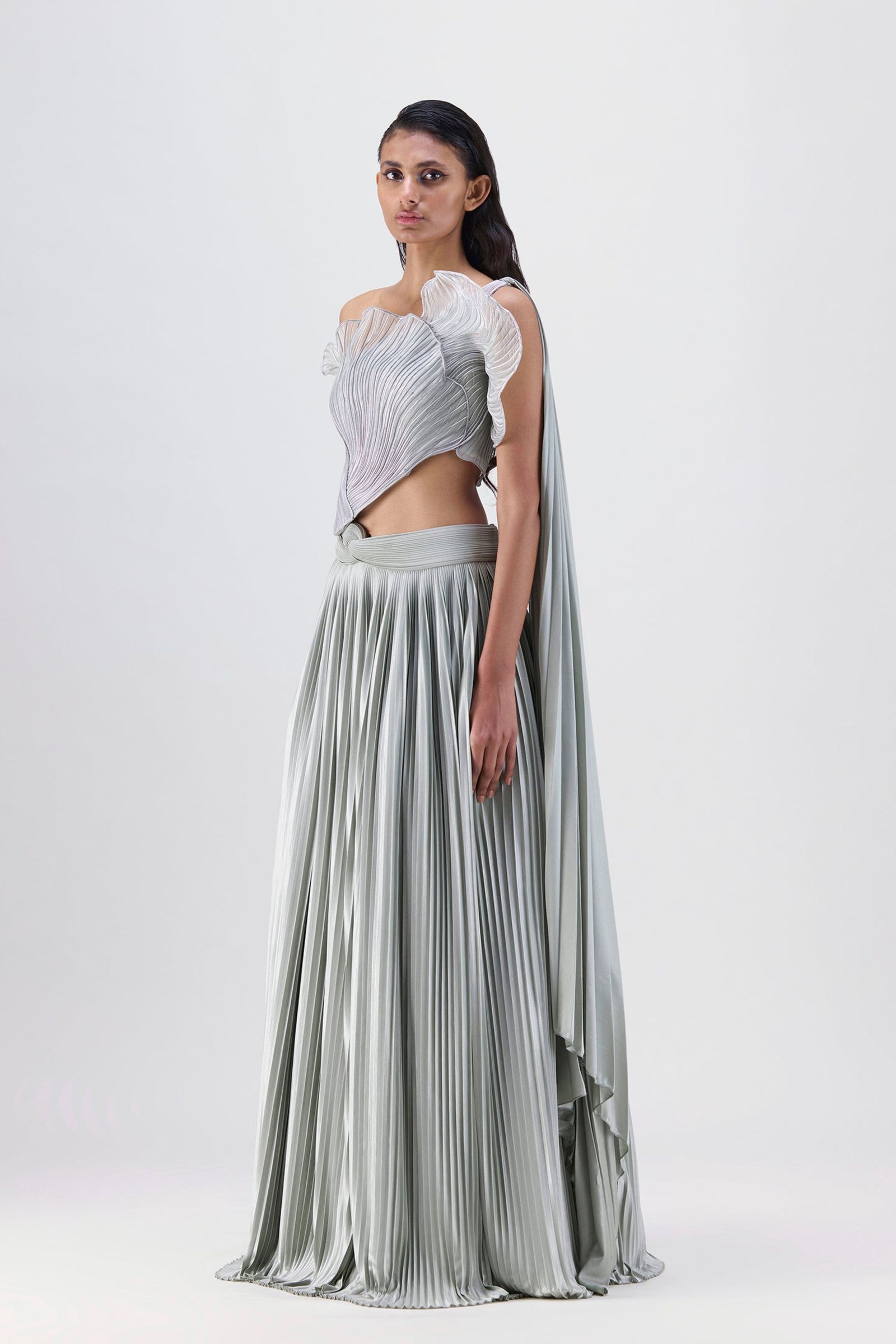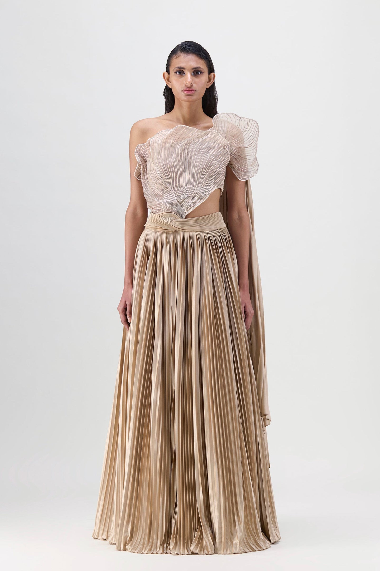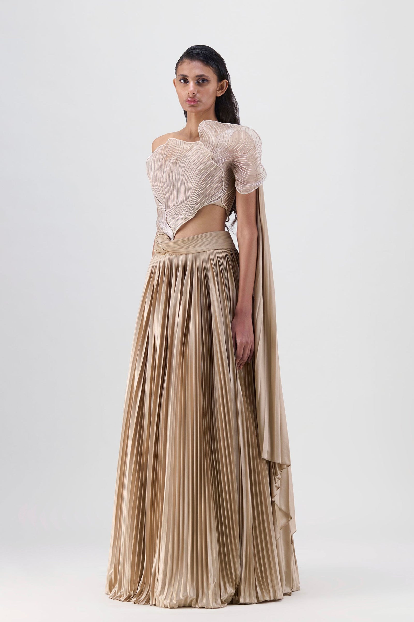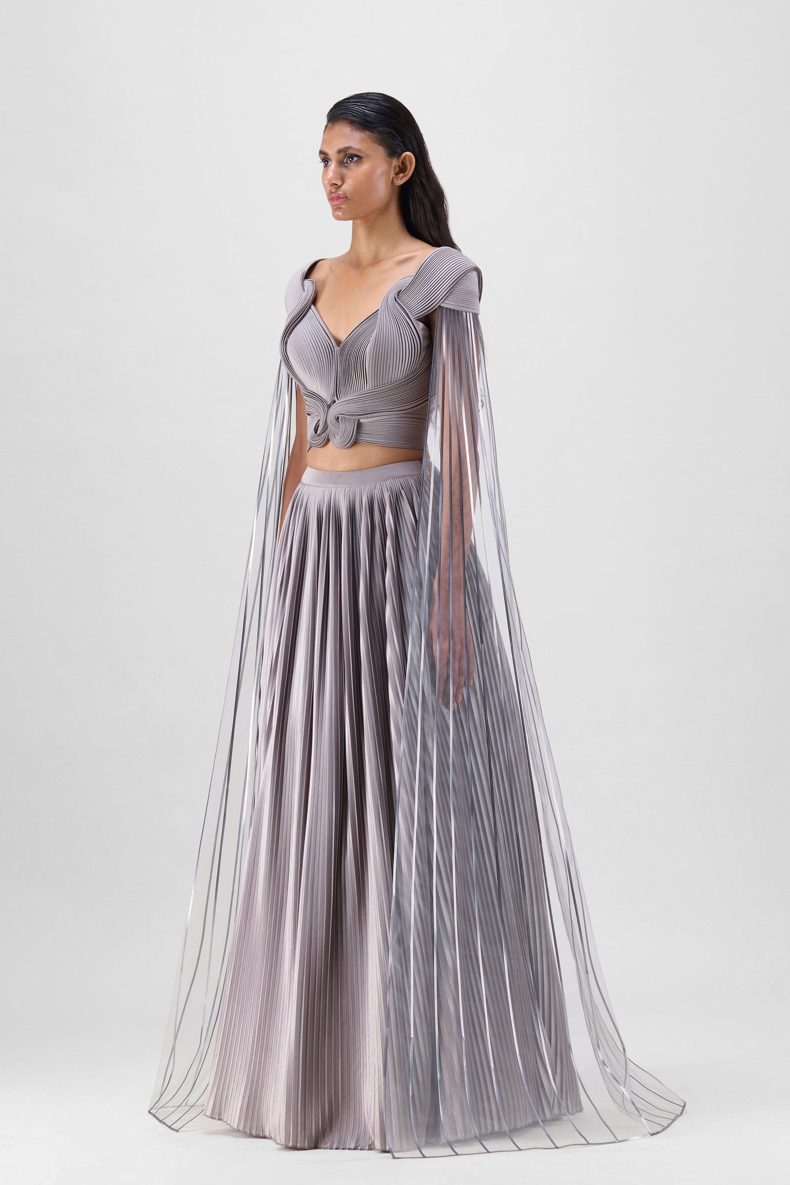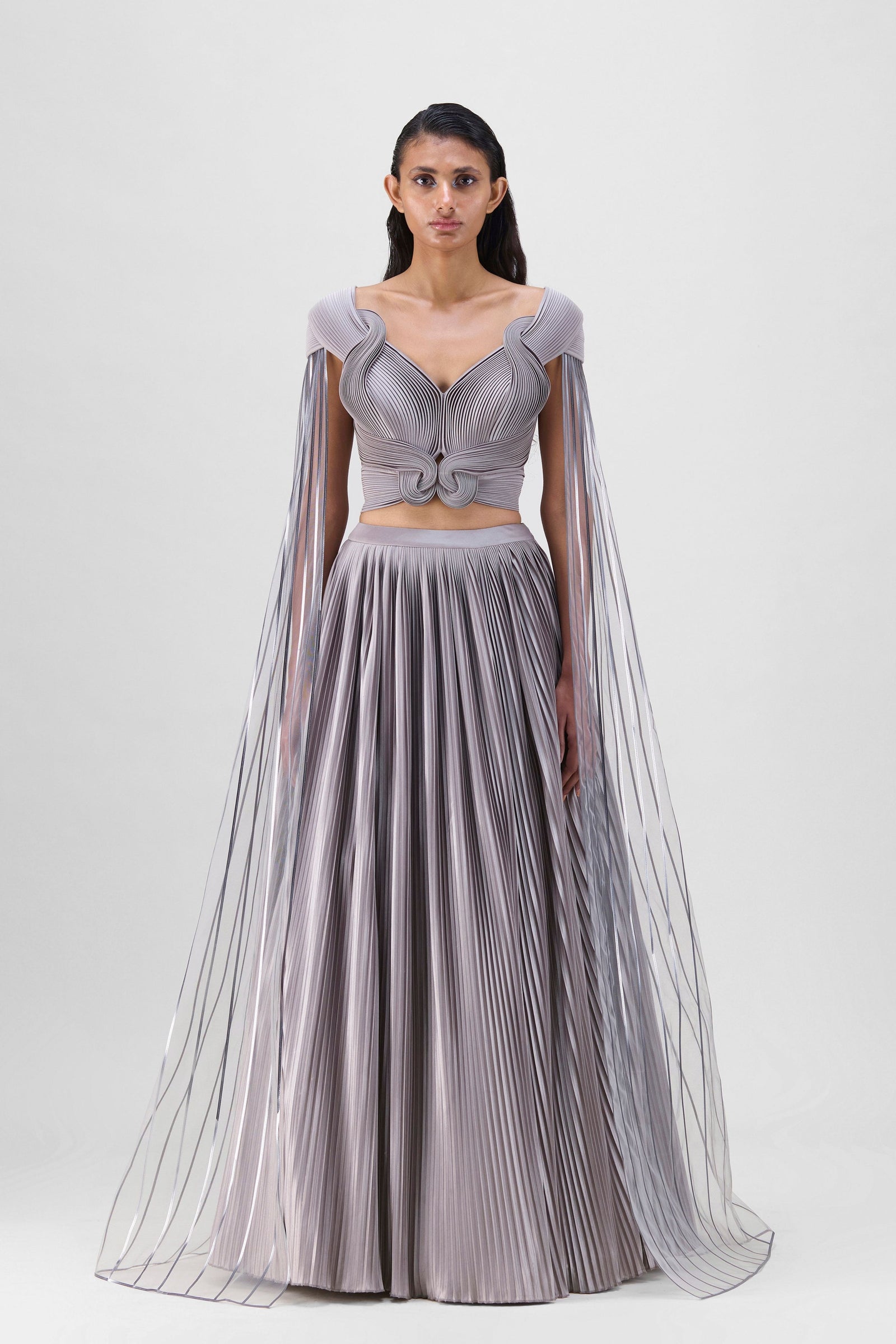 • Strata micro pleated structured bustier with plisse skirt and palla