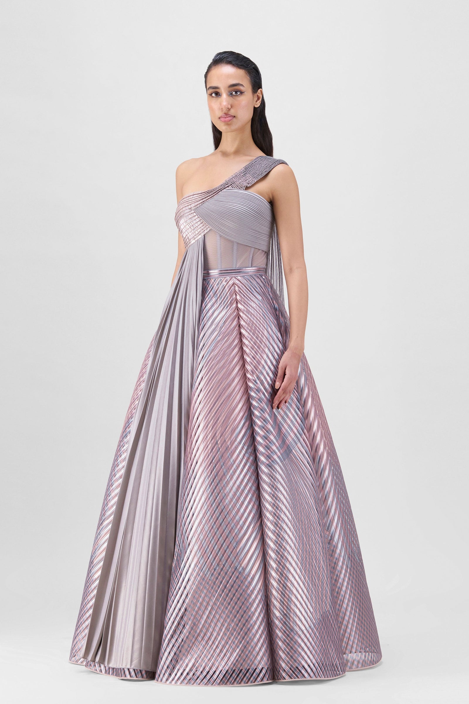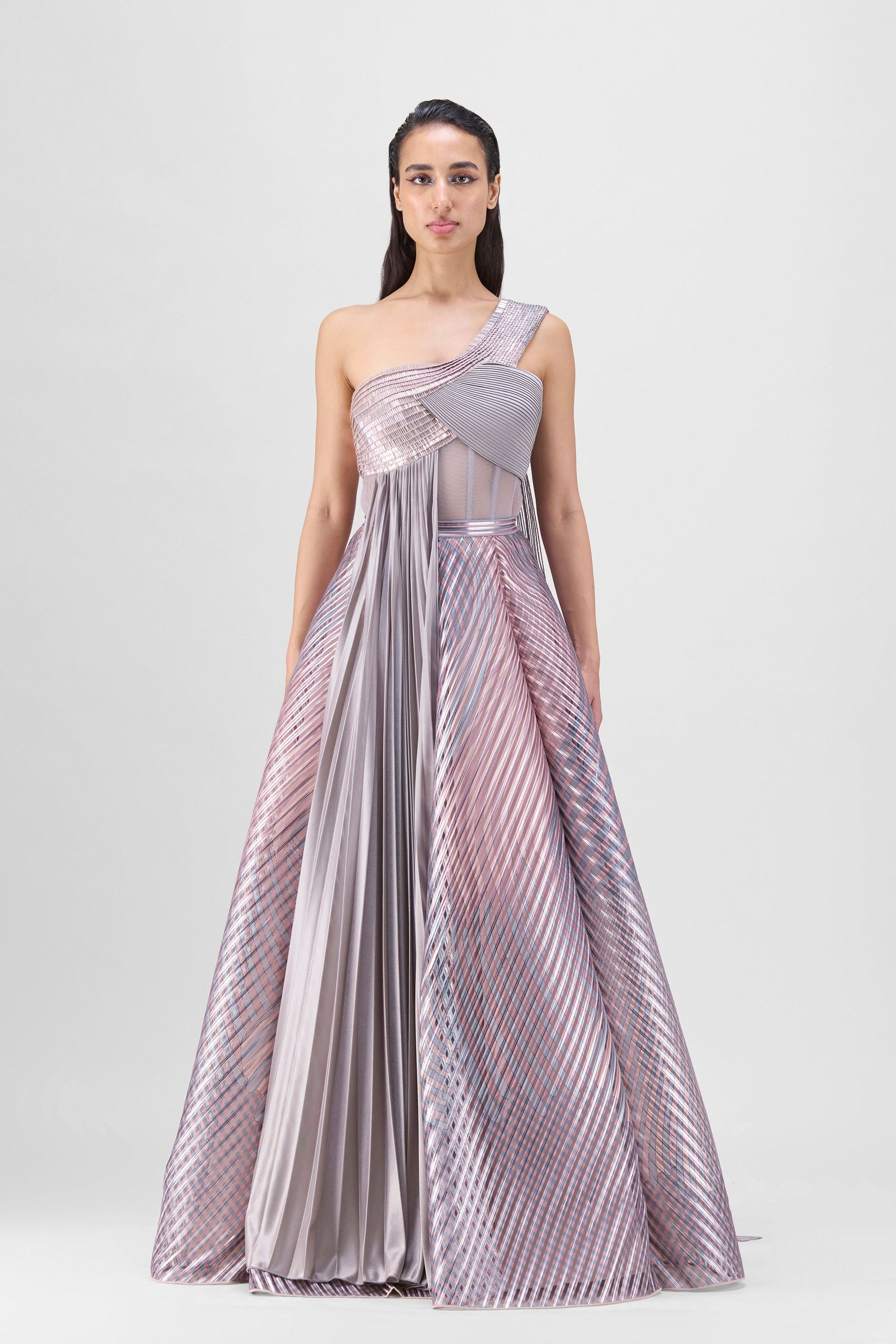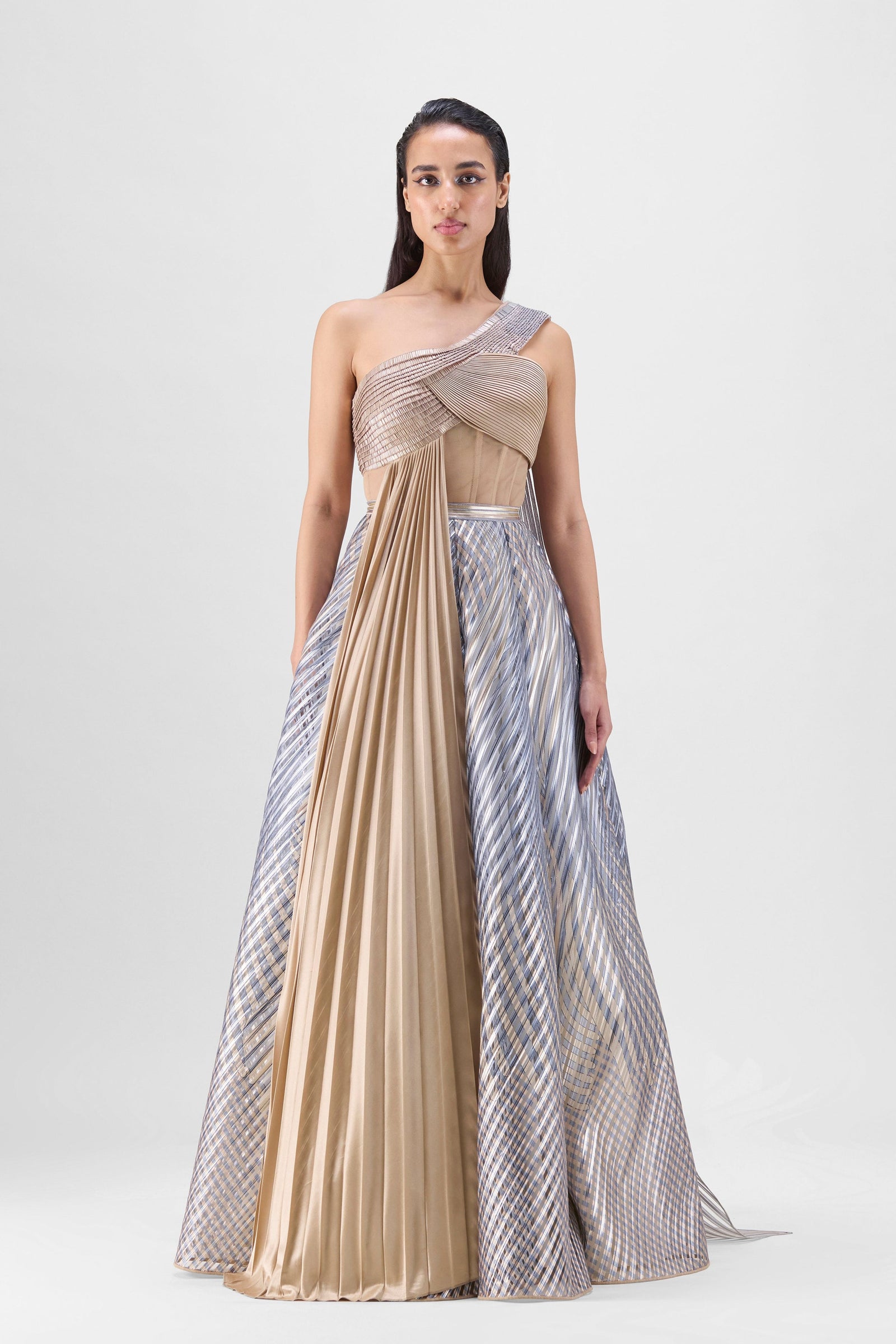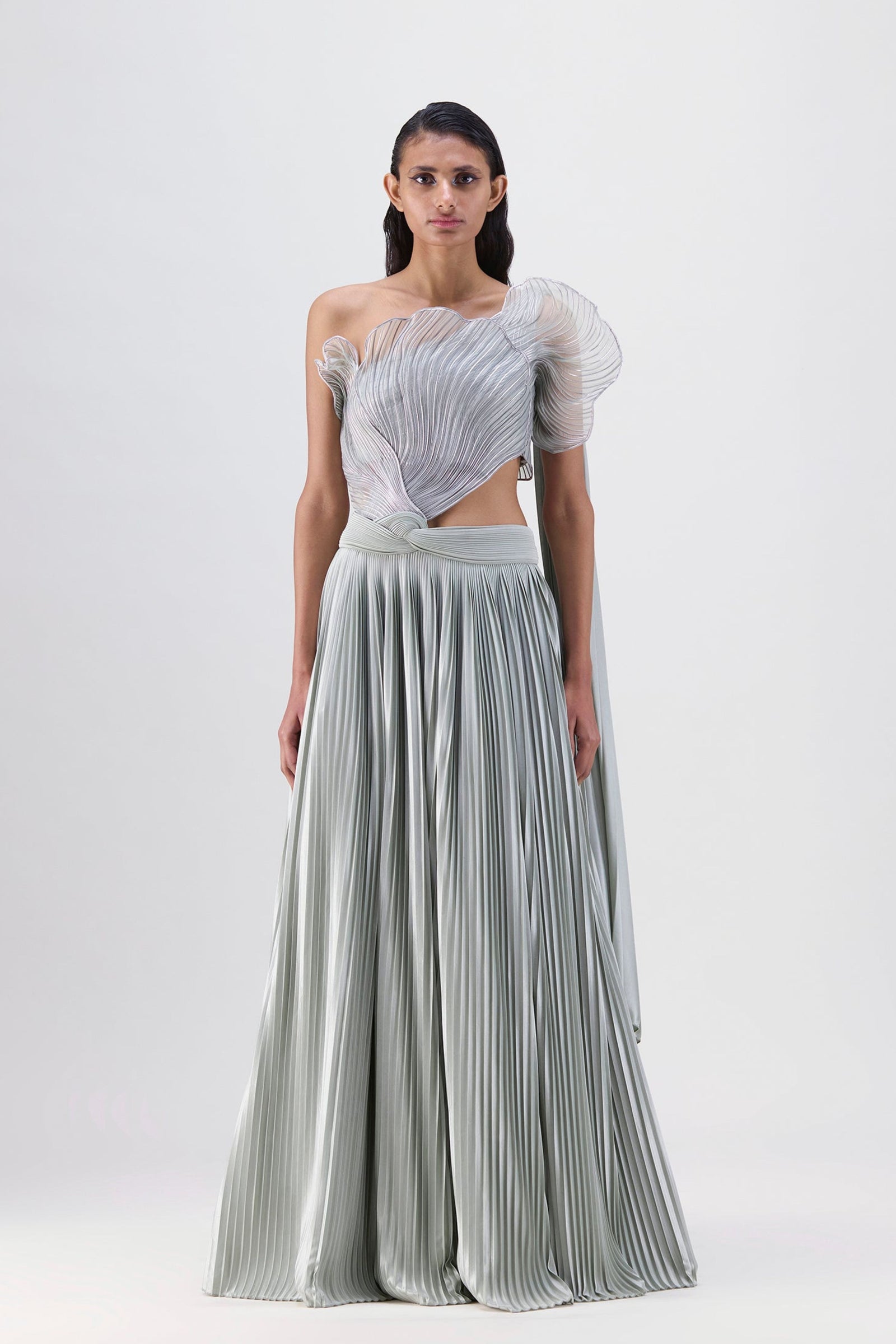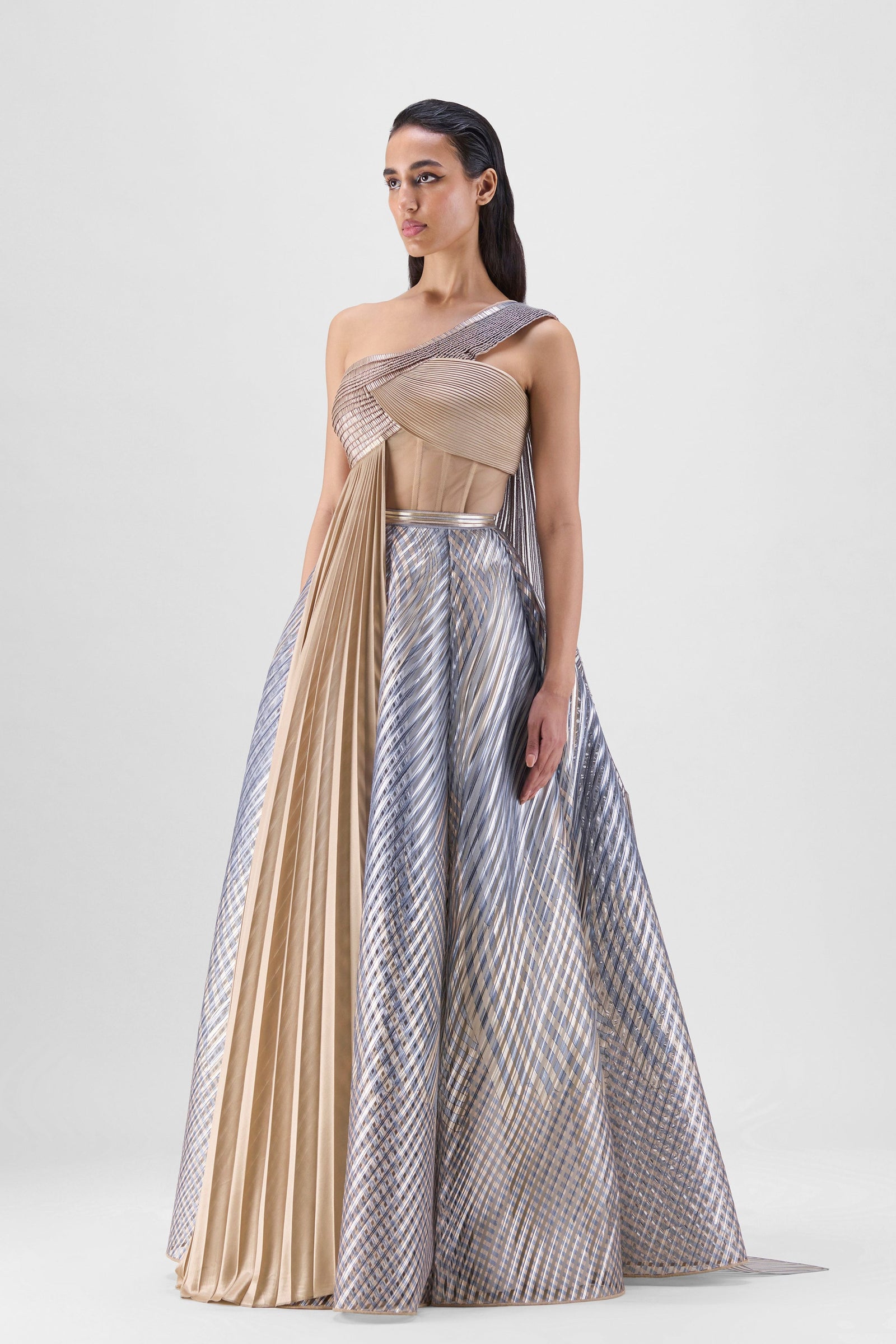 • Strata micro pleated structured bustier with plisse skirt and palla