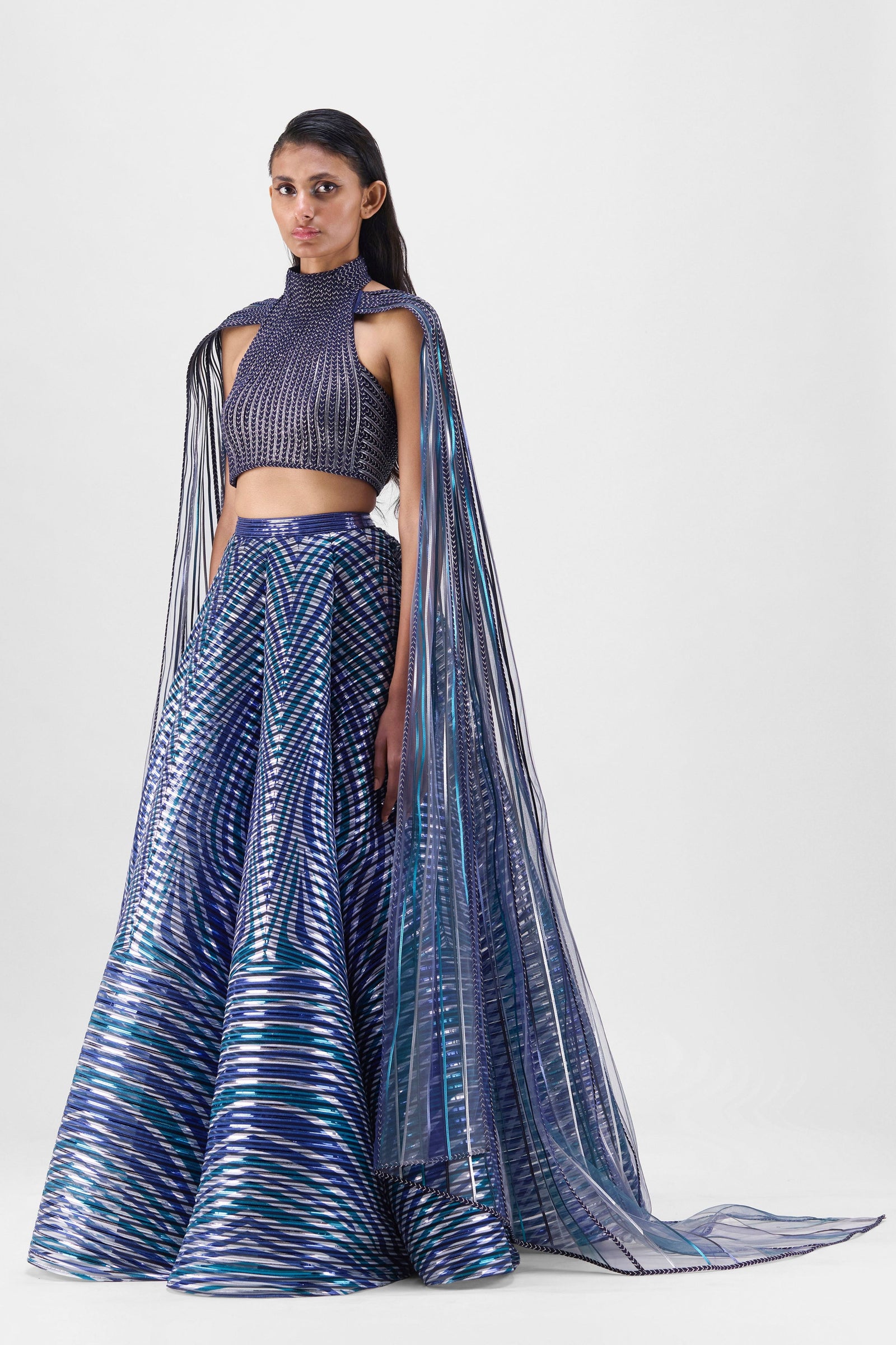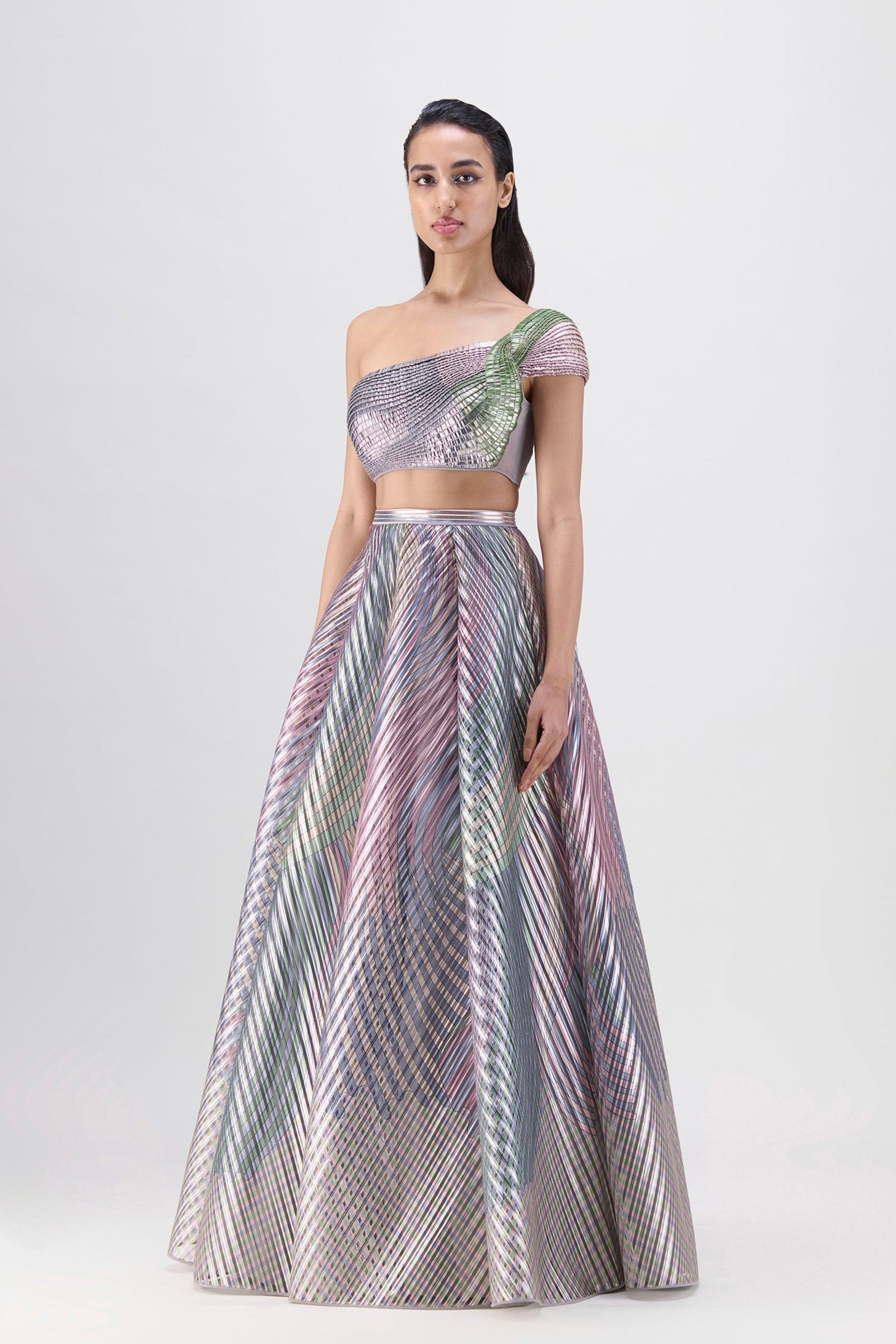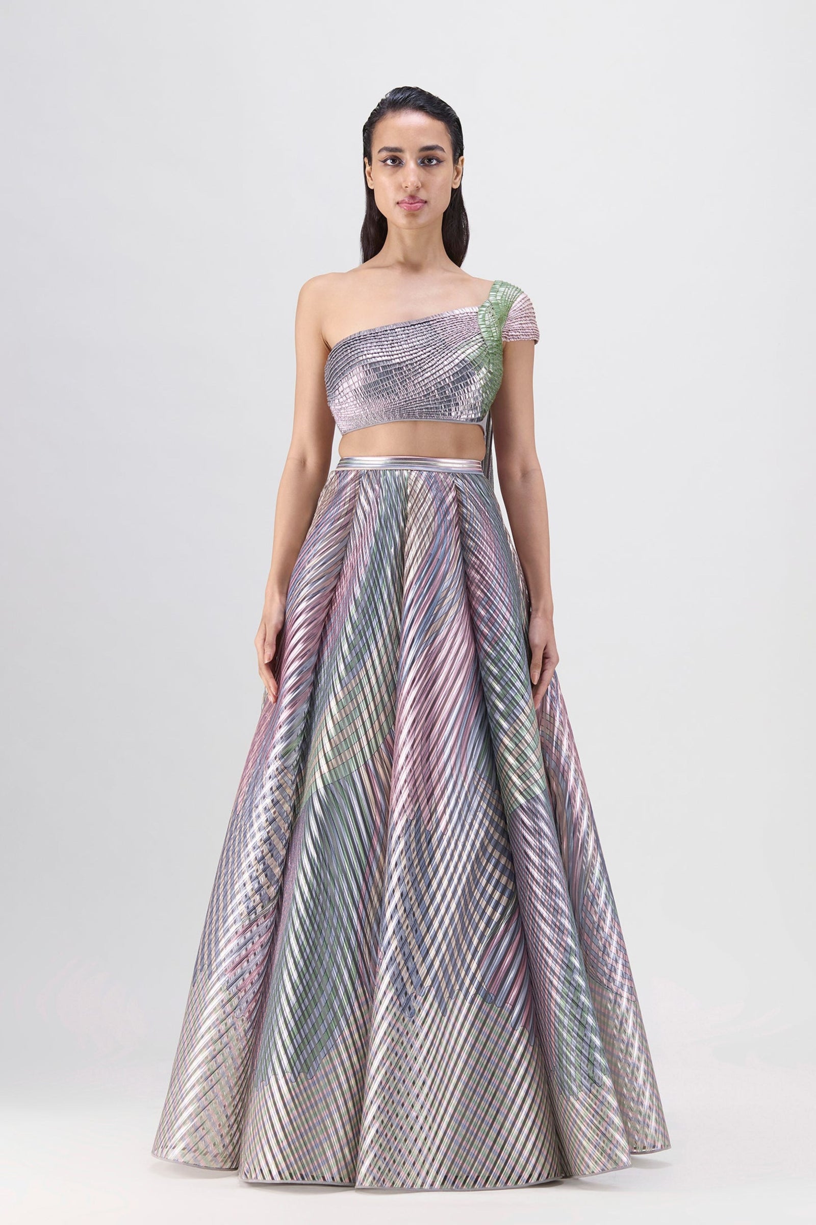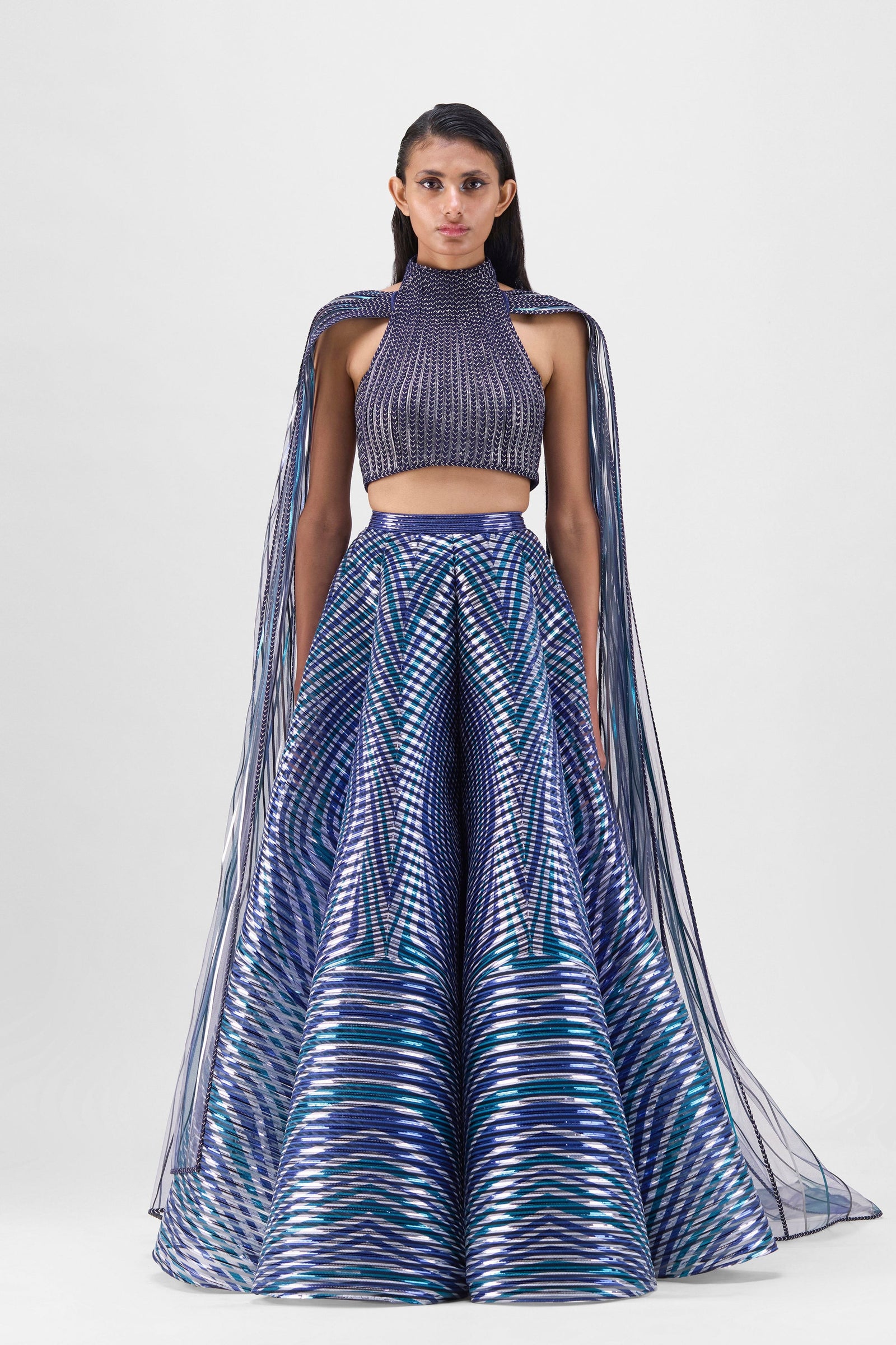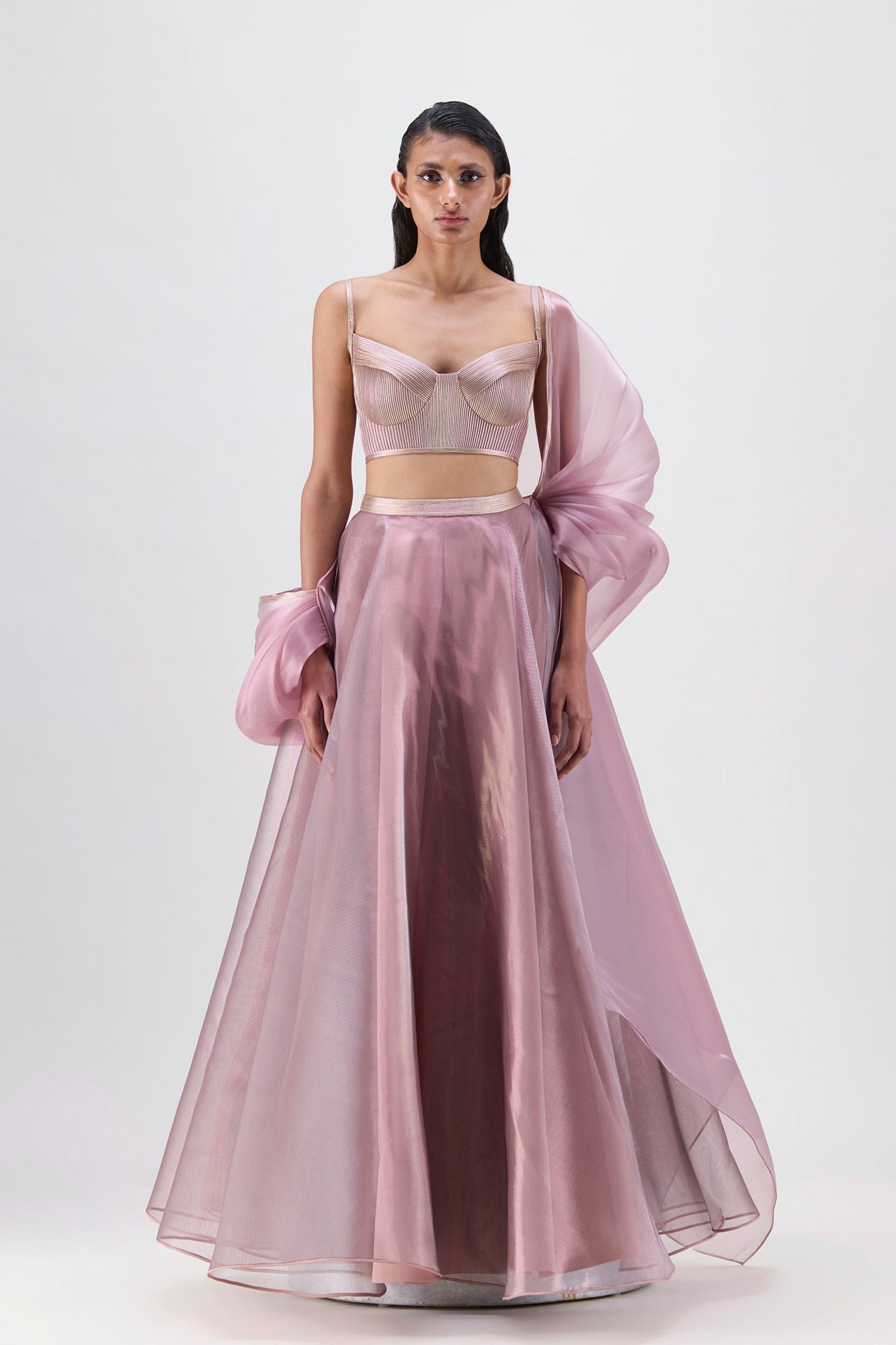 • Strata micro pleated structured bustier with plisse skirt and palla