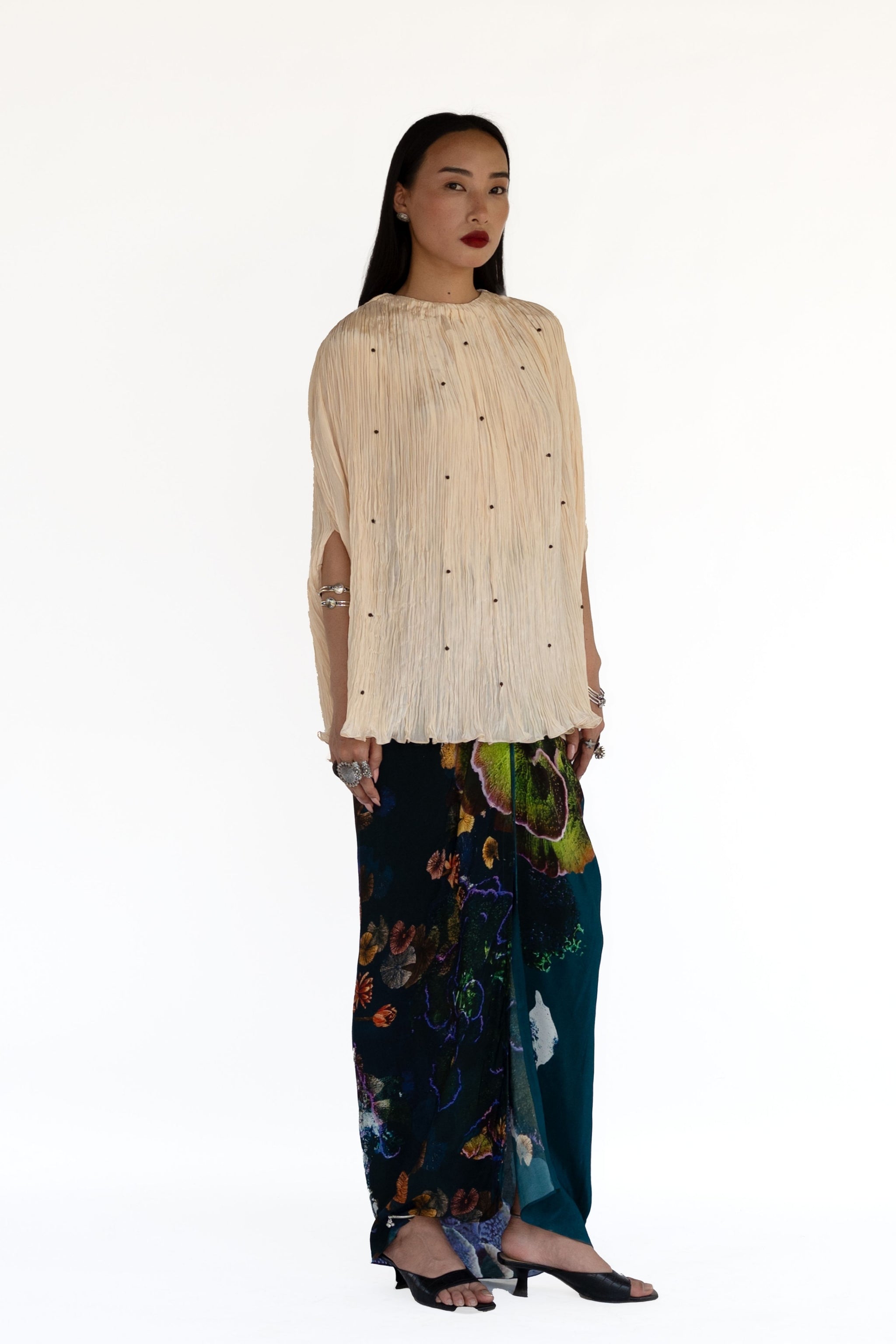 • Suha is creatively pleated blouse top that is paired up with romantic blue skirt, a must have if your style is understated! Top length- 28", Skirt length- 44".