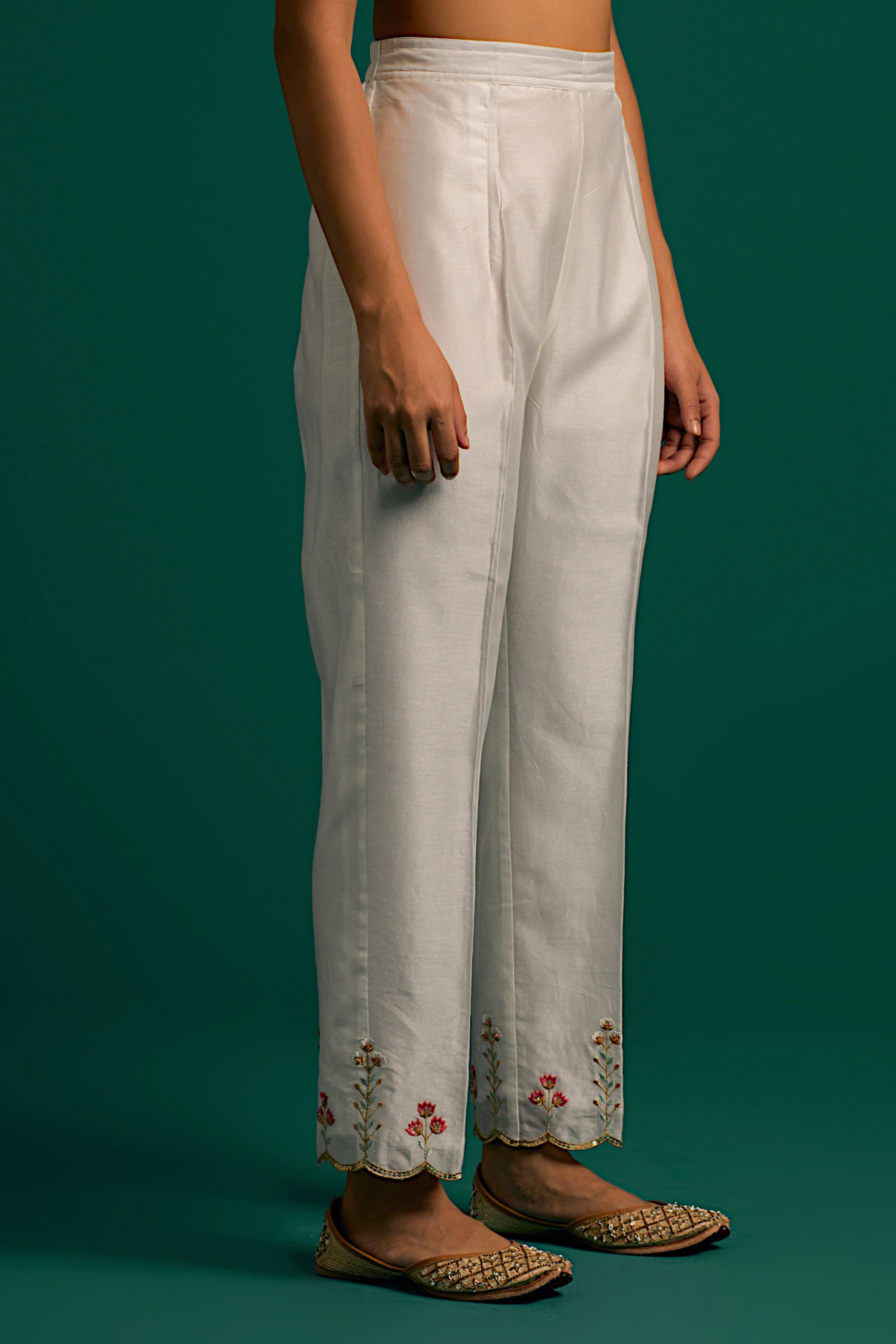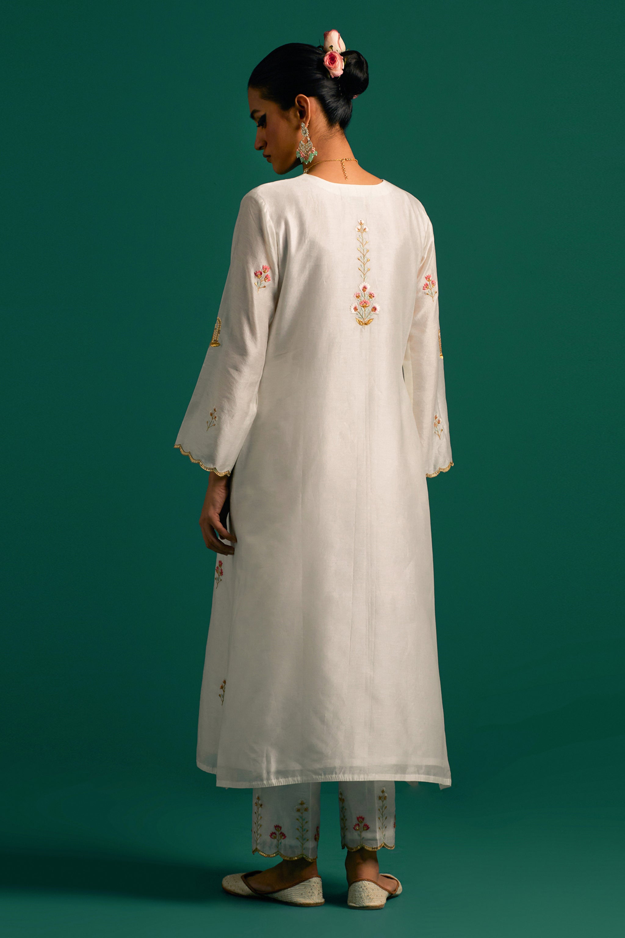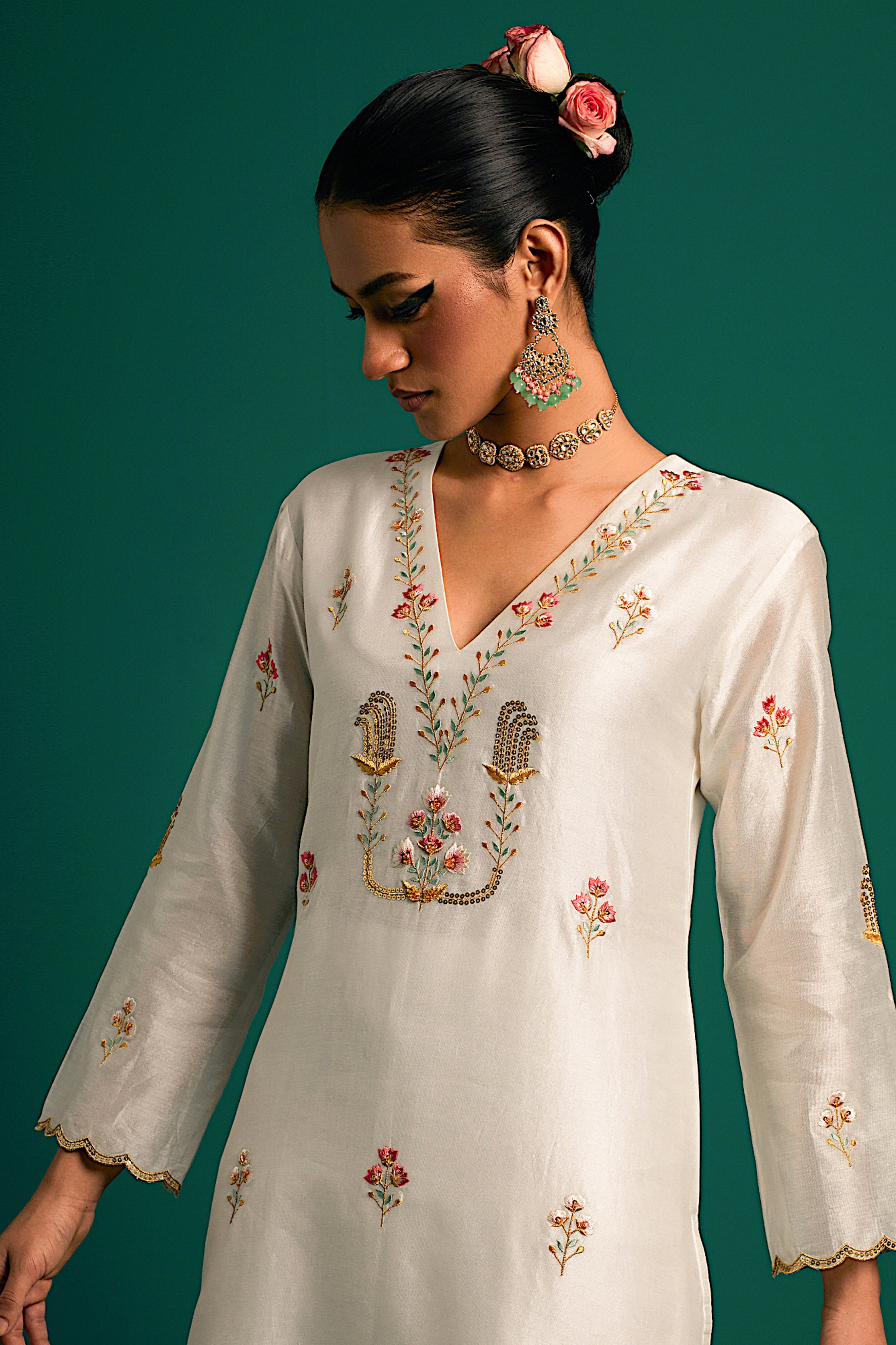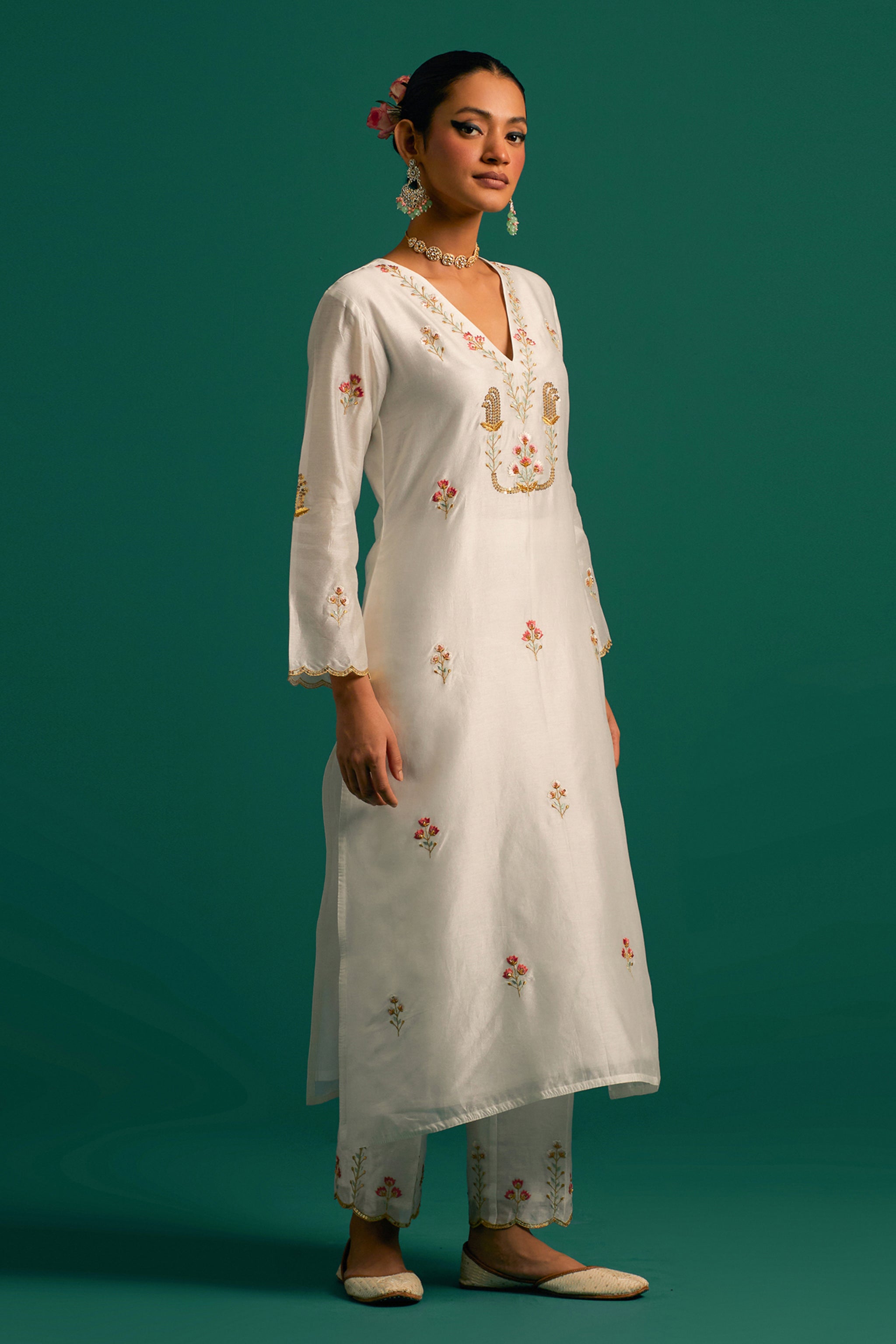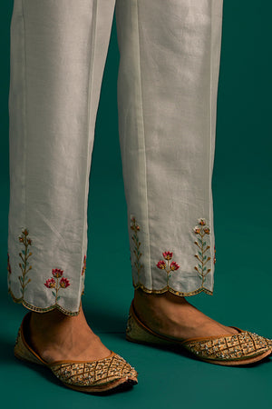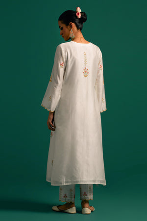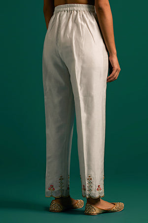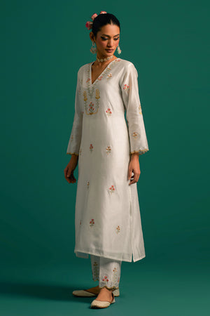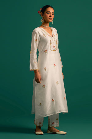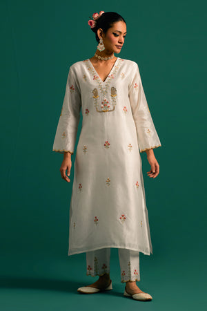 • Off white v neck hand embroidered silk chanderi kurta and pant set