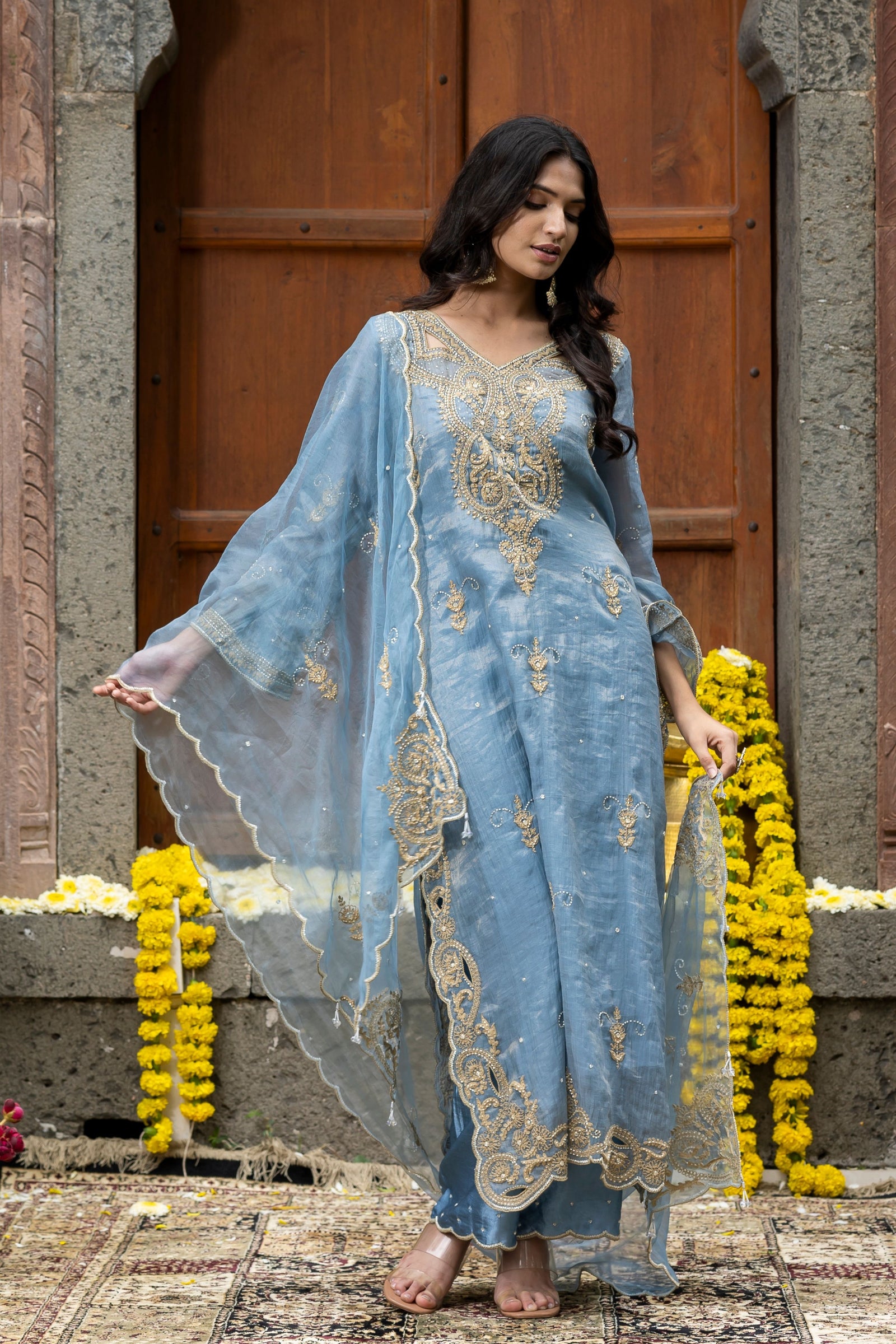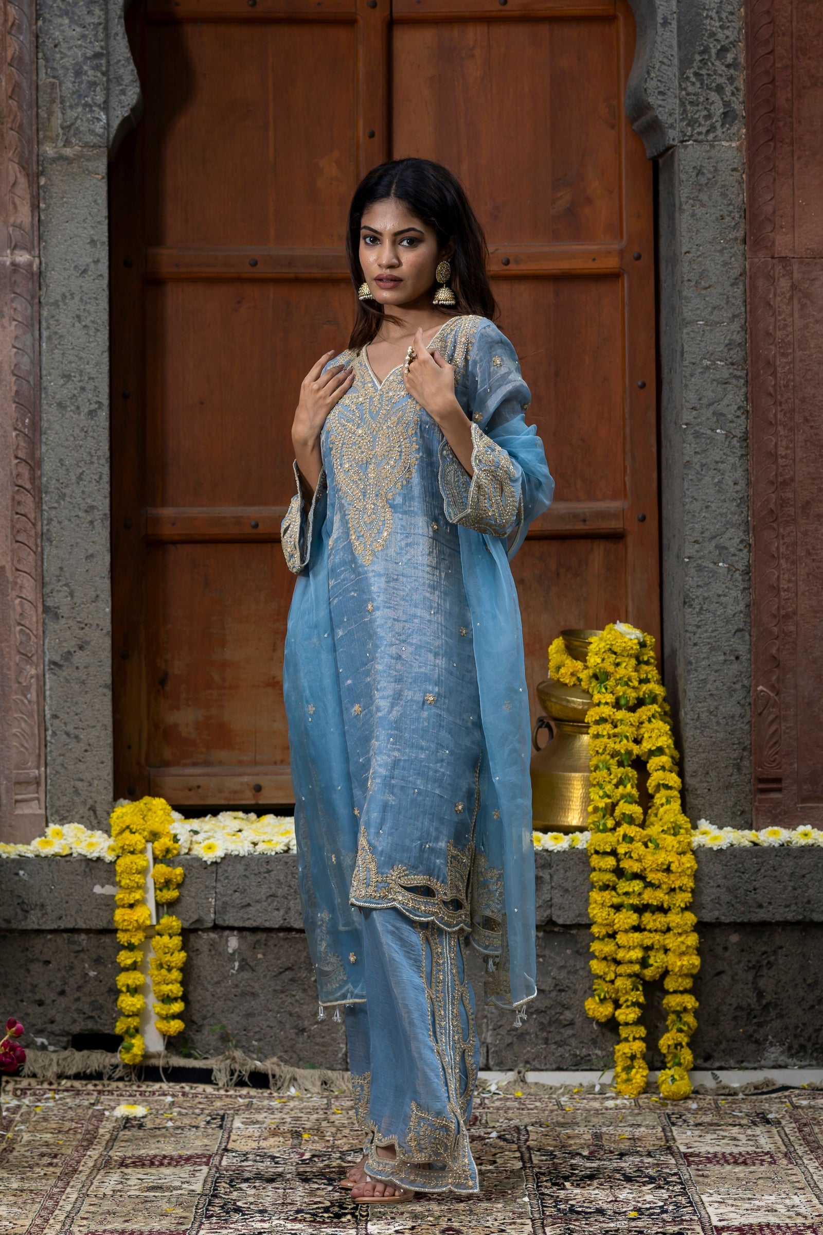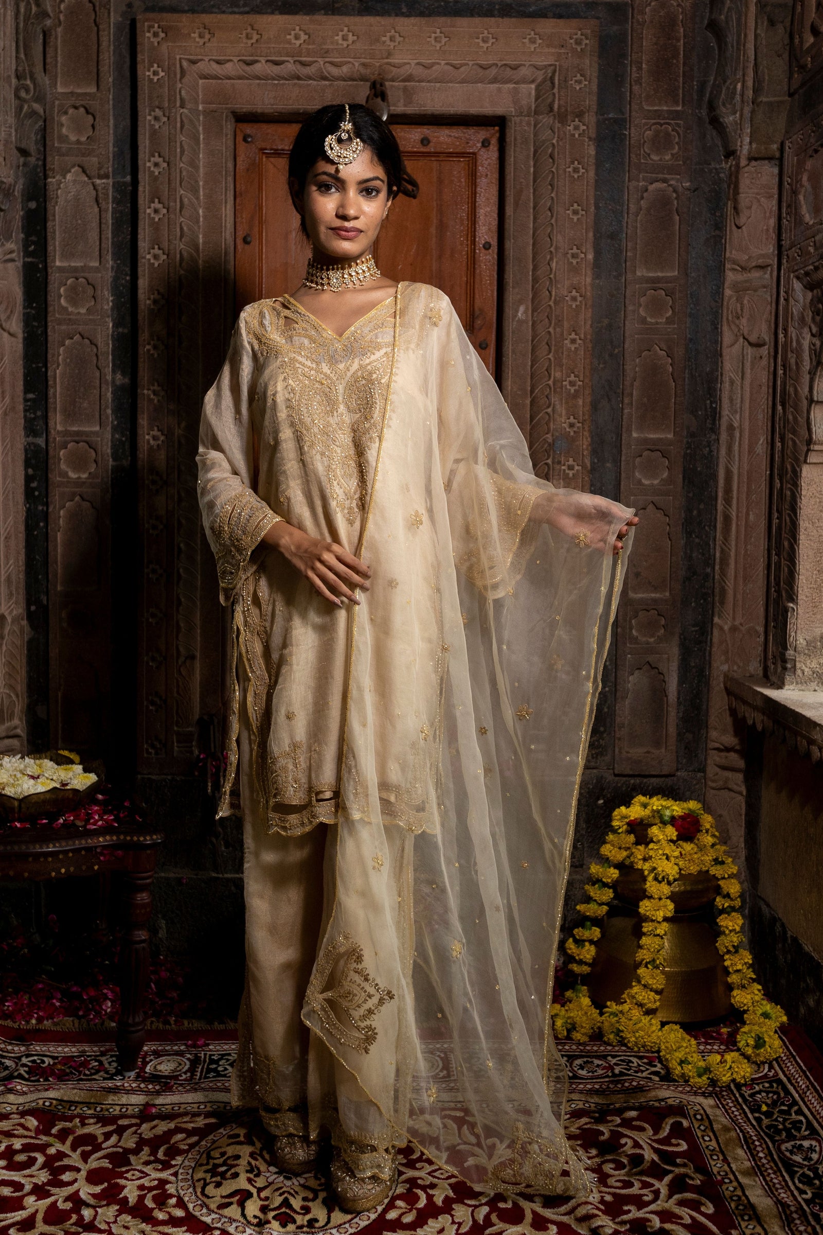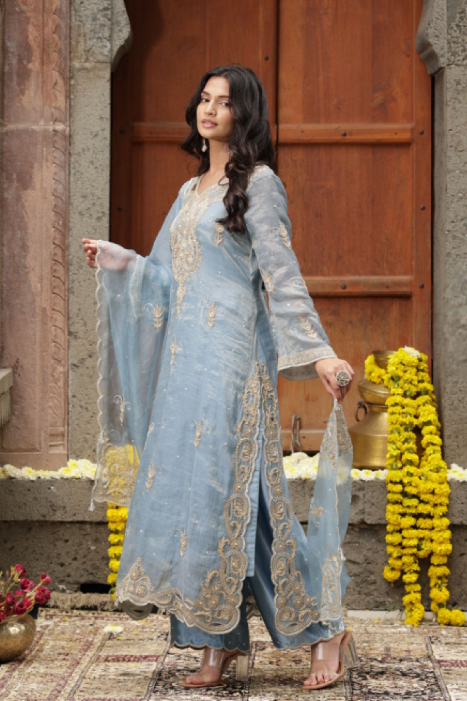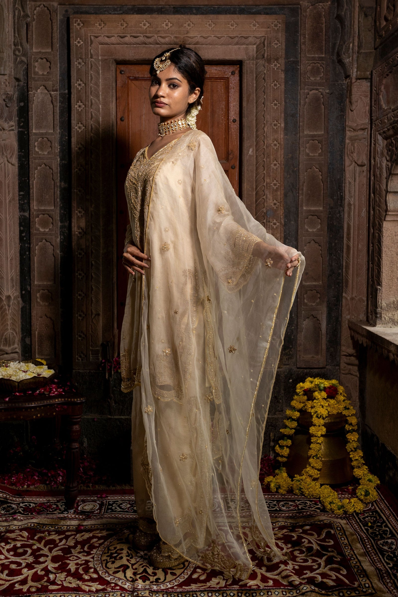 • Fabric: Anarkali: Chanderi Silk Tissue, Palazzo: Gajji Mushru Silk, Dupatta: Organza