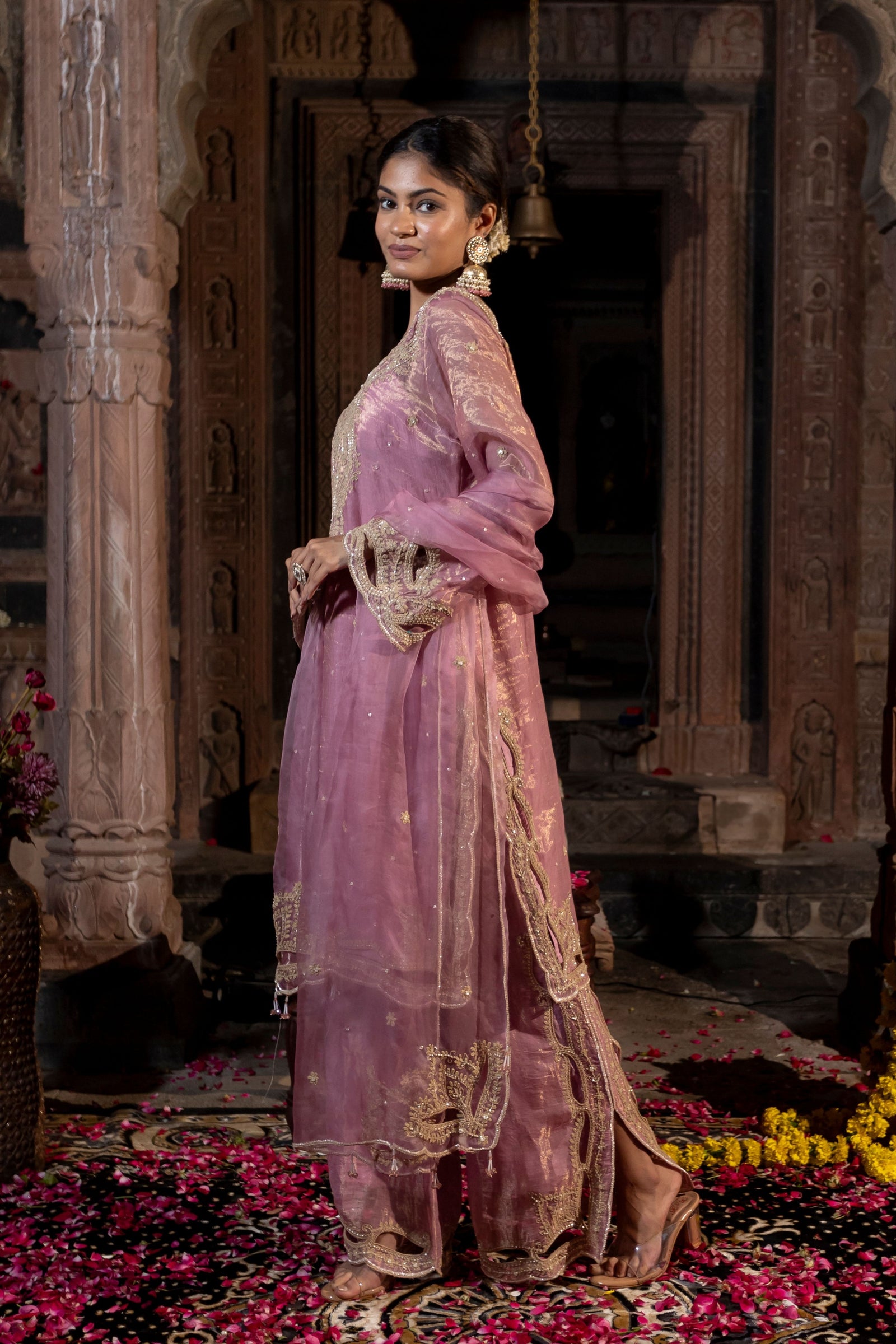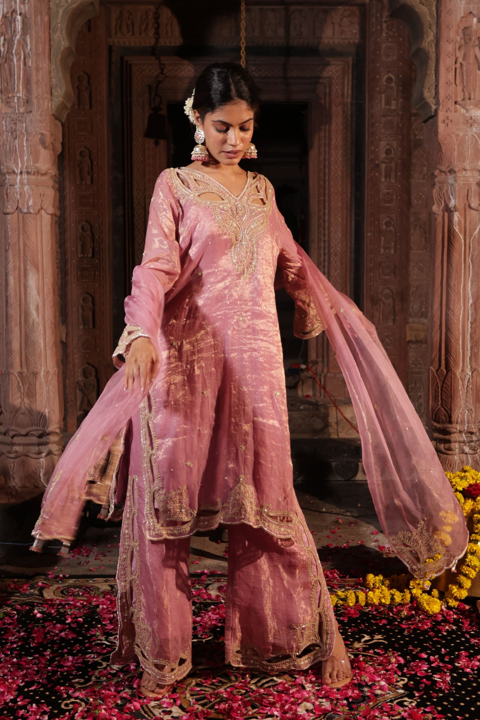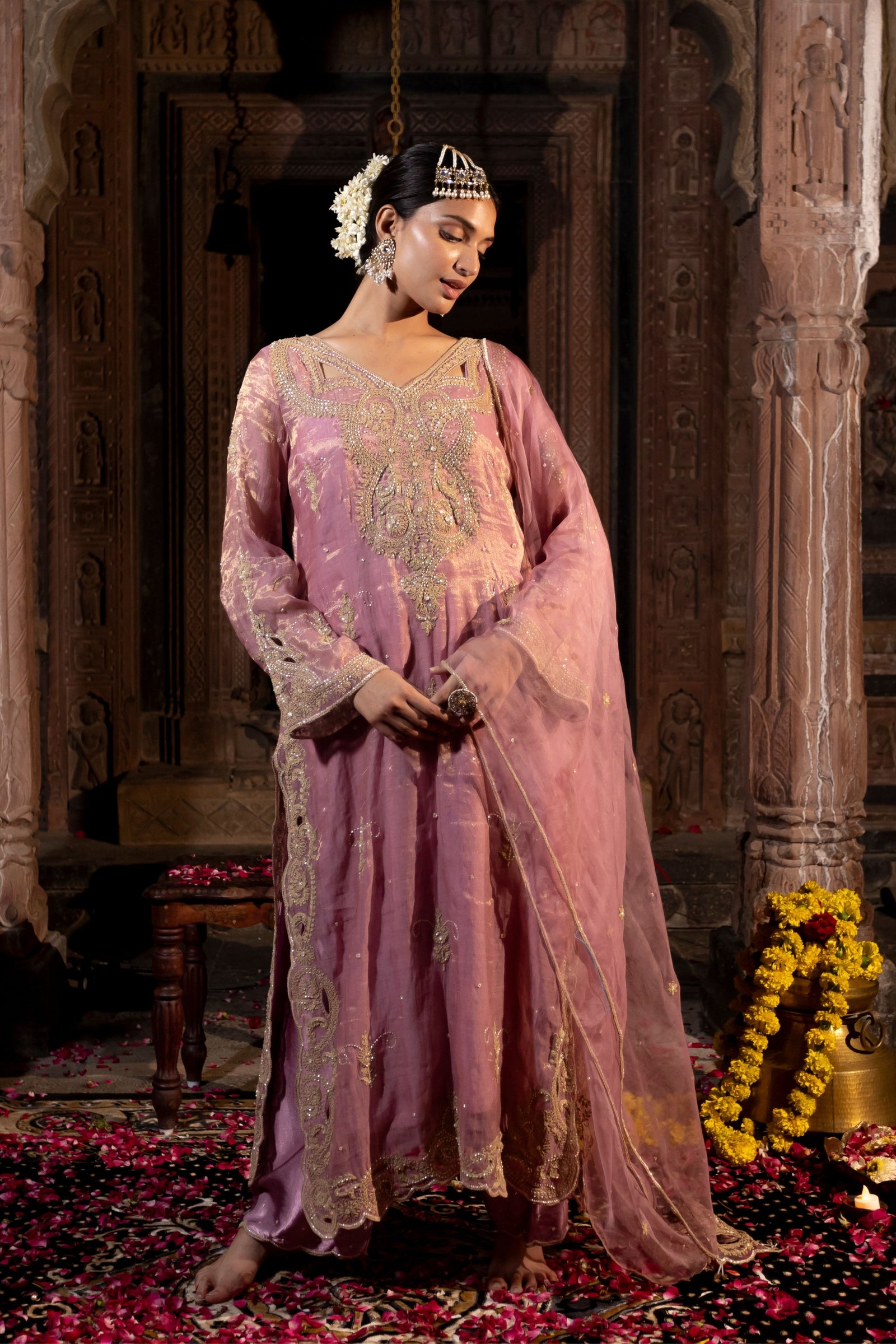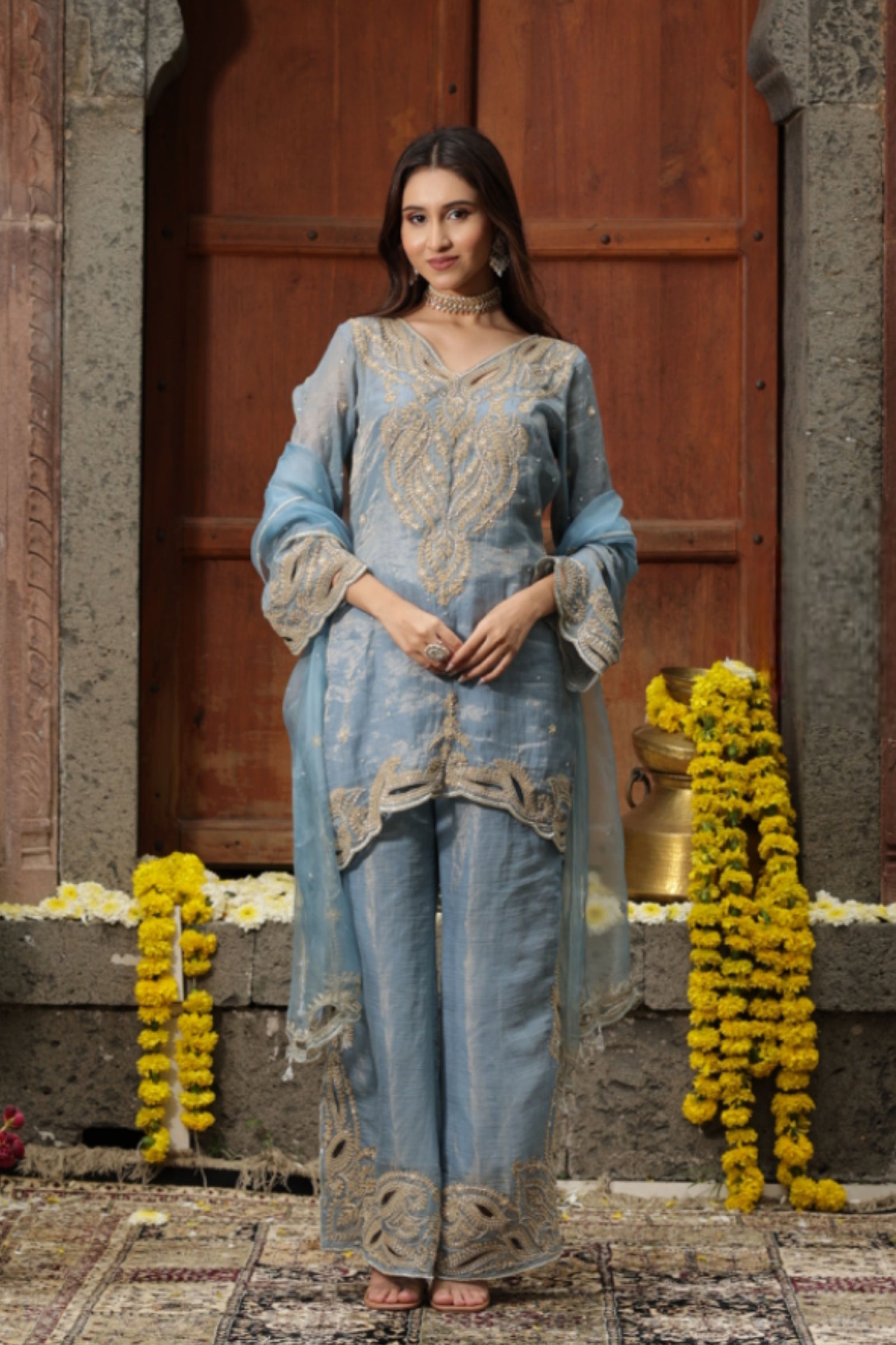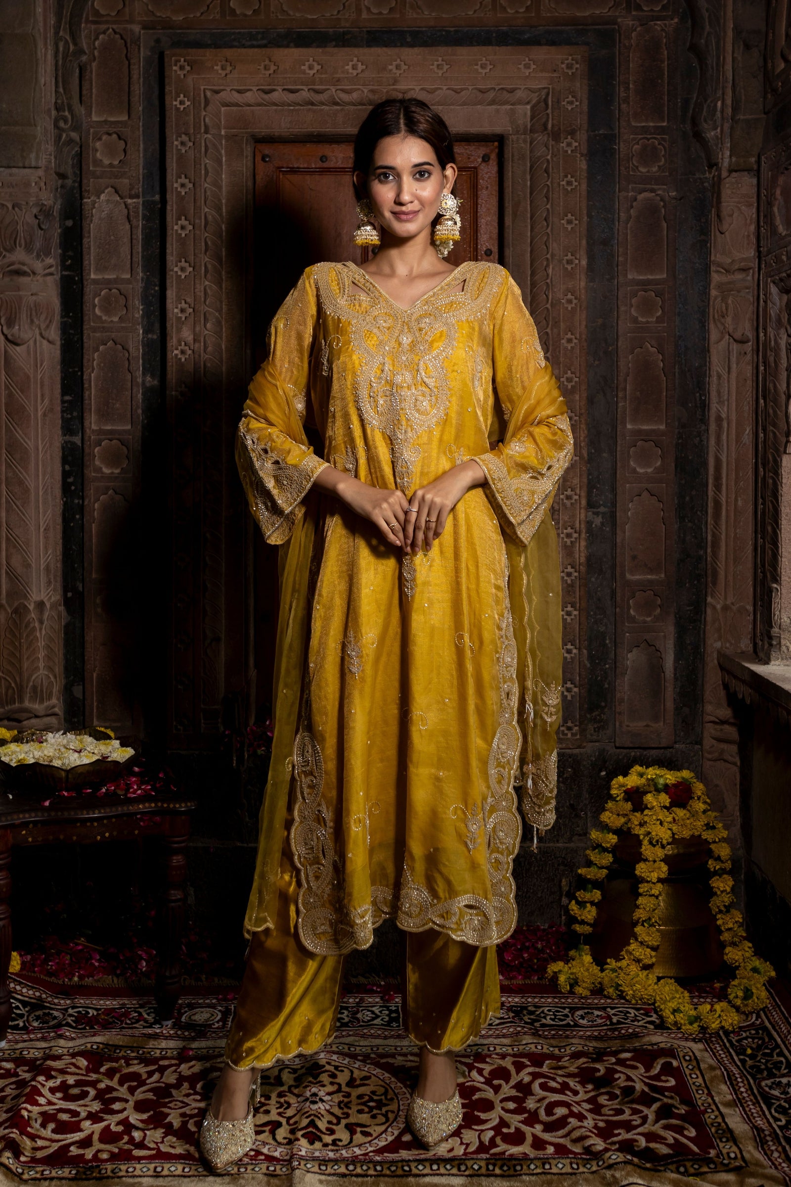 • Fabric: Anarkali: Chanderi Silk Tissue, Palazzo: Gajji Mushru Silk, Dupatta: Organza