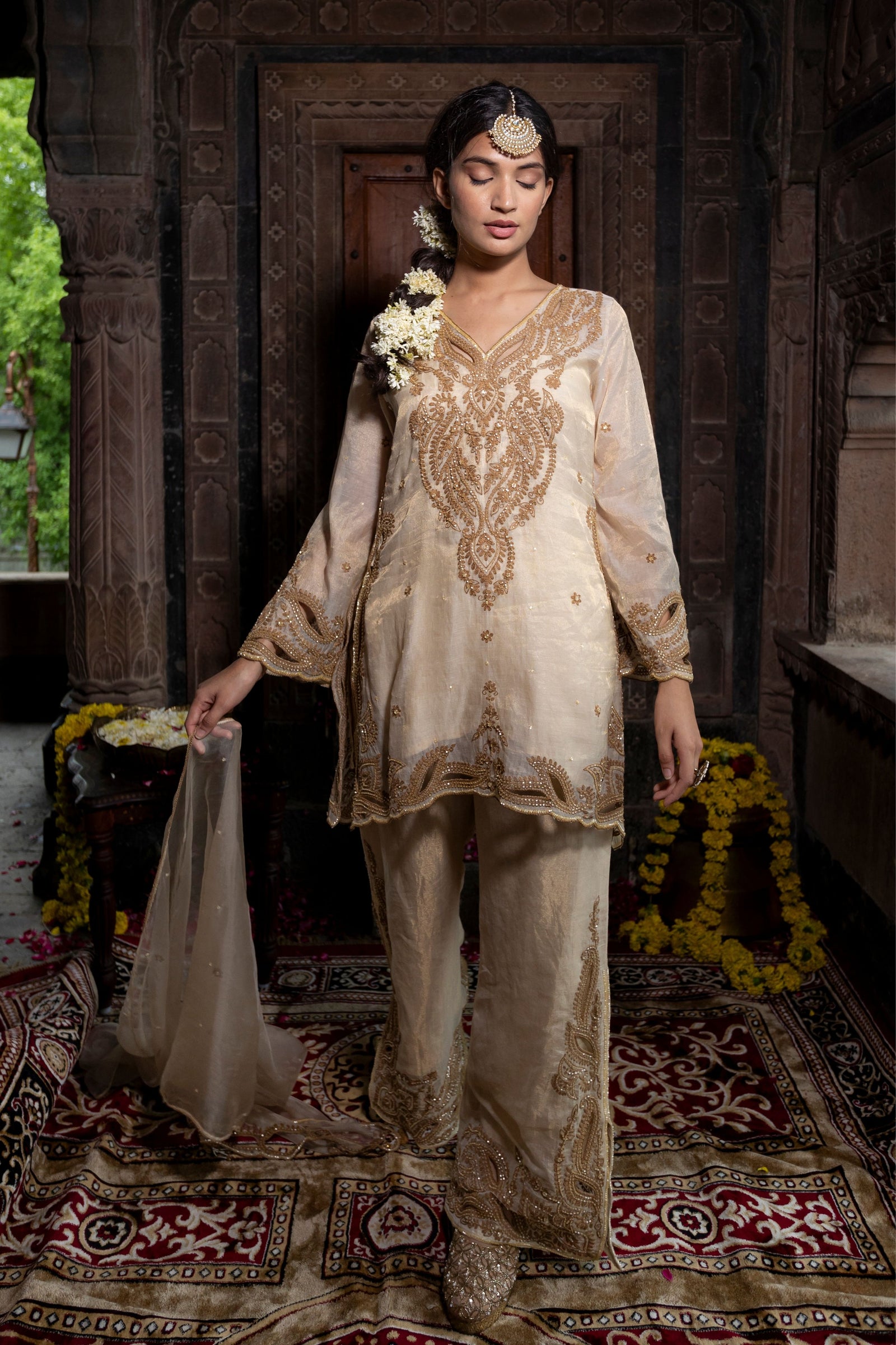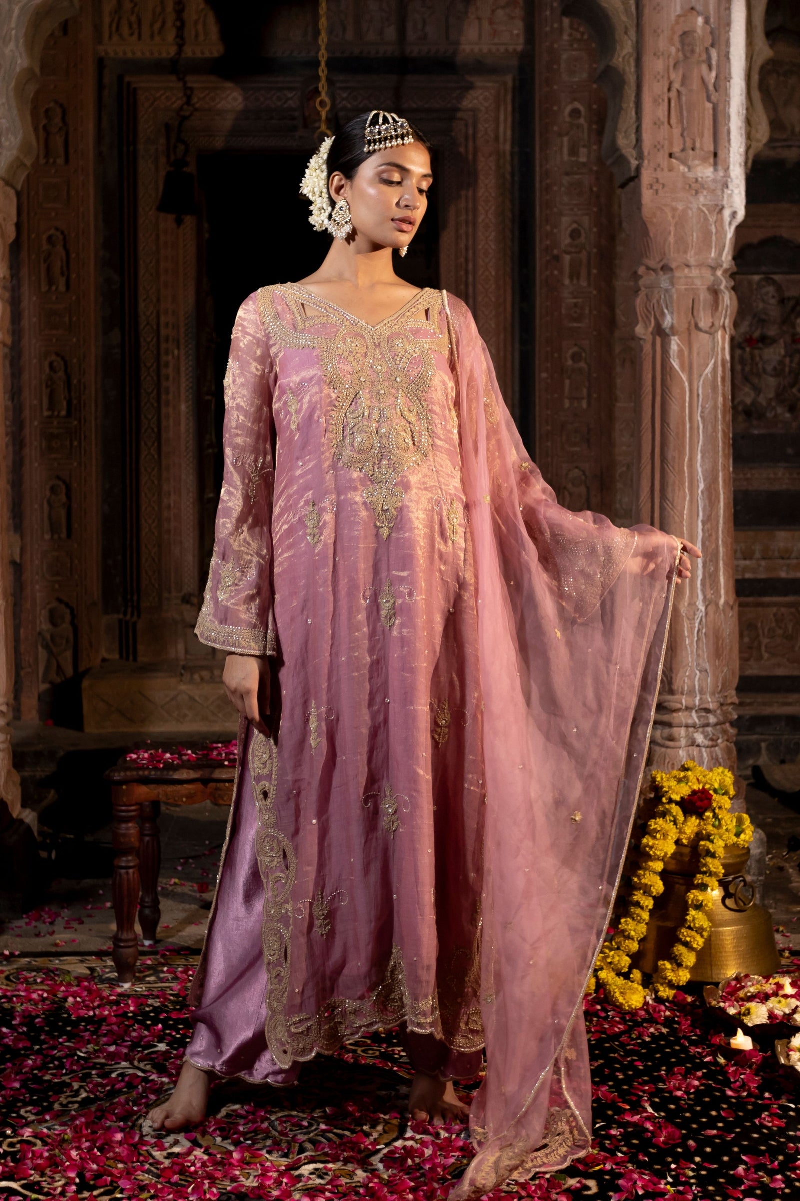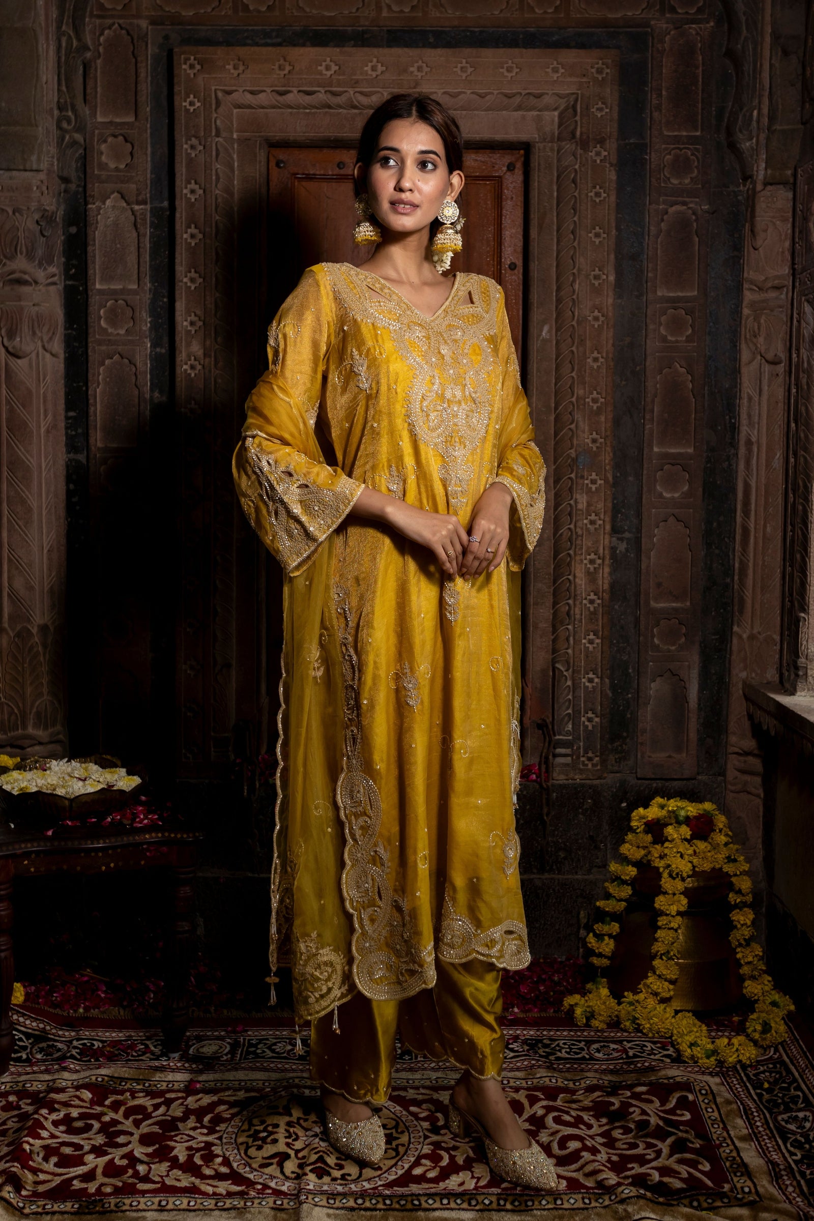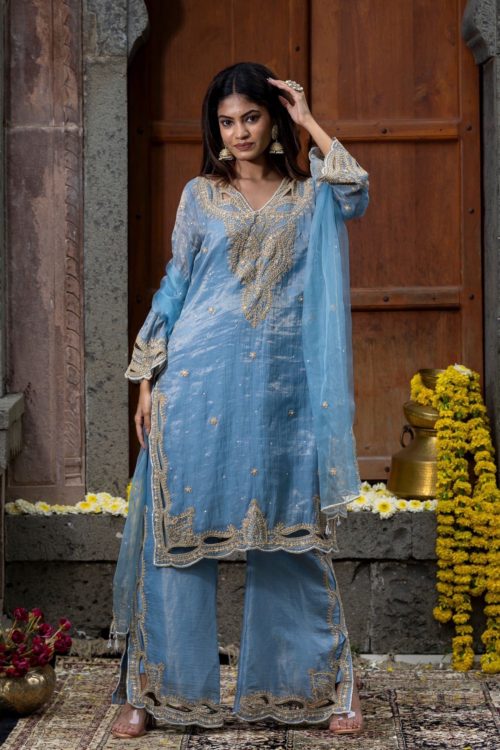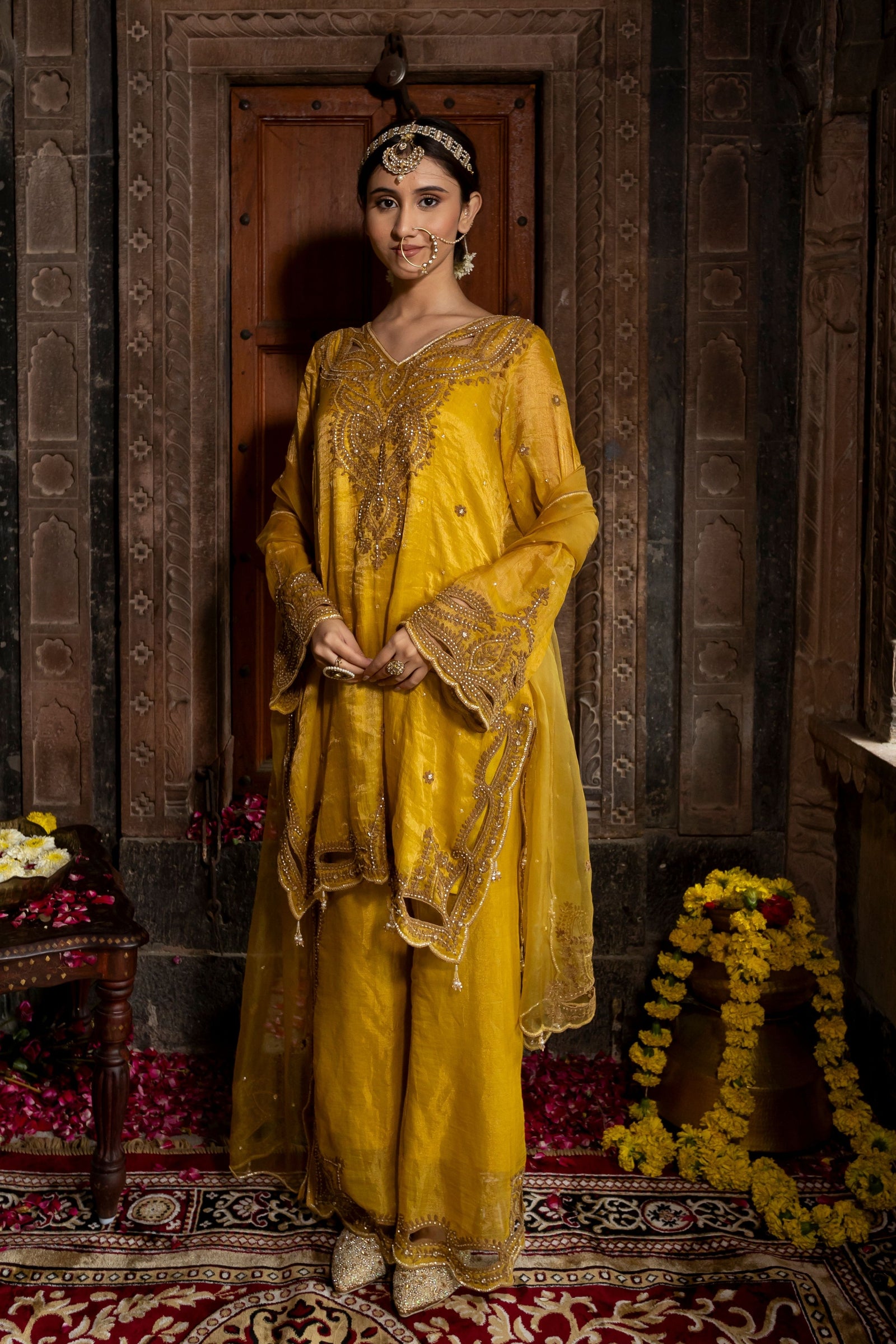 • Fabric: Anarkali: Chanderi Silk Tissue, Palazzo: Gajji Mushru Silk, Dupatta: Organza
