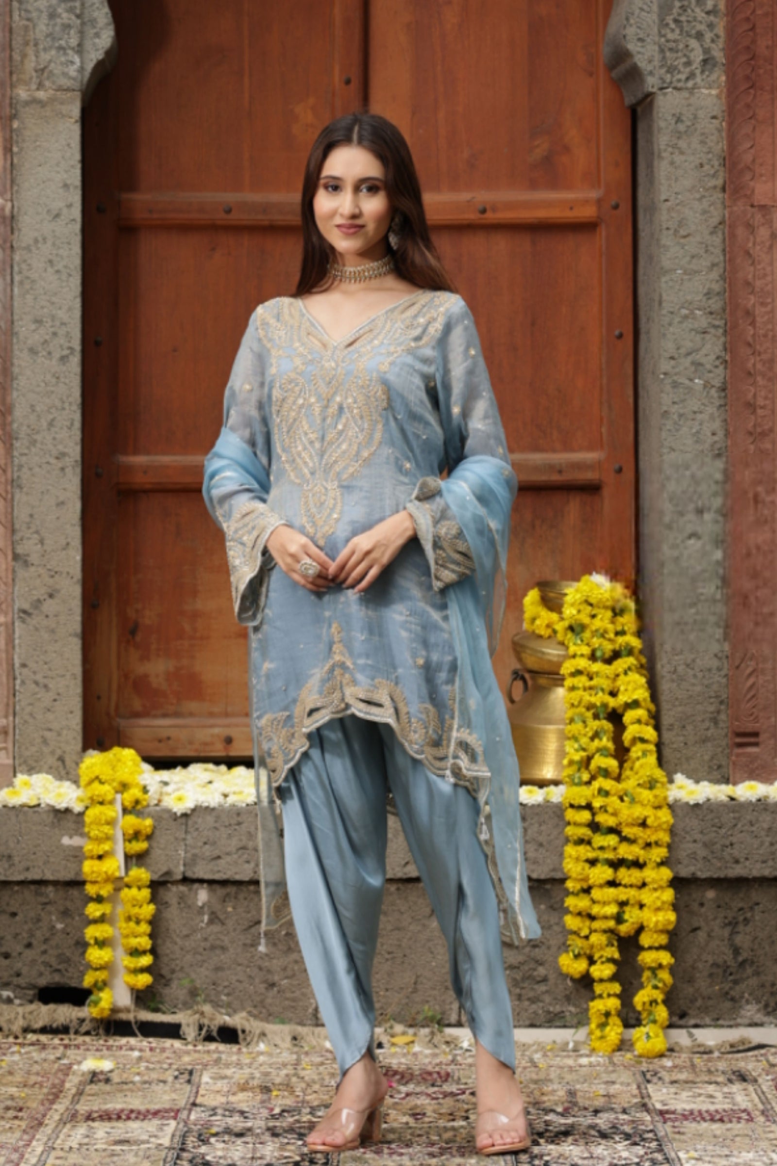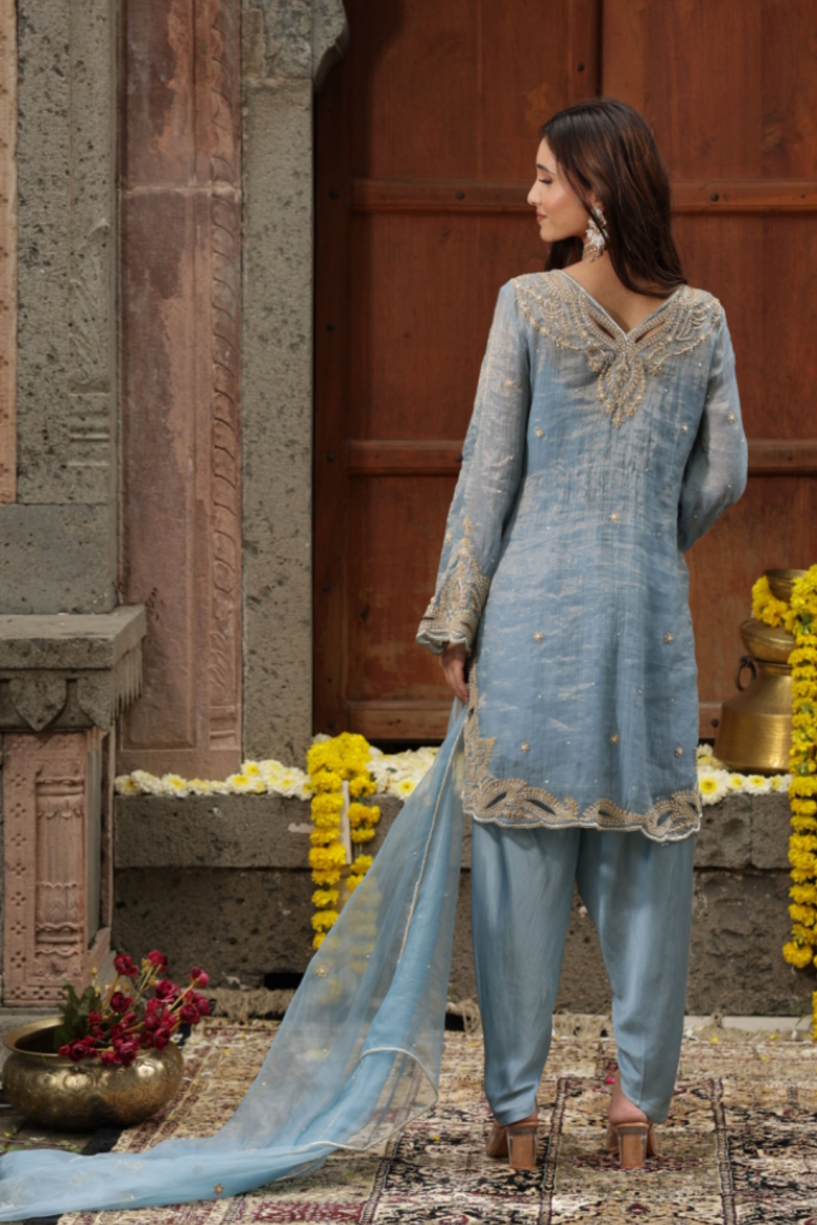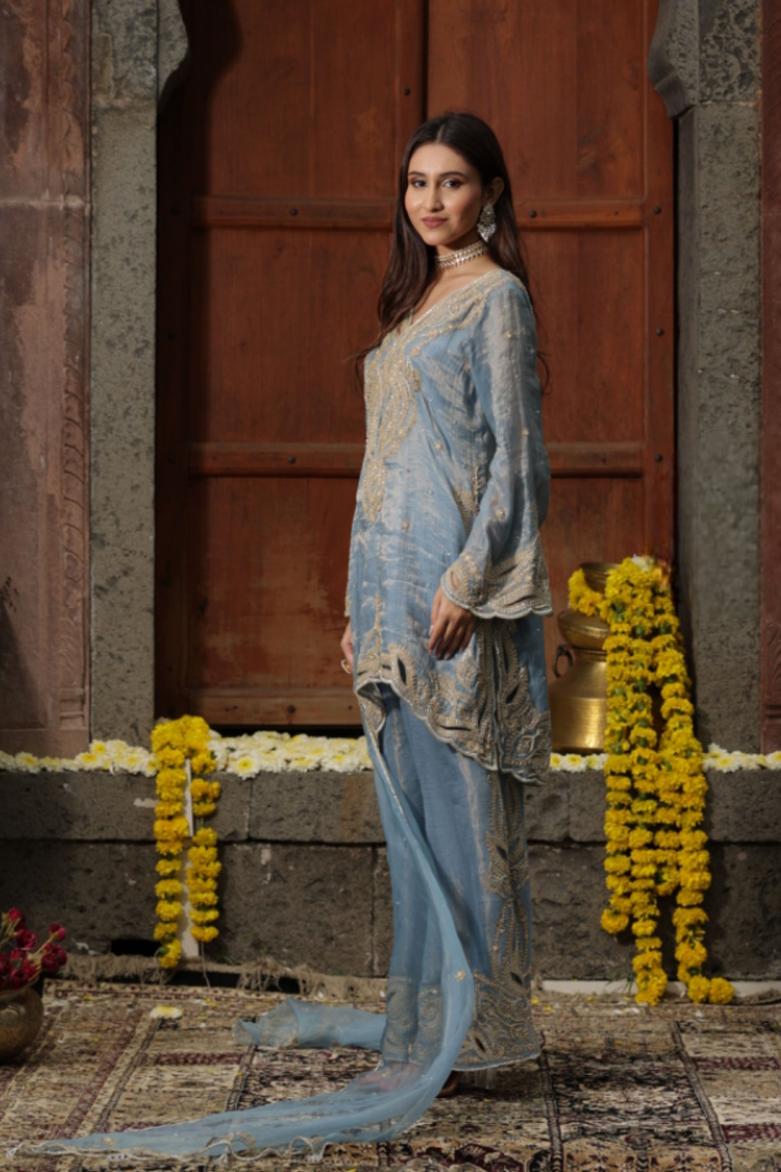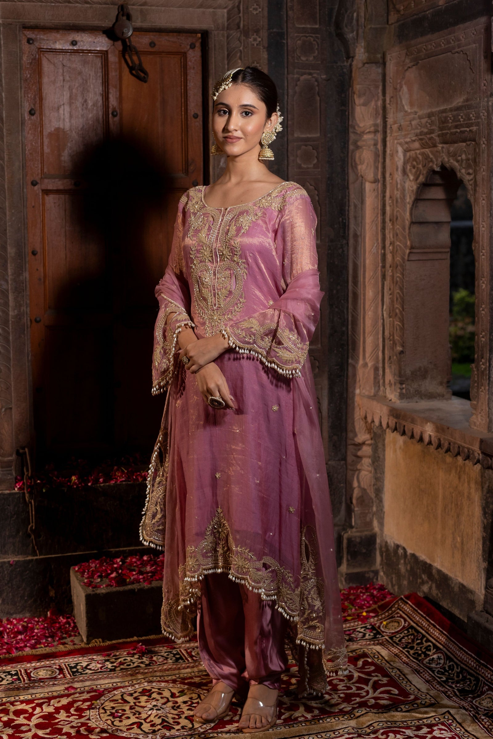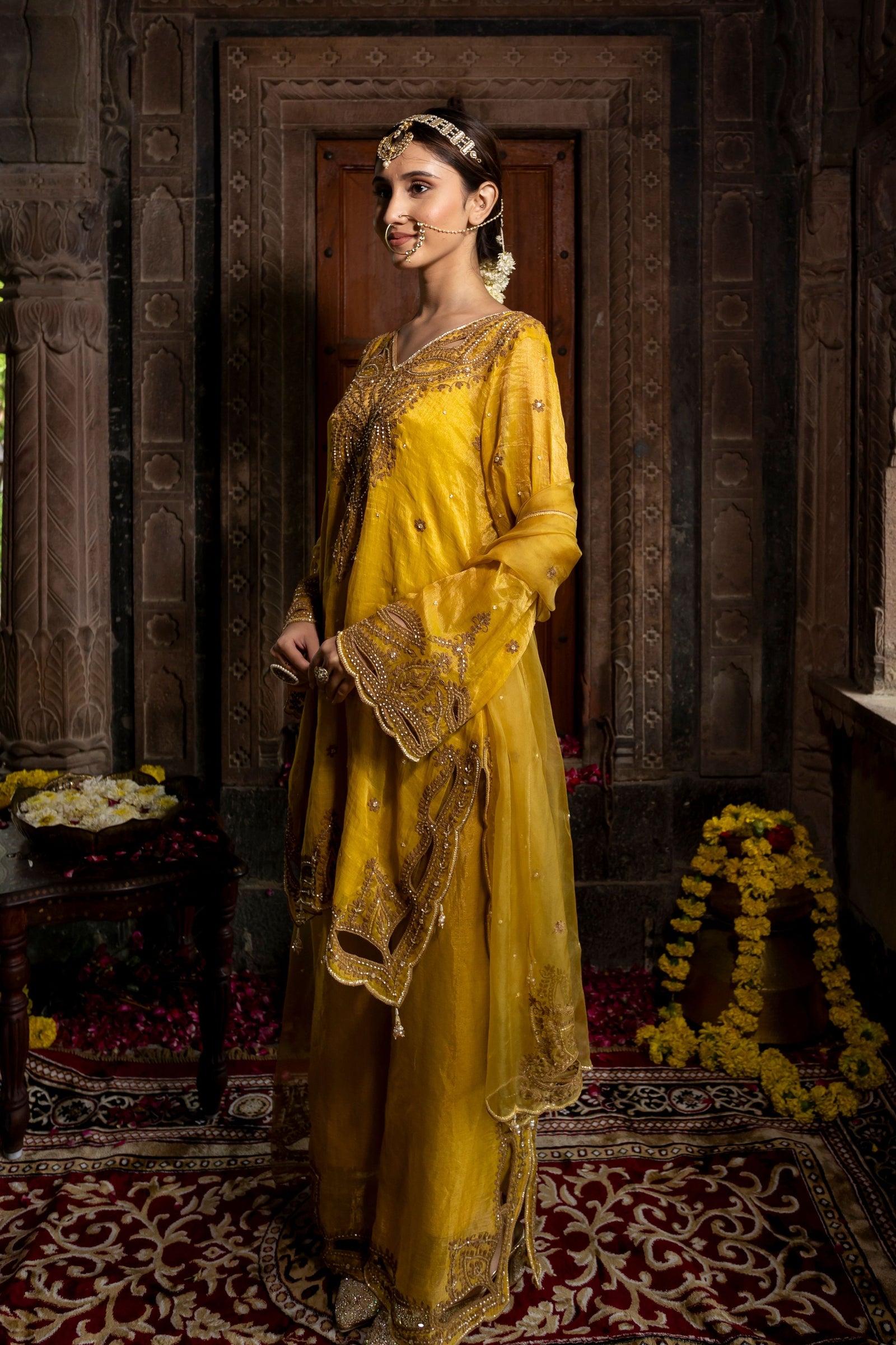 • Fabric: Anarkali: Chanderi Silk Tissue, Palazzo: Gajji Mushru Silk, Dupatta: Organza