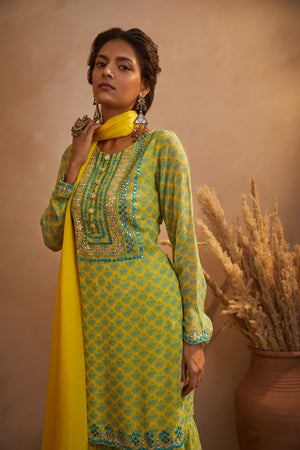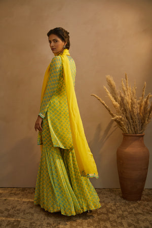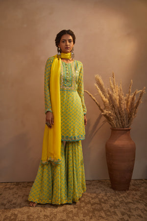 • Featuring a yellow green butti print with matching flared sharara and yellow soft organza dupatta. It has mirror and thread embroidery on the neckline, border and dupatta.