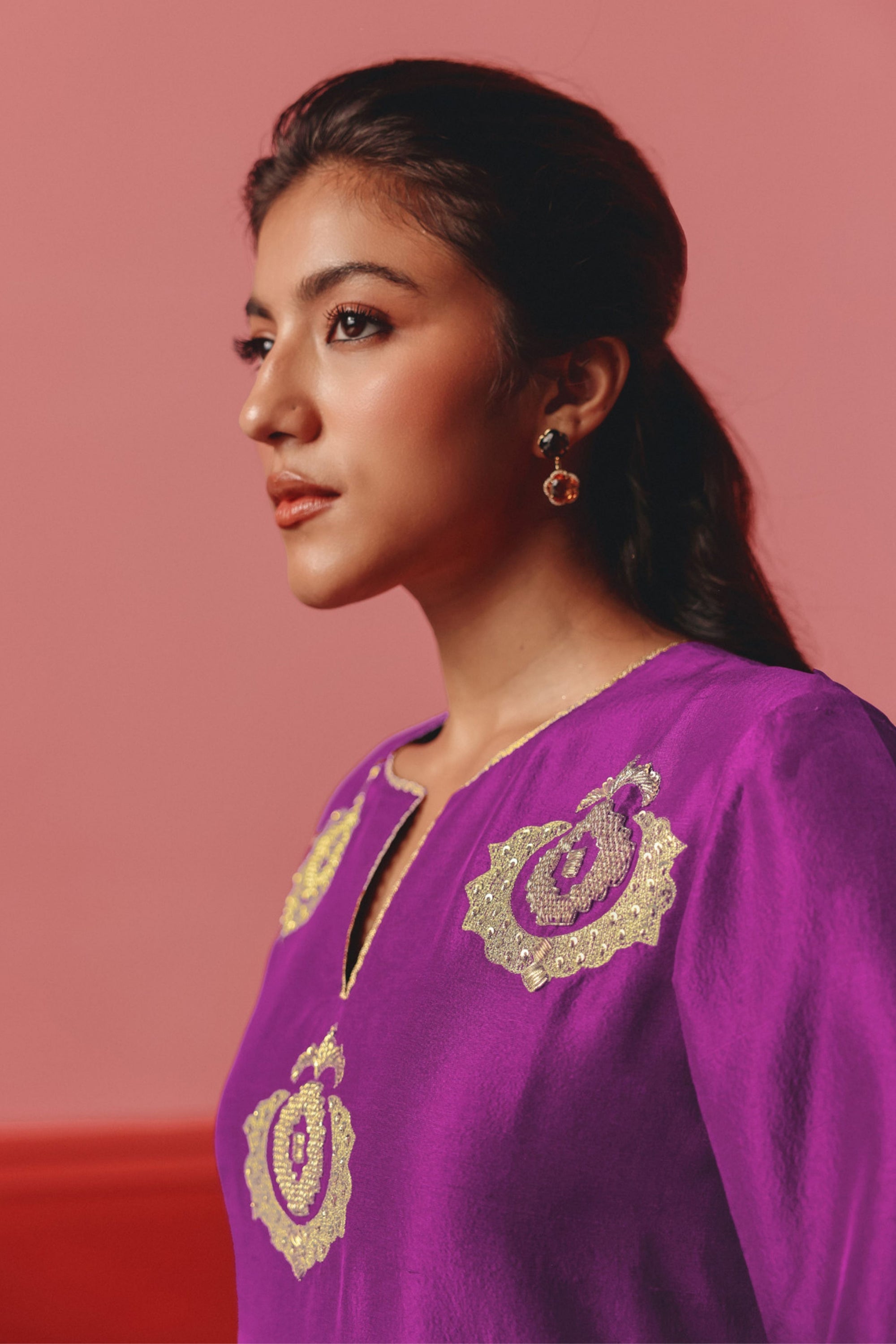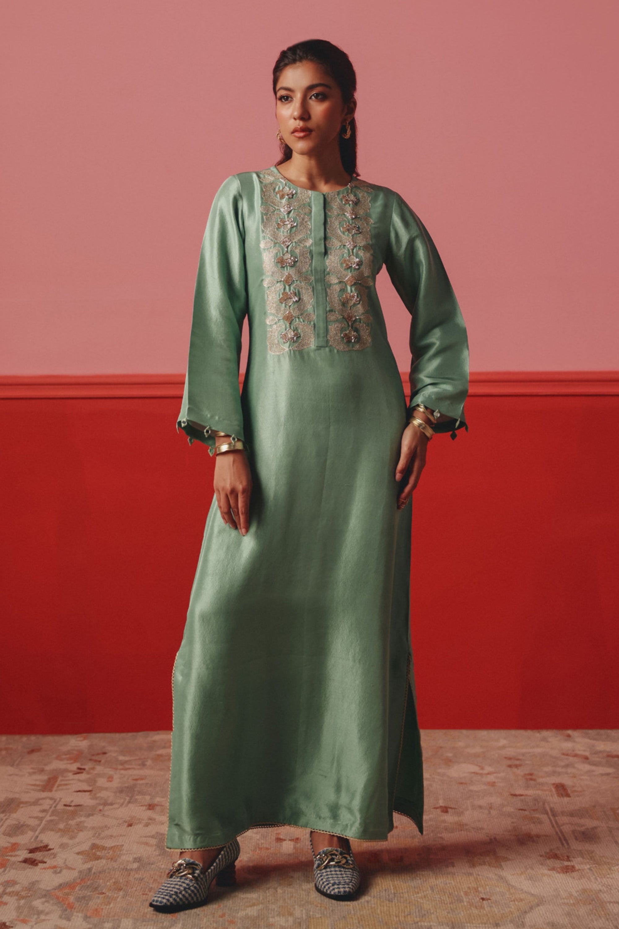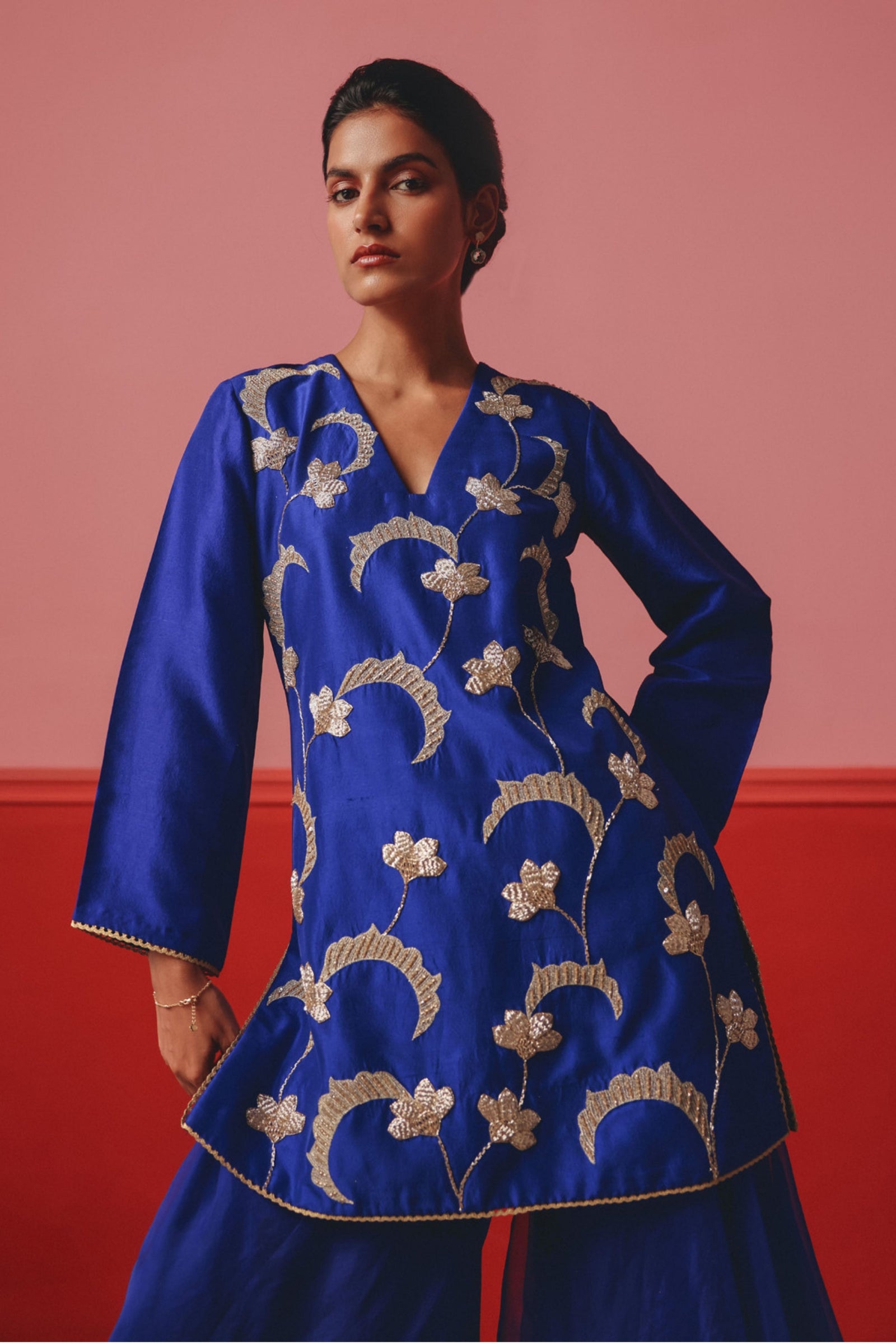 • This blue diamond-patterned kaftan, beautifully adorned with thread dori embellishments on the yoke. The relaxed silhouette and intricate detailing make this kaftan a perfect fusion of comfort and sophistication. Ideal for both casual and festive wear, it adds a touch of chic flair to any occasion.