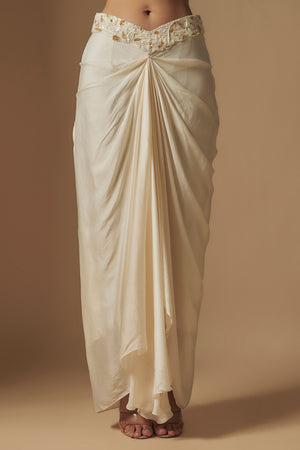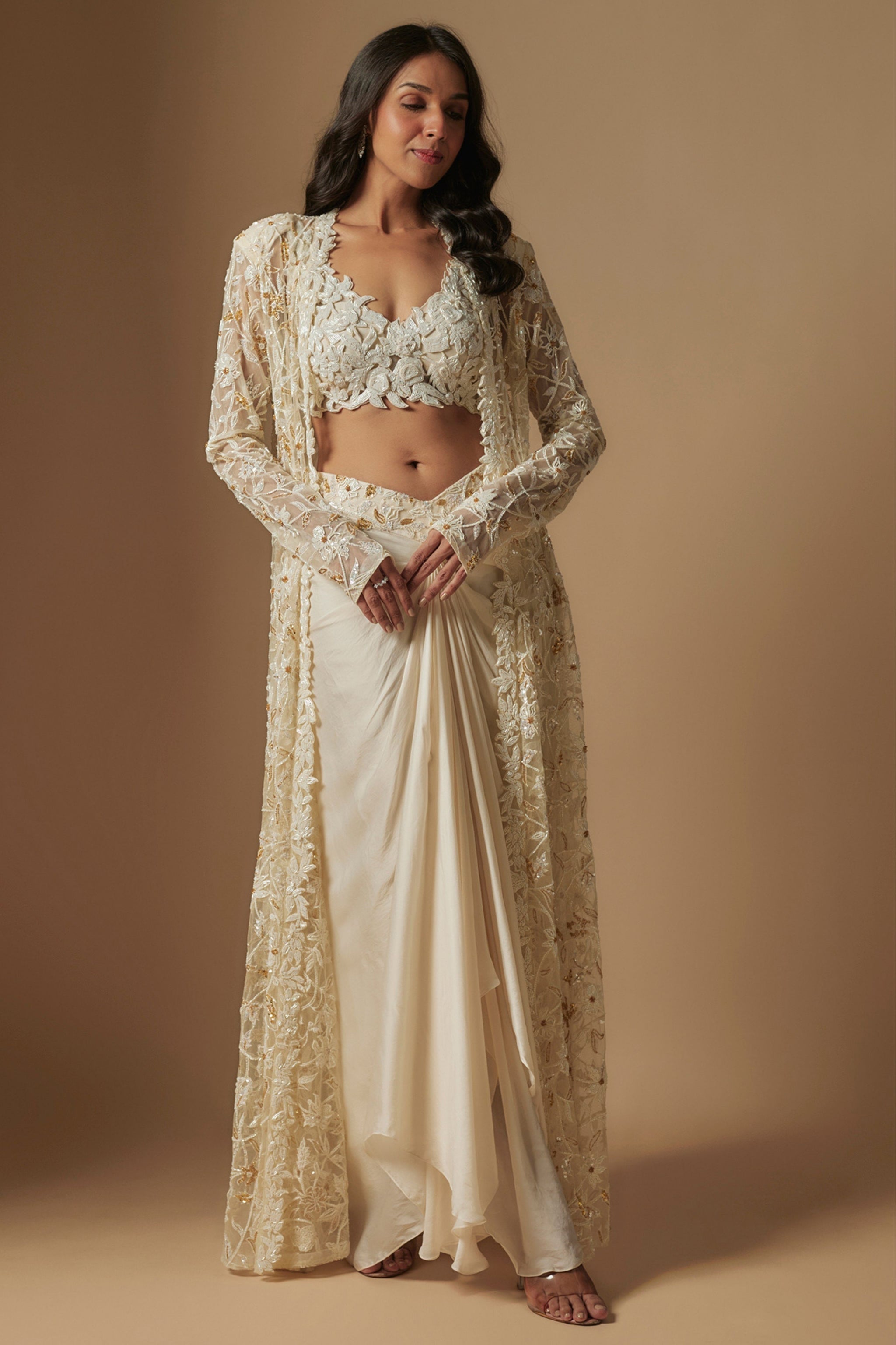 • Moon pie full embroidered blouse paired with drape skirt and embroidered full jacket