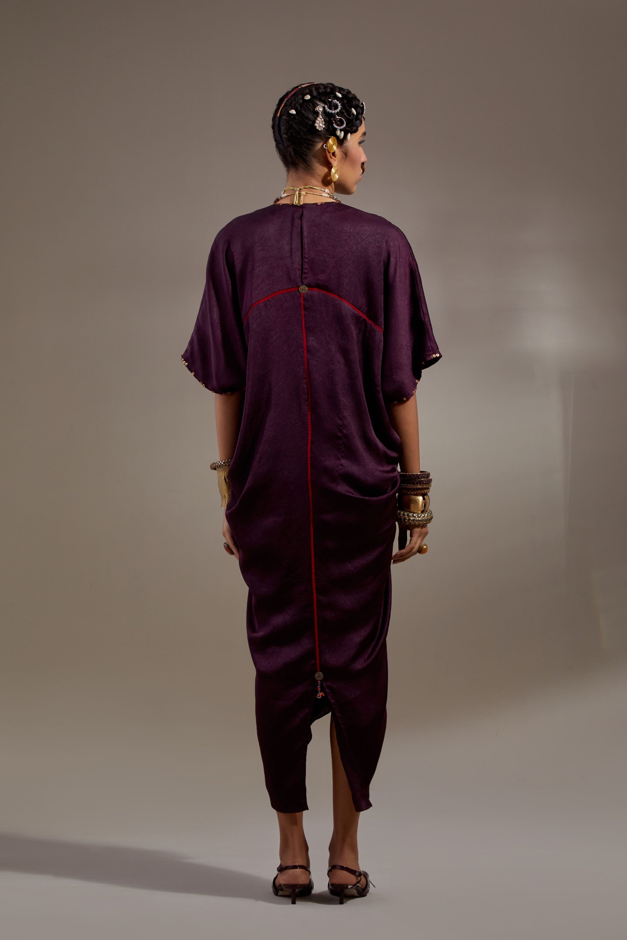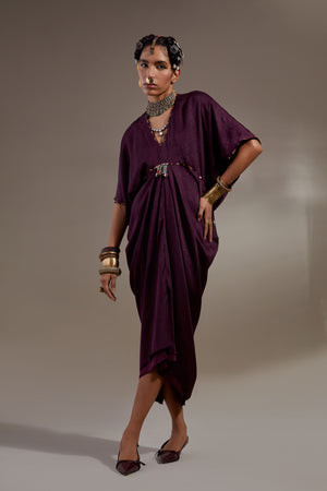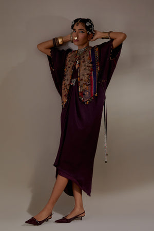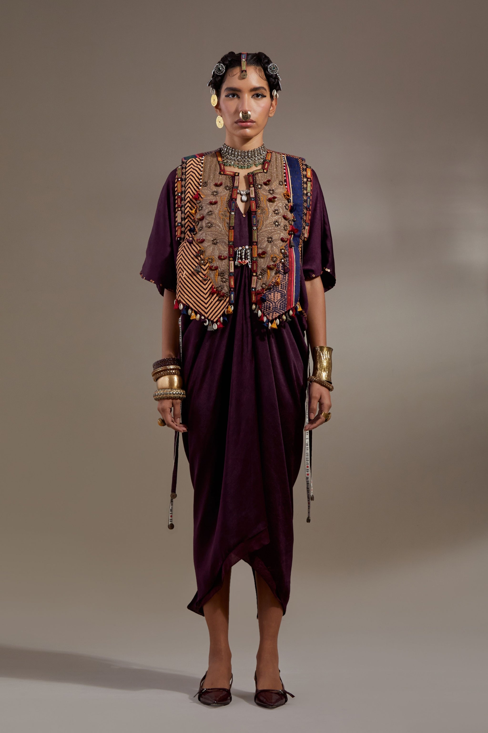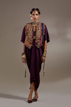 • Solid textured drape dress with embroidered detailing paired with embroidered gilet with tribal tassel details. Gilet length- 20"