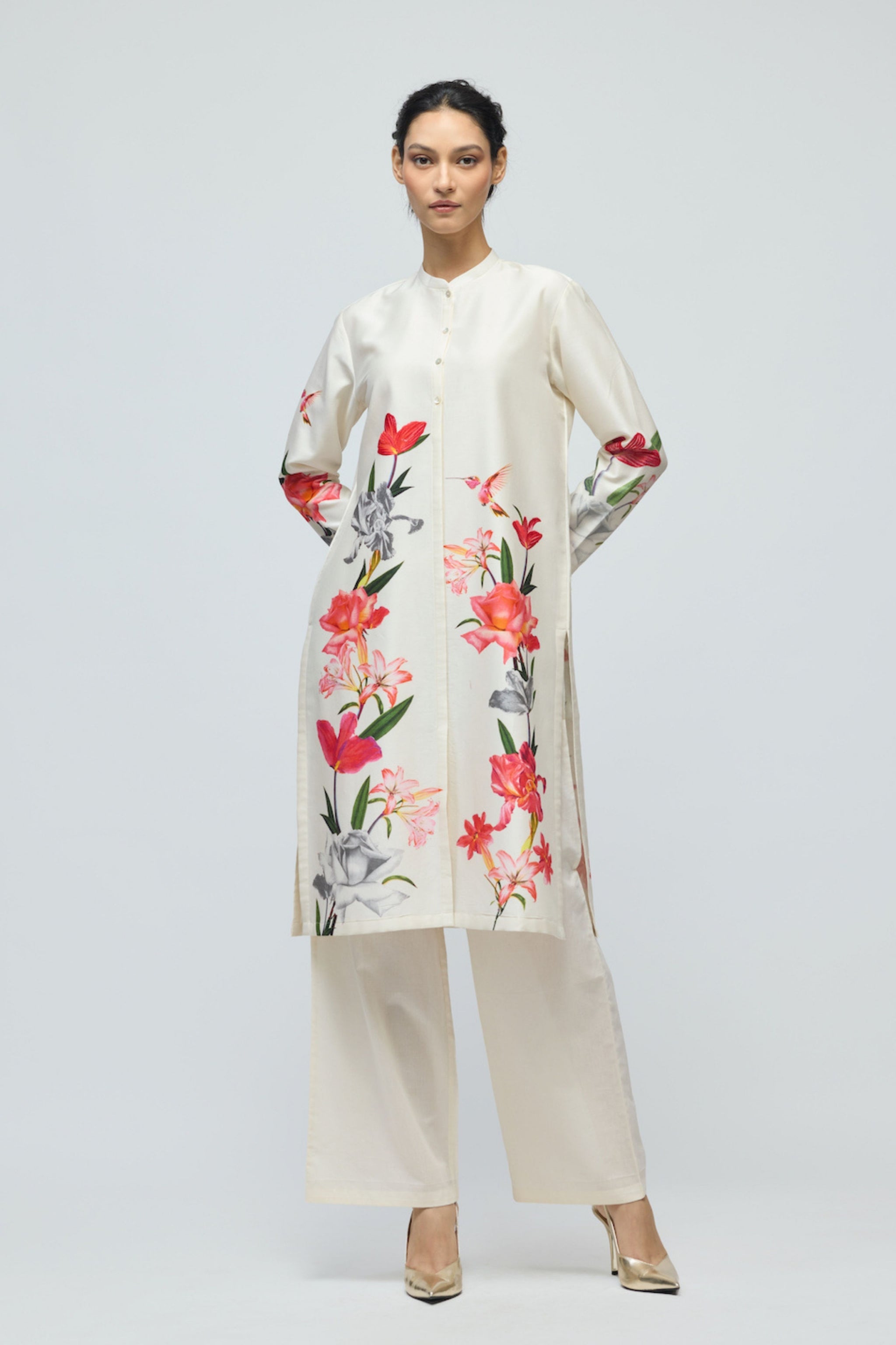 • Floral printed chanderi tunic set with voile pant
