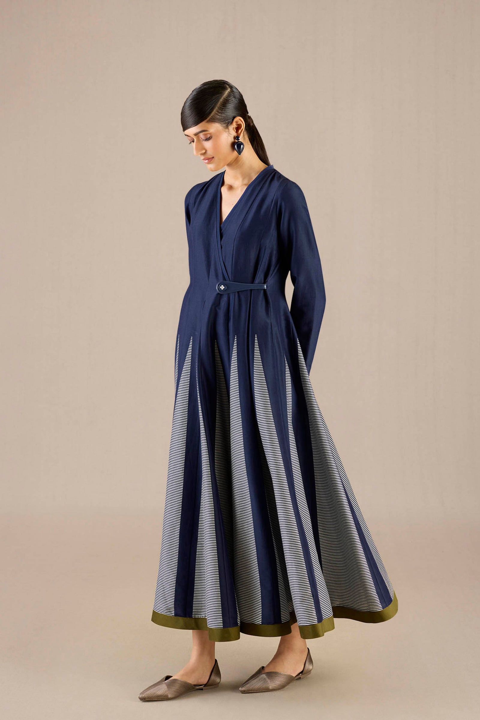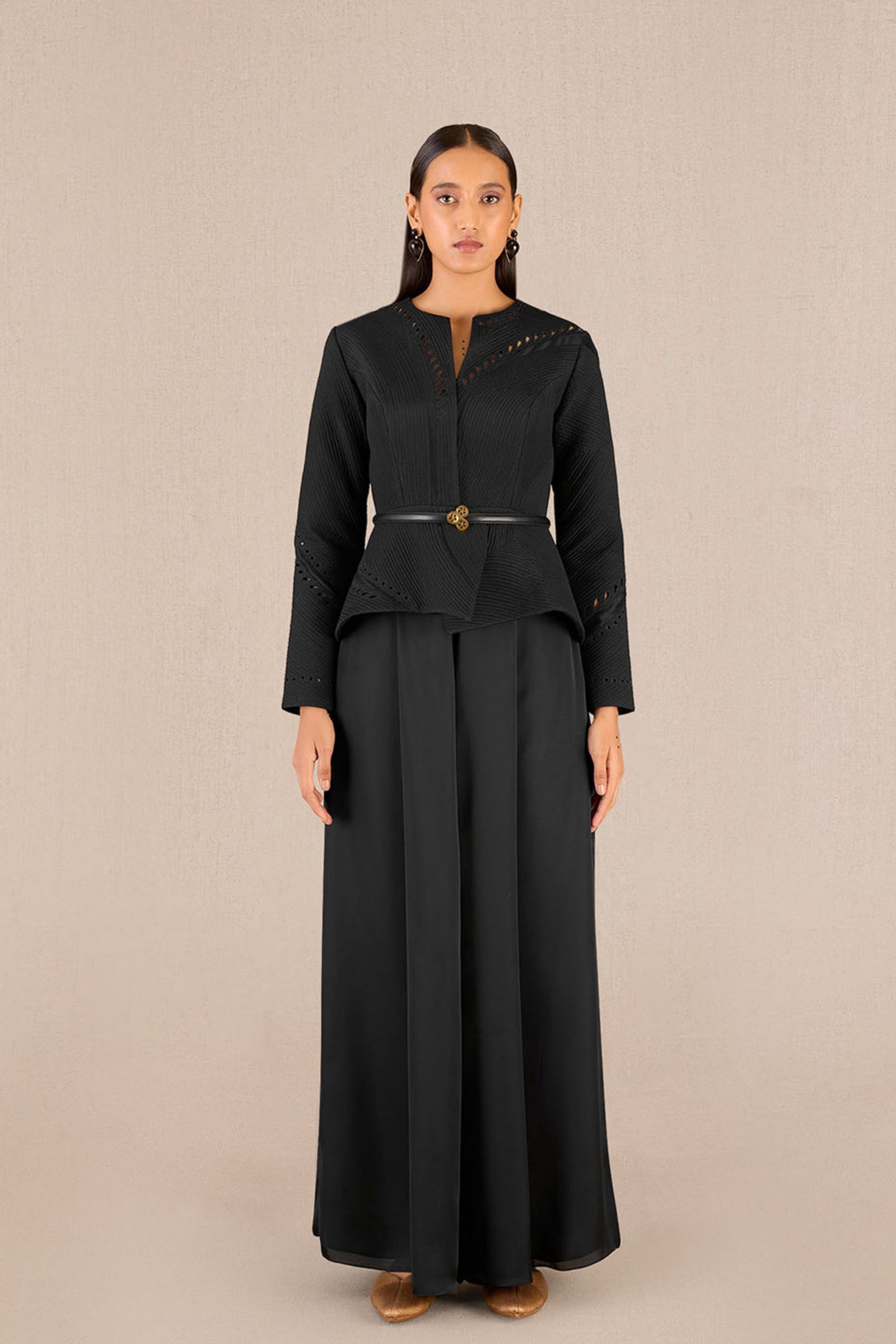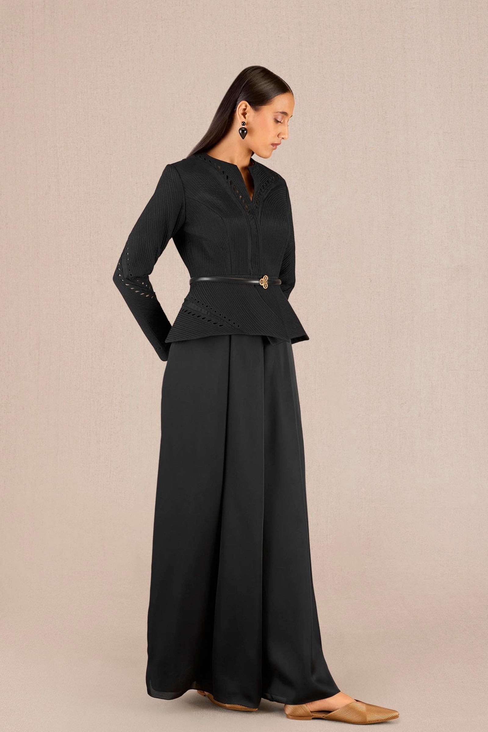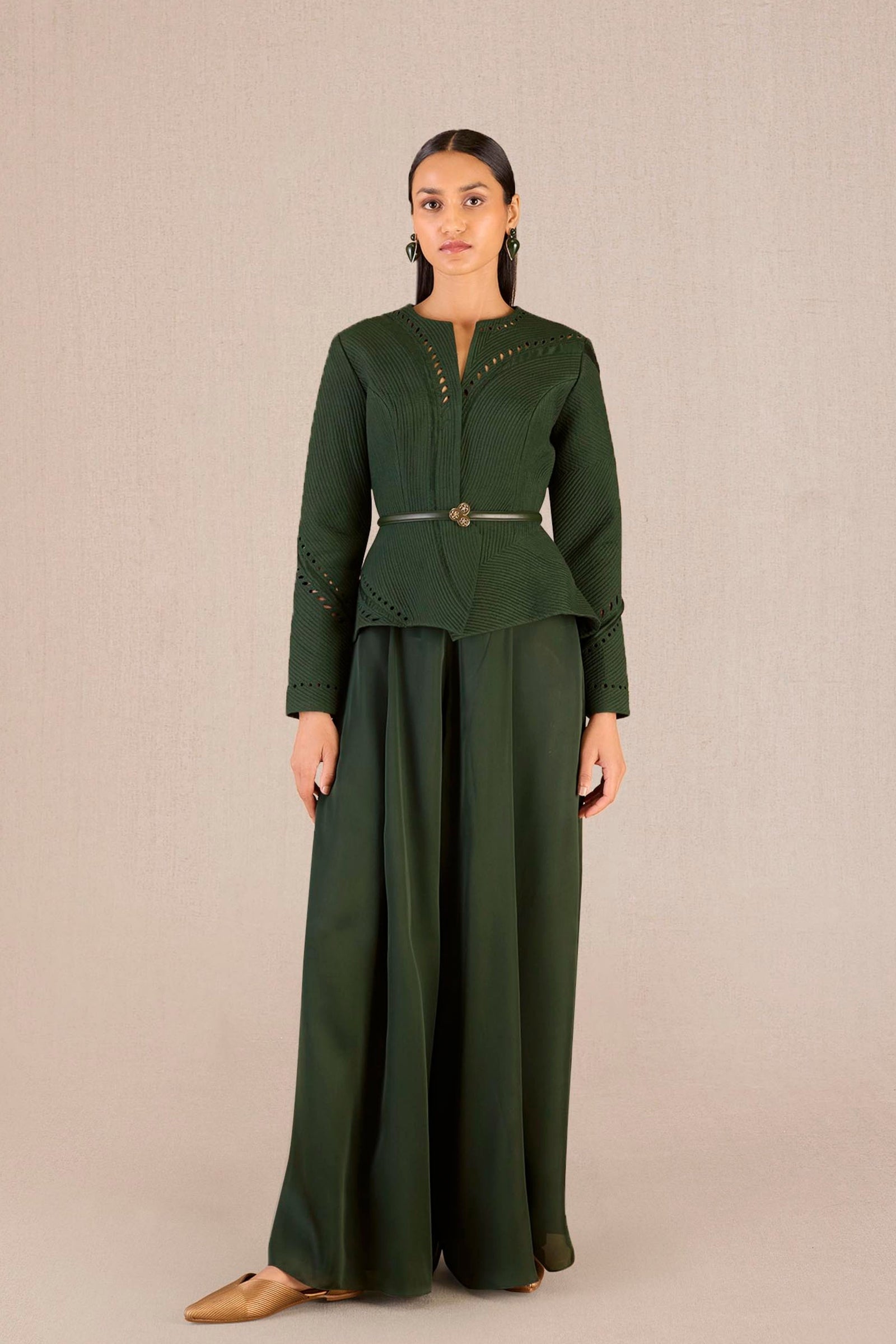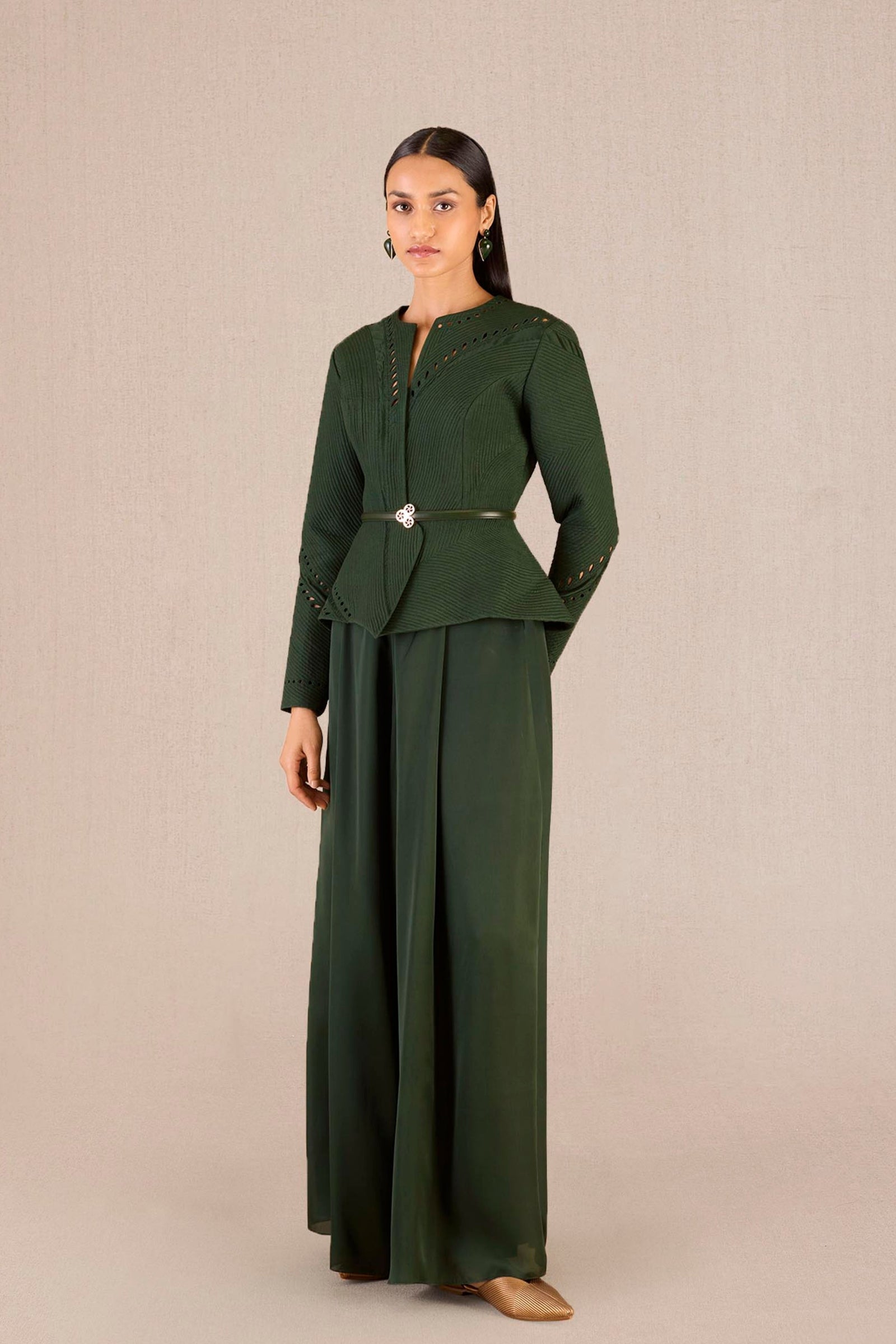 • The casual elegance of the Arzu jacket set is enhanced by delicate resham embroidery, with leaves and flowers in the collection’s signature paan motif adorning the soft wool fabric. Fine scalloped edges that were carefully cut by hand and subtle dori embroidery lend an exquisite finish along the hem. A matching dress in the softest wool comes with the set, with an asymmetrical drape and faux leather belt. Transition seamlessly from late breakfasts to winter night dinners with Arzu, a set that moves with you from AM to PM.