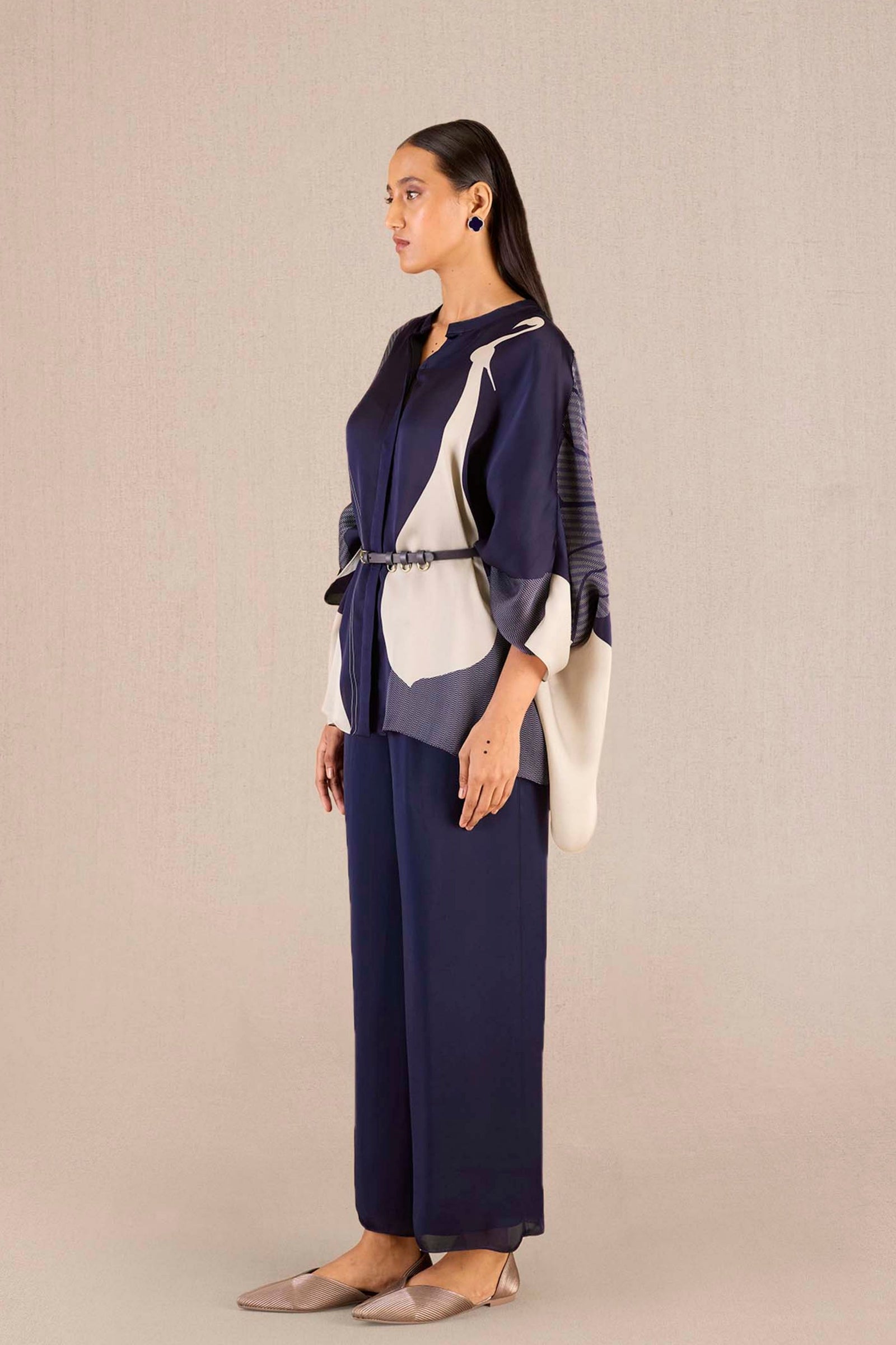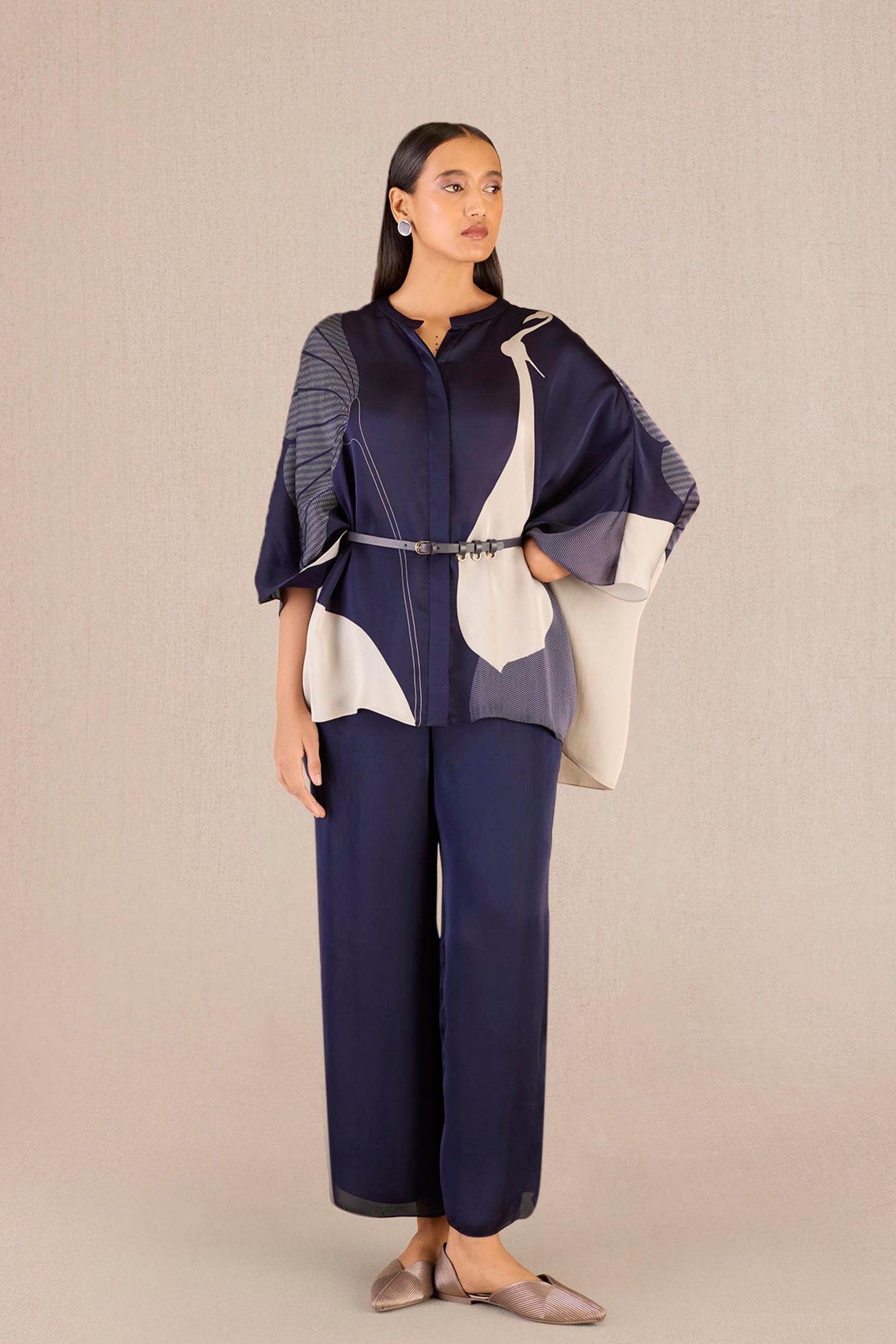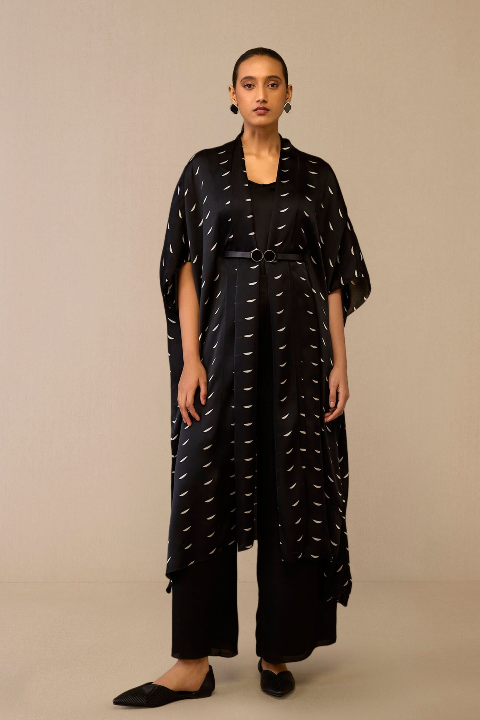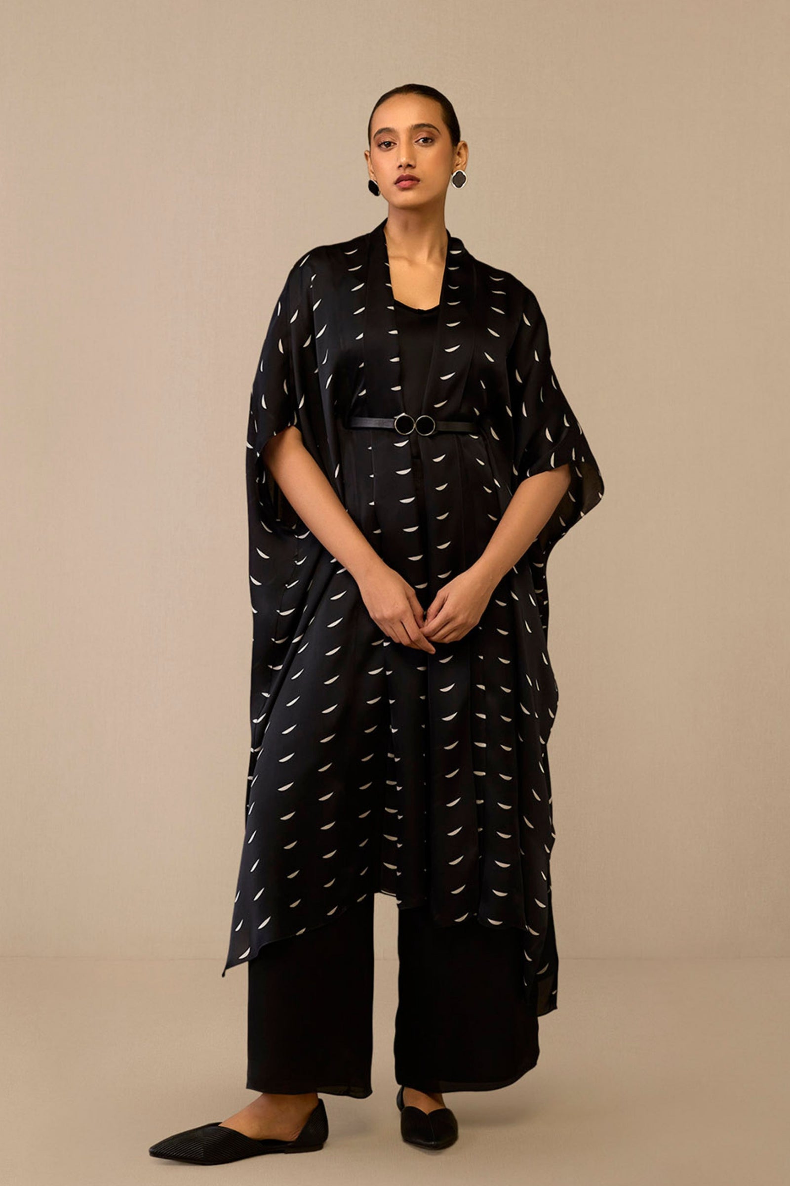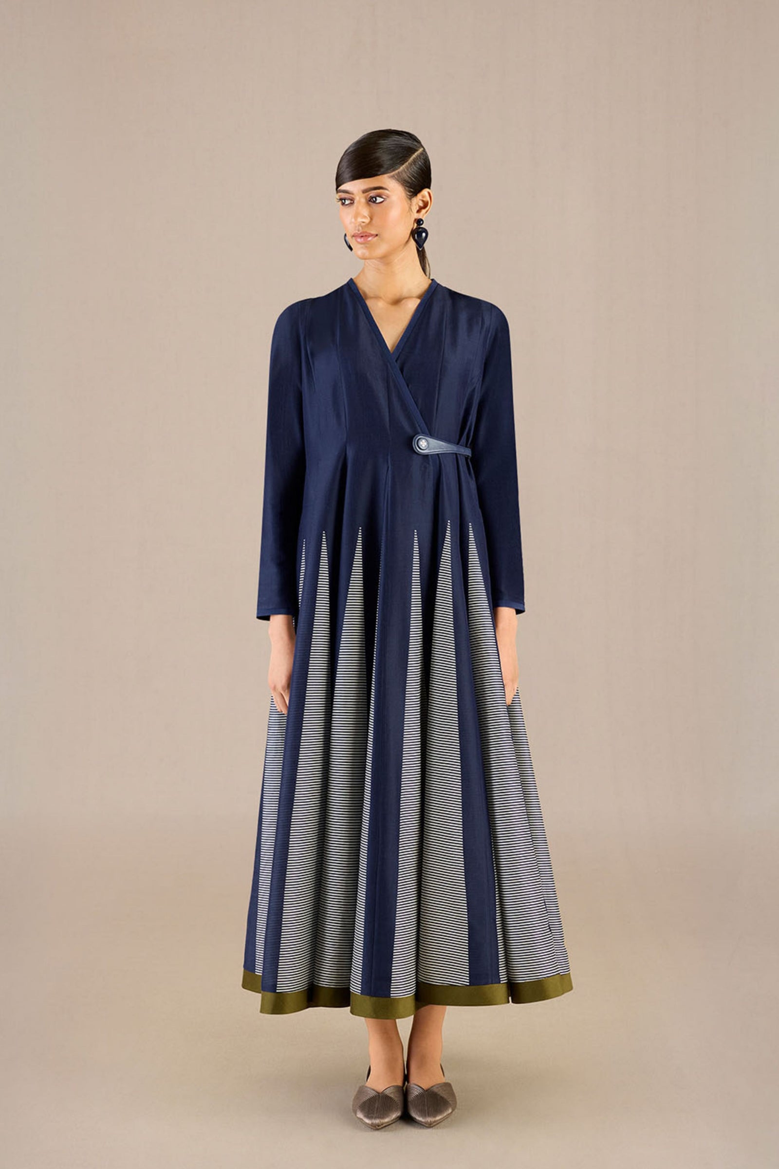 • The casual elegance of the Arzu jacket set is enhanced by delicate resham embroidery, with leaves and flowers in the collection’s signature paan motif adorning the soft wool fabric. Fine scalloped edges that were carefully cut by hand and subtle dori embroidery lend an exquisite finish along the hem. A matching dress in the softest wool comes with the set, with an asymmetrical drape and faux leather belt. Transition seamlessly from late breakfasts to winter night dinners with Arzu, a set that moves with you from AM to PM.