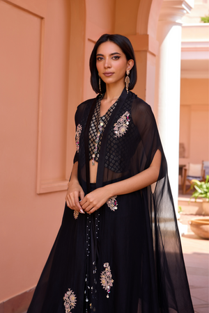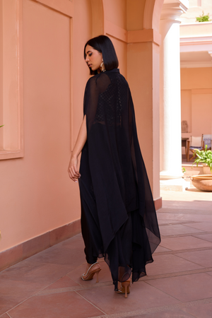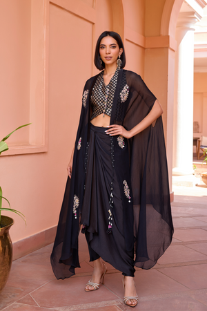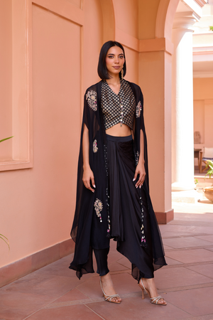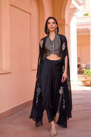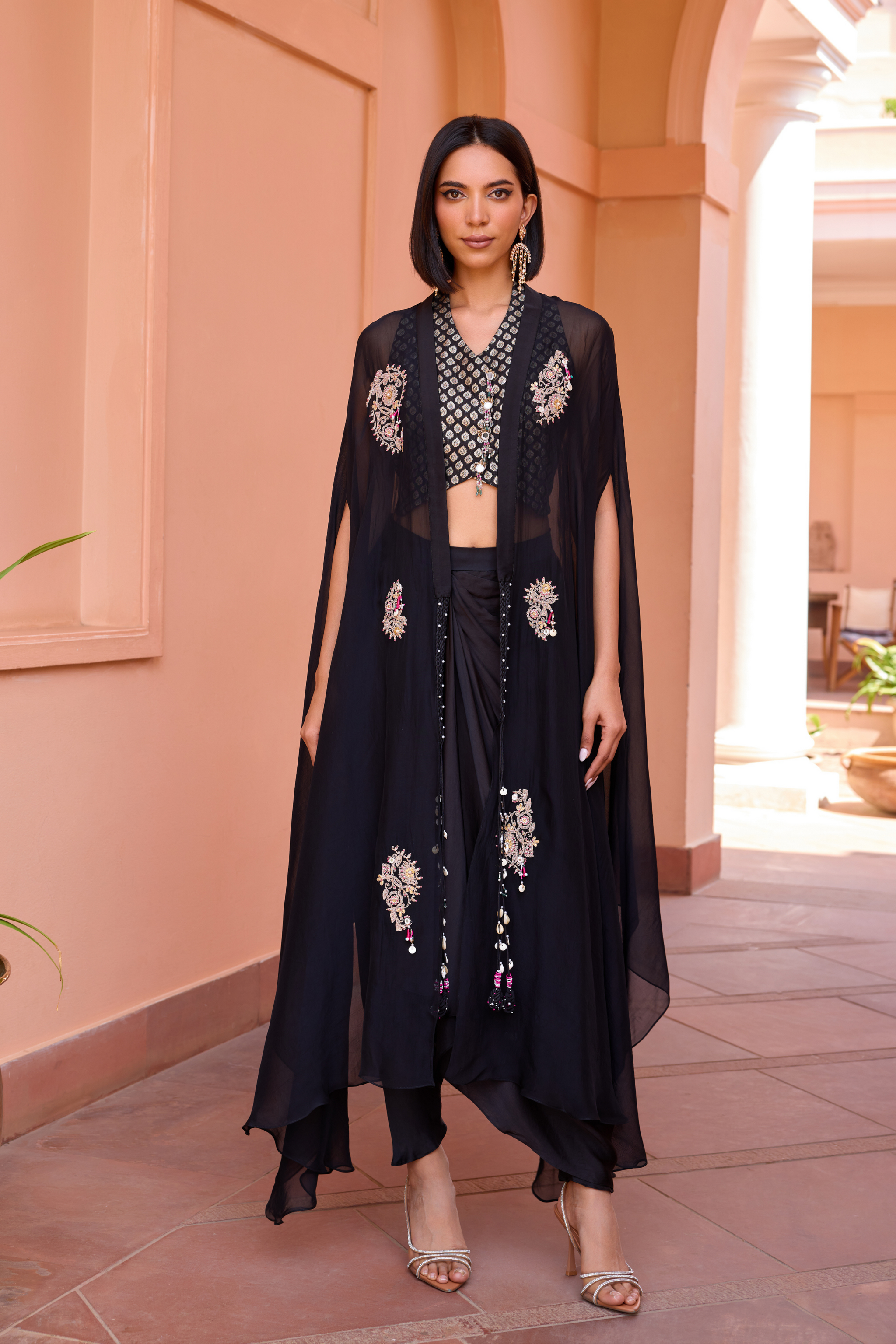 • Black embroidered cape with waistcoat and drape skirt Featuring a captivating Drape pants and dori marodi embroidered cape set with chanderi jacquard tailored waist coat. Redefine elegance with this versatile three piece drape set.