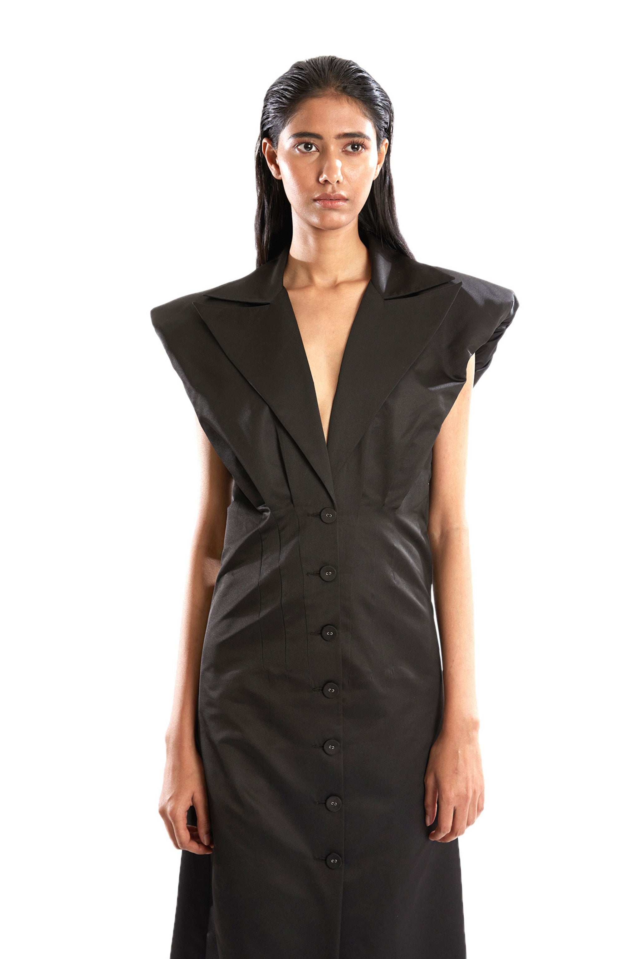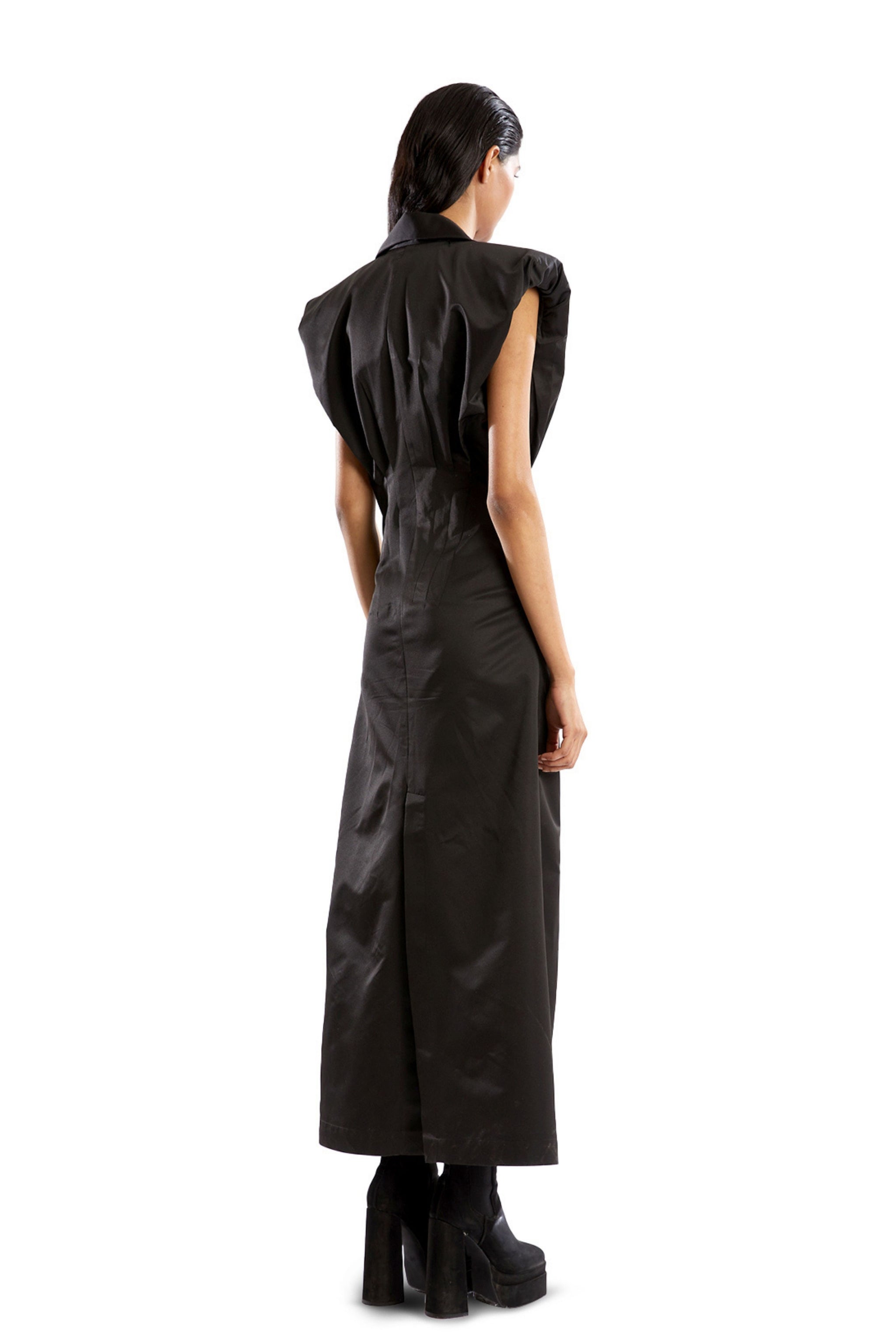 • A timeless symbol of elegance that commands attention. The rich, lustrous texture of this dress drapes your body effortlessly. Its striking powershoulder design adds an element of drama and strength, framing your figure with sculptural precision while elongating your silhouette for a statuesque effect. Style it for a formal soirée, a red carpet event, or an intimate dinner.