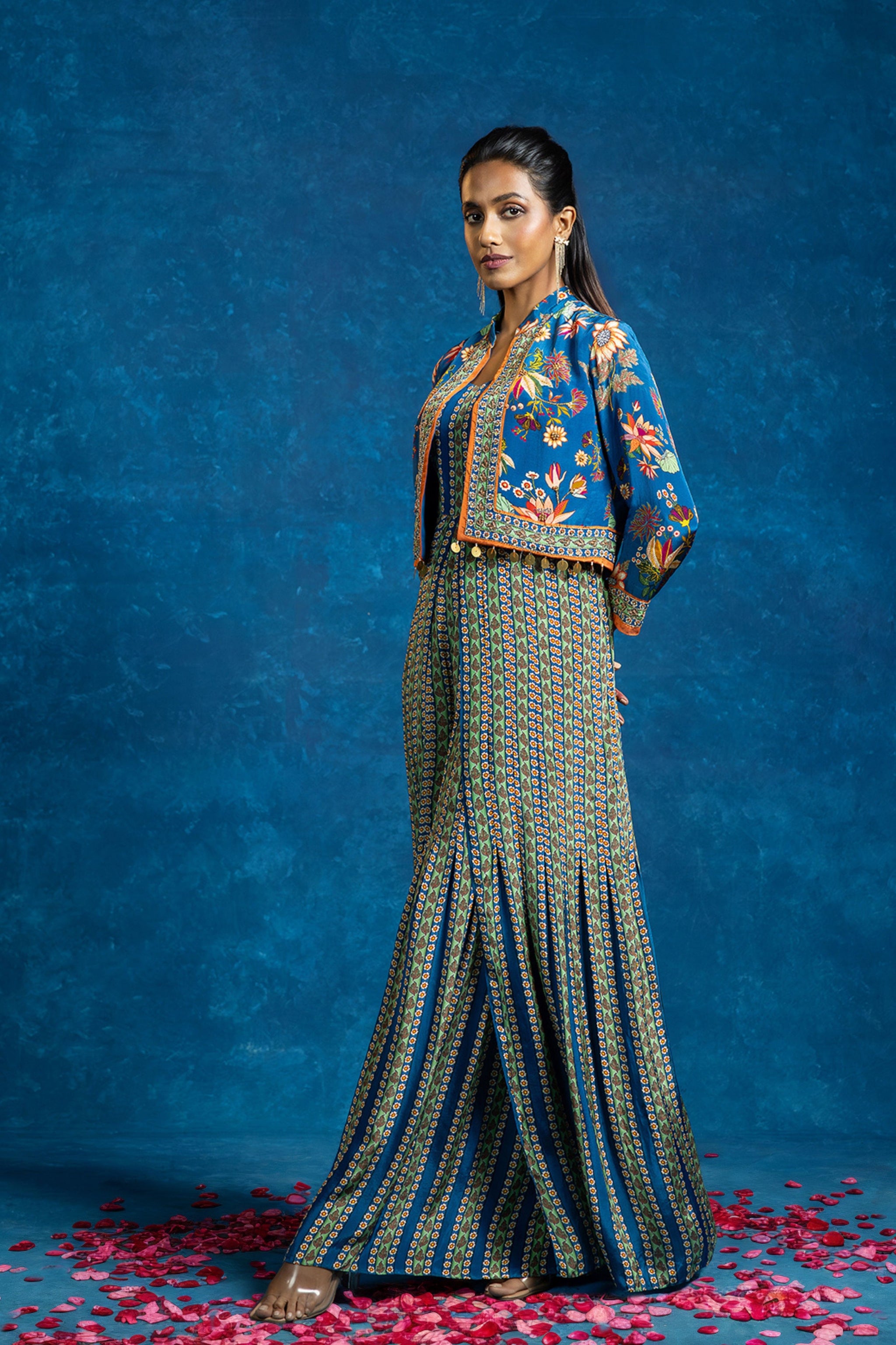 • Blue aarani printed flaired jumpsuit with pintuck detail, paired with embroidered short jacket in crepe.