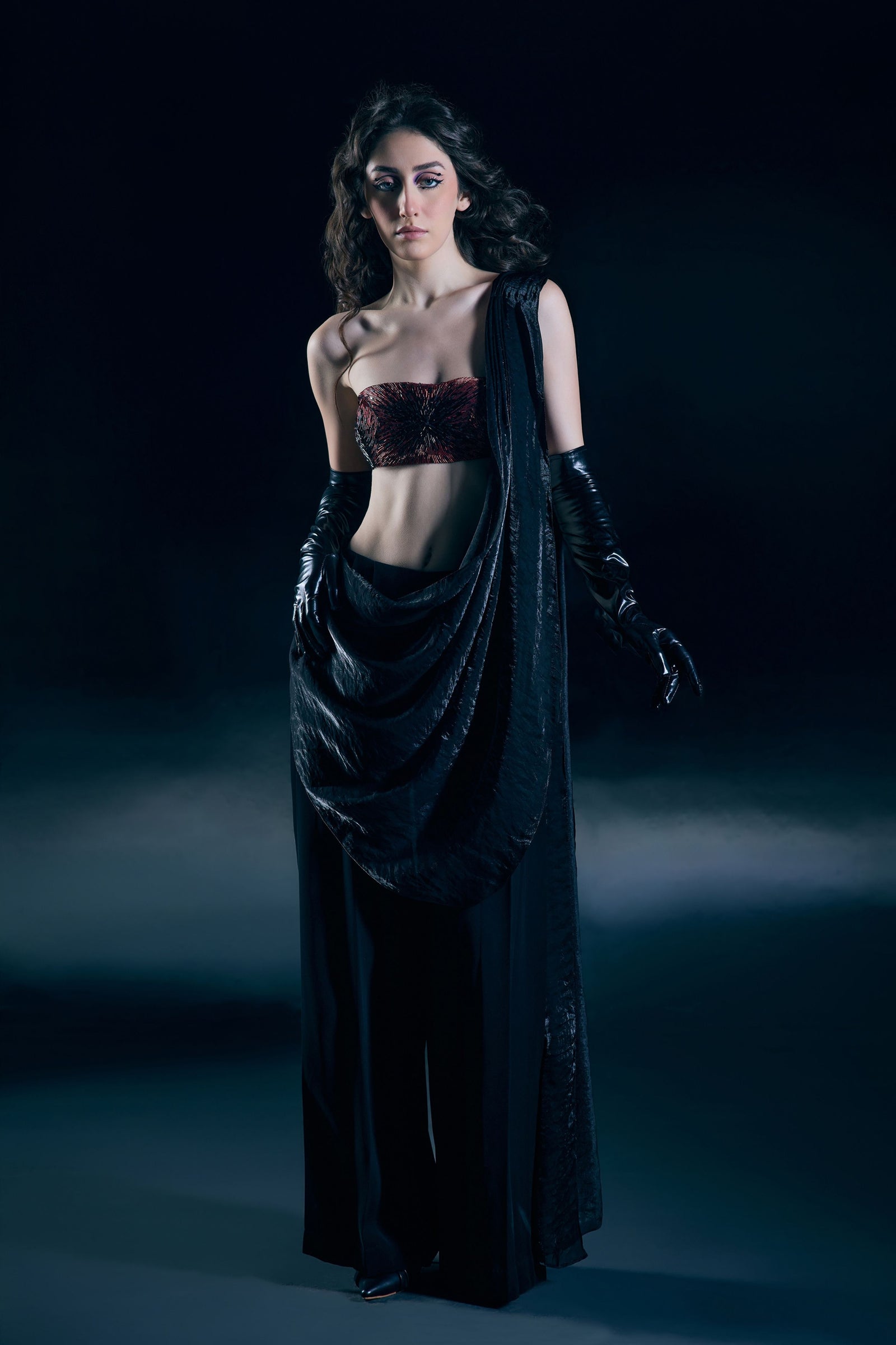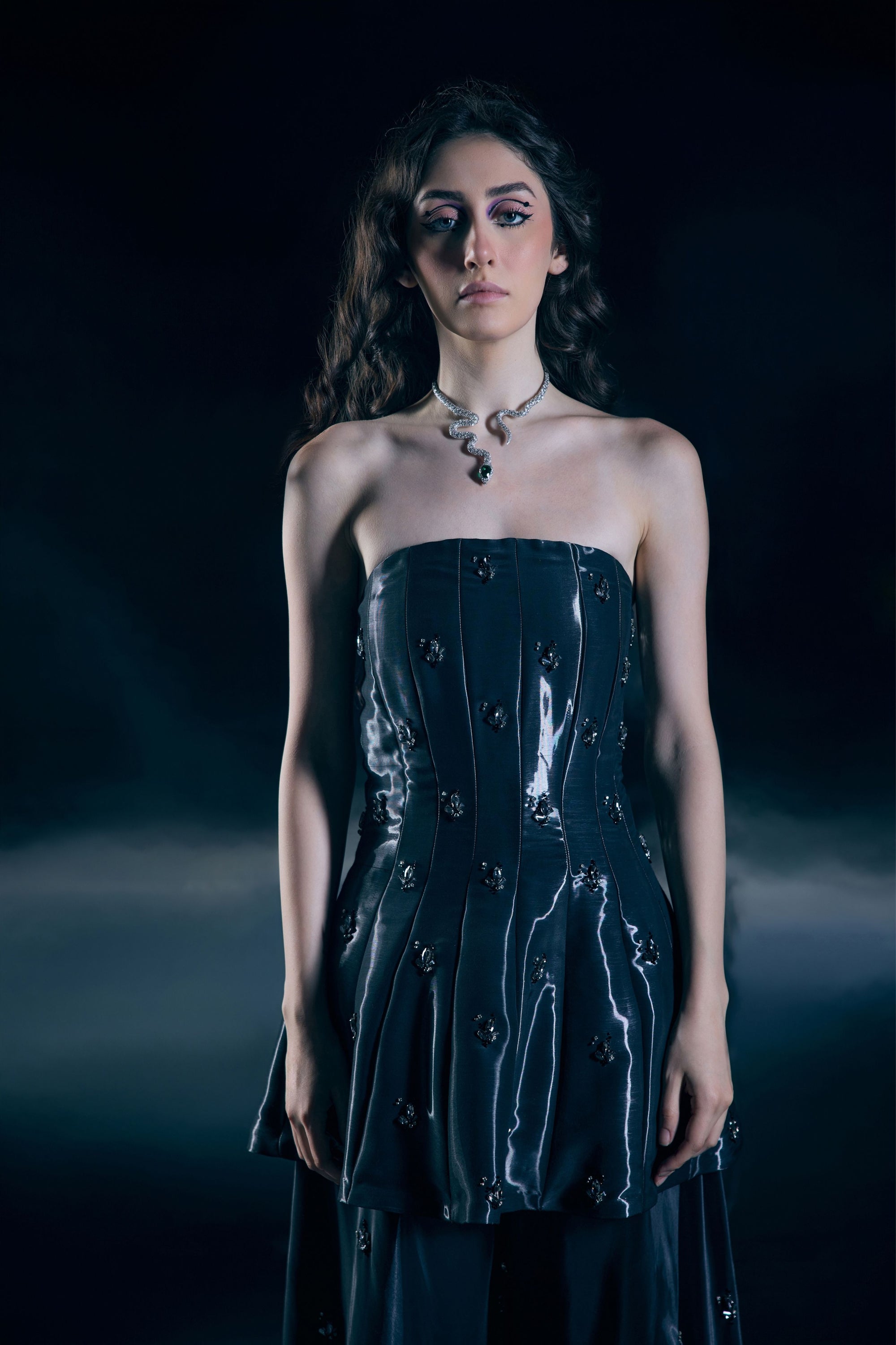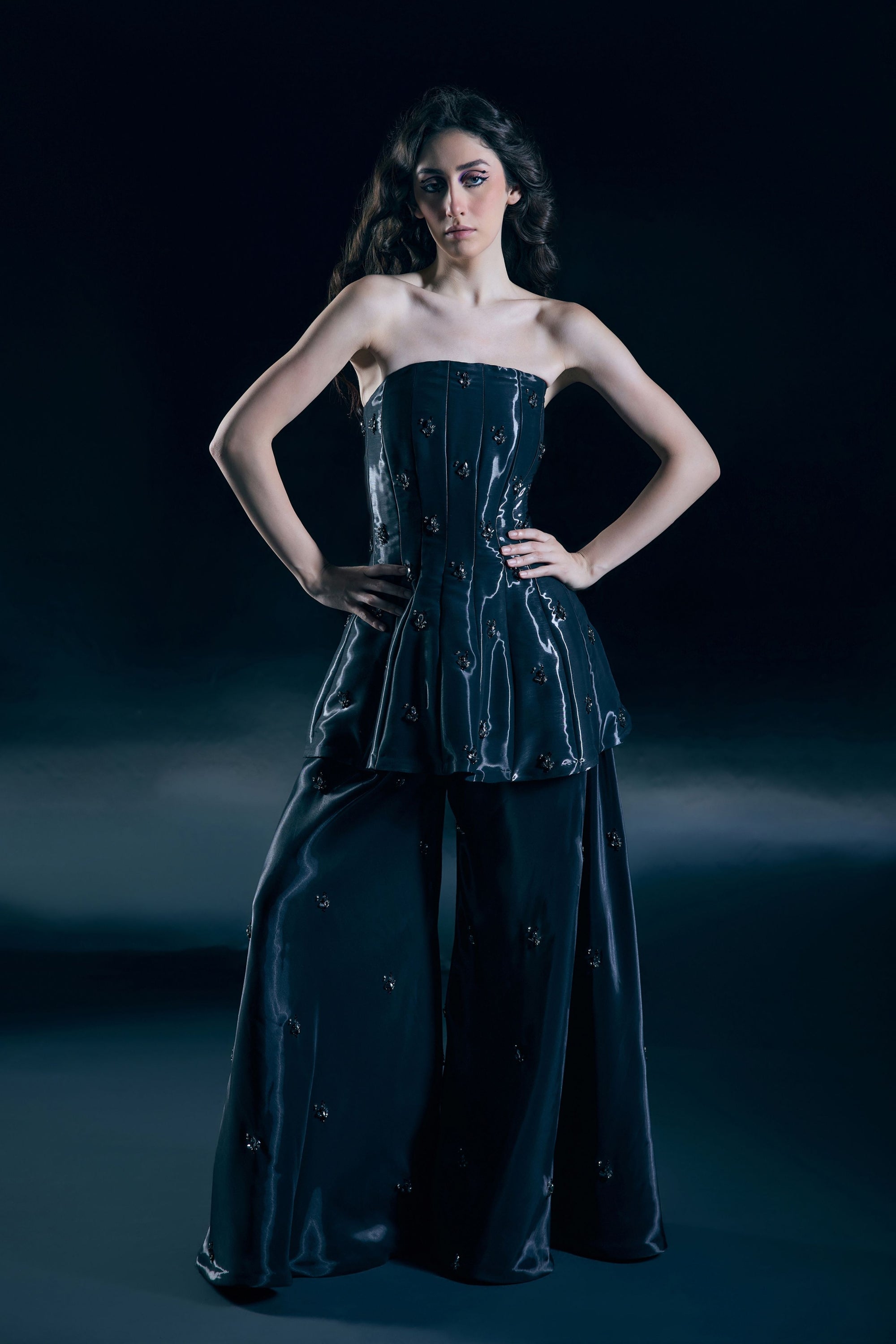 • A denim ensemble featuring a corset adorned with denim appliqués with detailed embroidery, beautifully paired with denim pants that is also detailed with glass bead embroidery.
