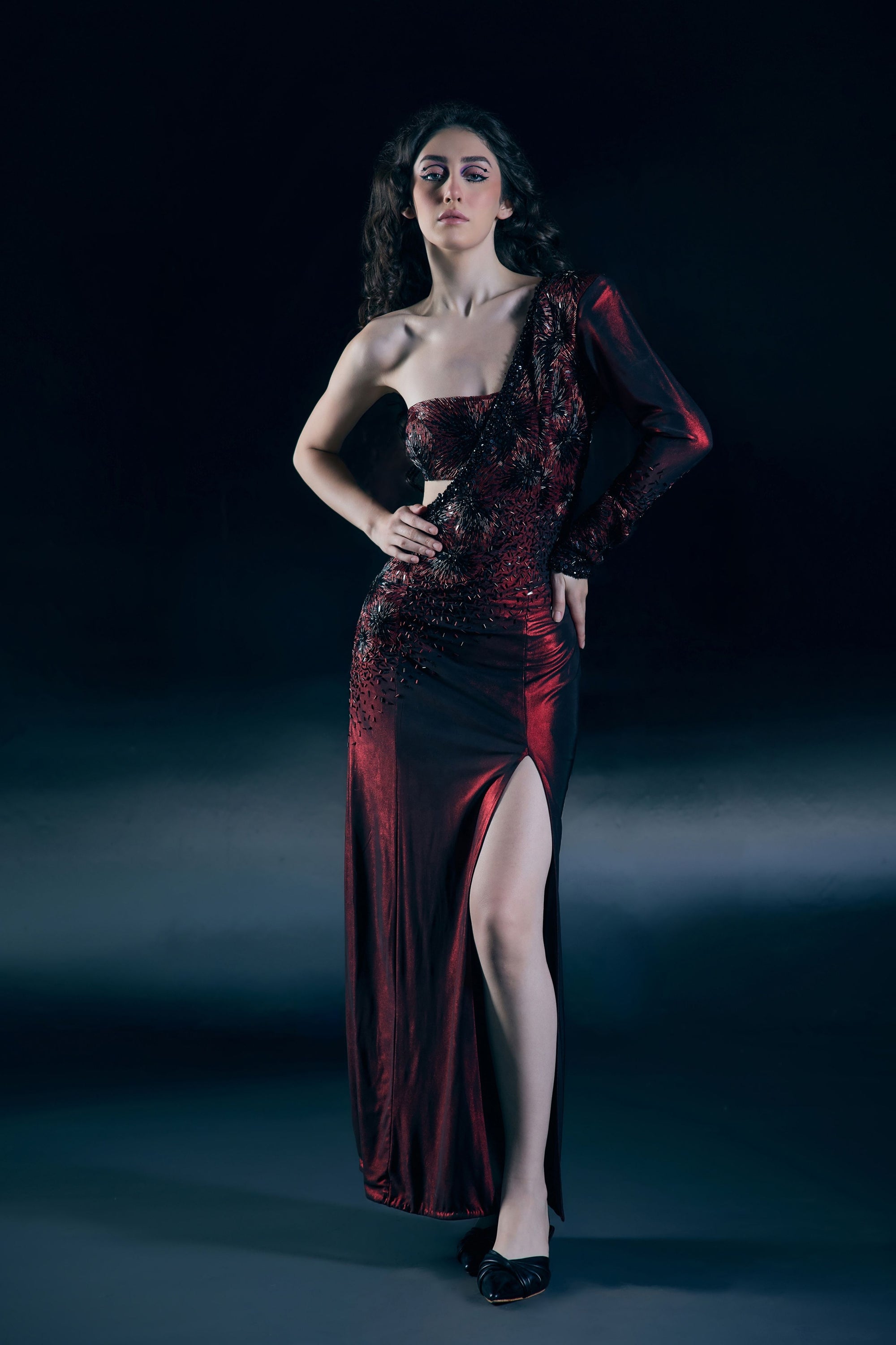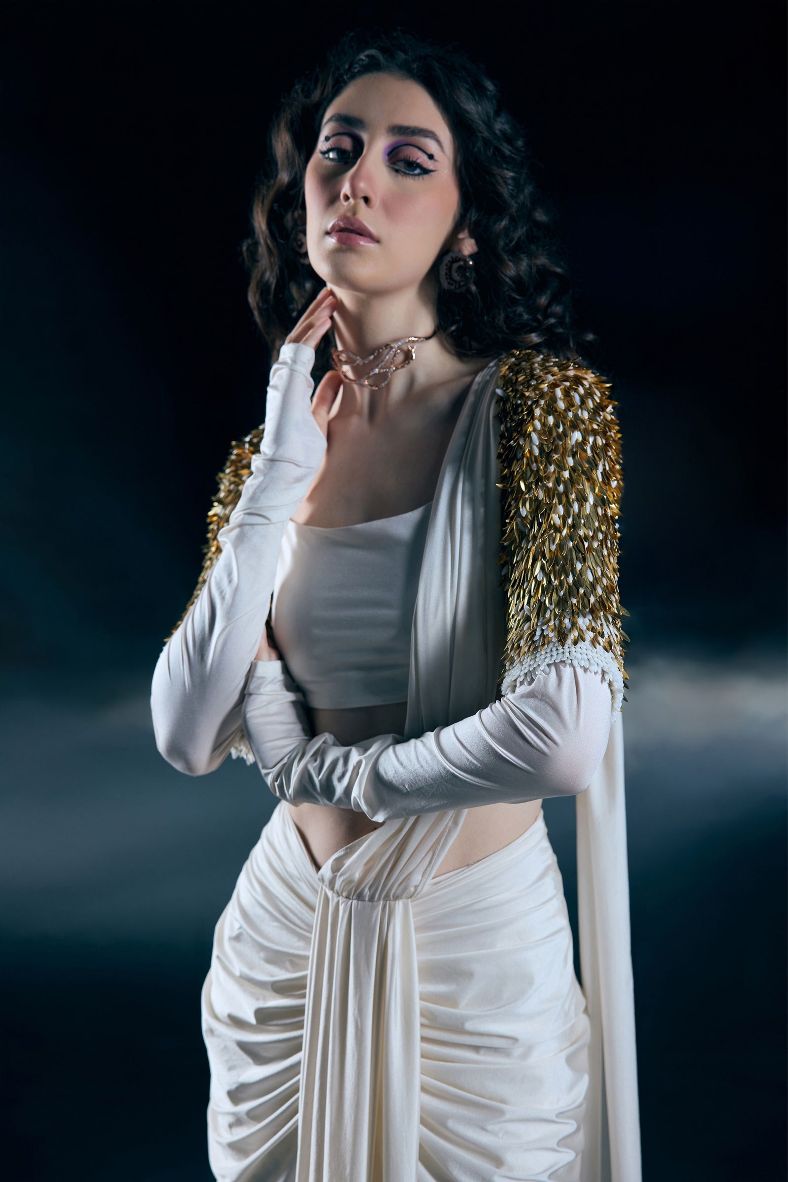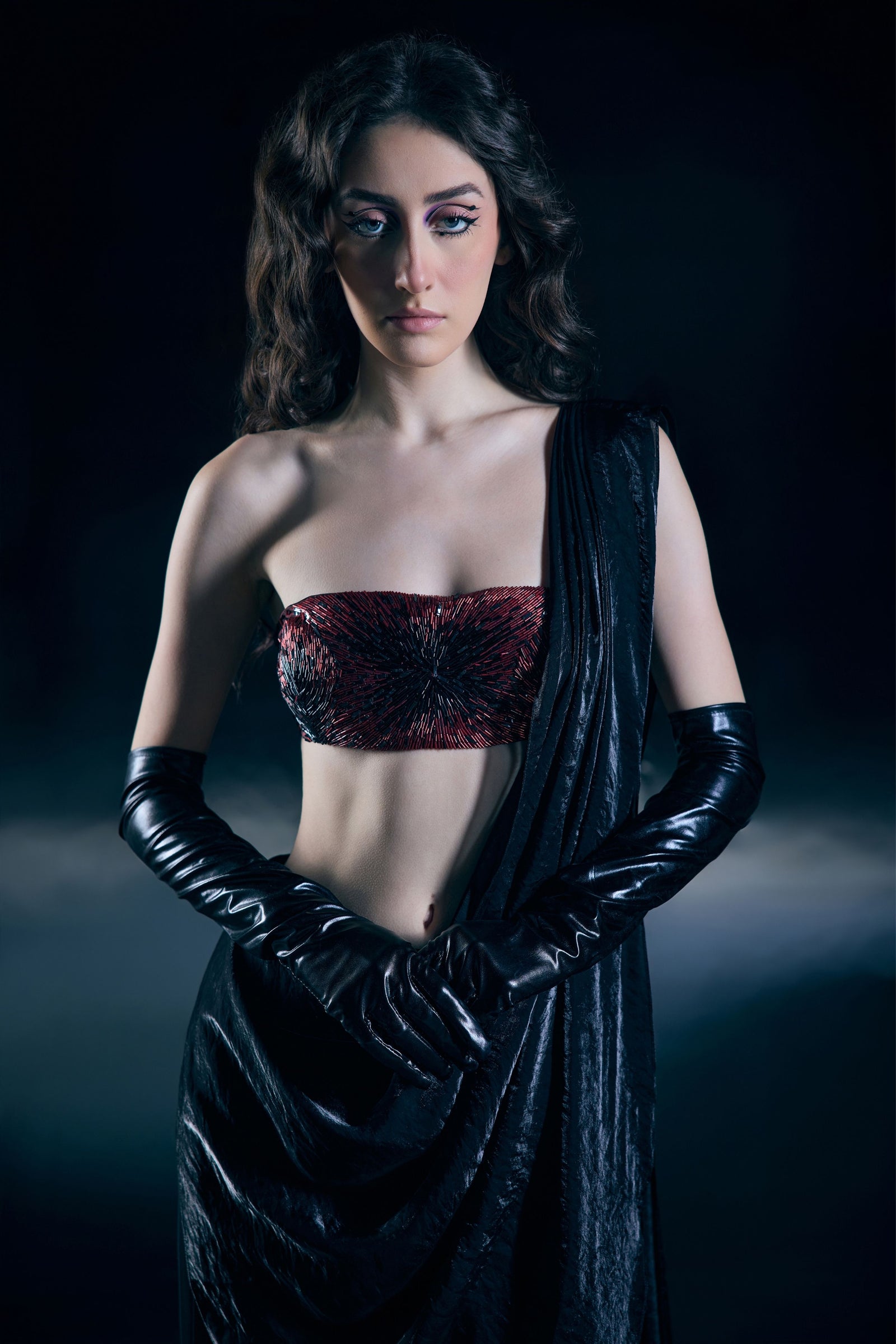 • A denim ensemble featuring a corset adorned with denim appliqués with detailed embroidery, beautifully paired with denim pants that is also detailed with glass bead embroidery.