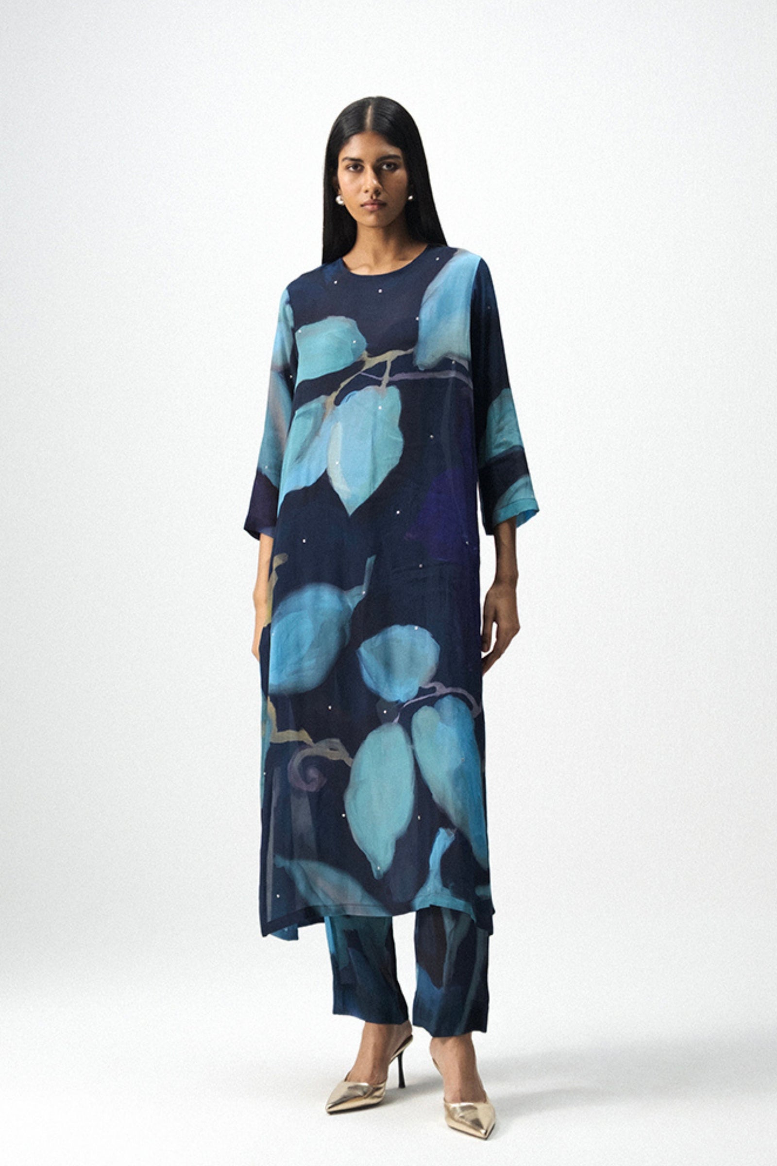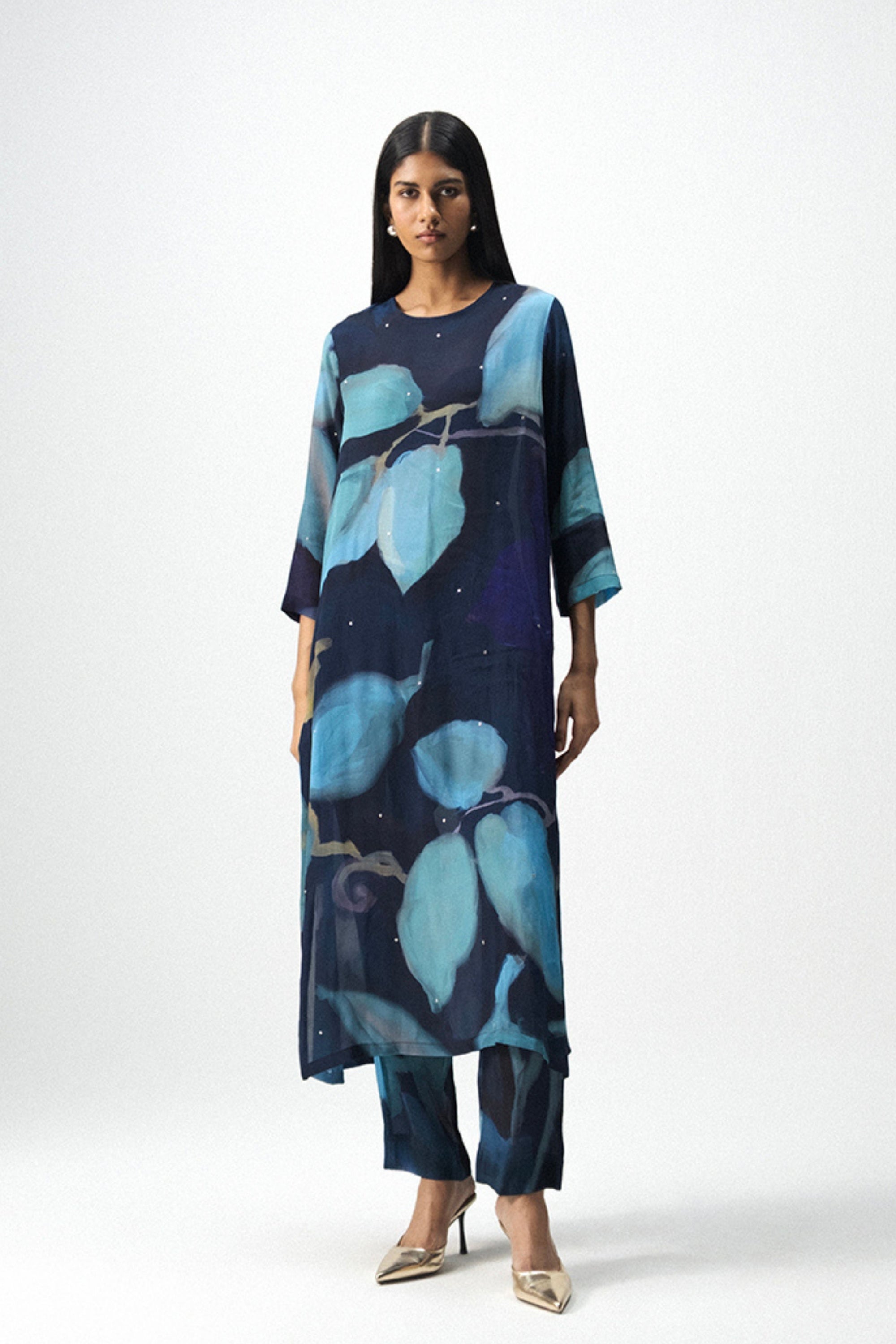 • The print of this ensemble is inspired by the lush beauty of jungle flora, featuring vintage-style flowers that evoke a sense of natural elegance. The intricate design blends vibrant blooms with a timeless aesthetic crafted from soft cotton fabric, the kurta has a round neckline with a front buttoned placket and practical side pockets for added convenience. It is paired with matching printed pants that feature an elasticated waist with front drawstrings for a comfortable fit. The pants also include side pockets, ensuring both style and functionality in this chic ensemble. Perfect for any casual outing or relaxed gathering.