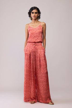 • Elevate your festive and occasion wear with this elegant three-piece ensemble, featuring a lustrous striped cotton silk tissue jacket with delicate gold embroidery in a relaxed silhouette, paired with a satin printed camisole and modal satin wide-leg pants, a refined play of textures that balance sheer shimmer with subtle motifs for effortless grace and comfort.