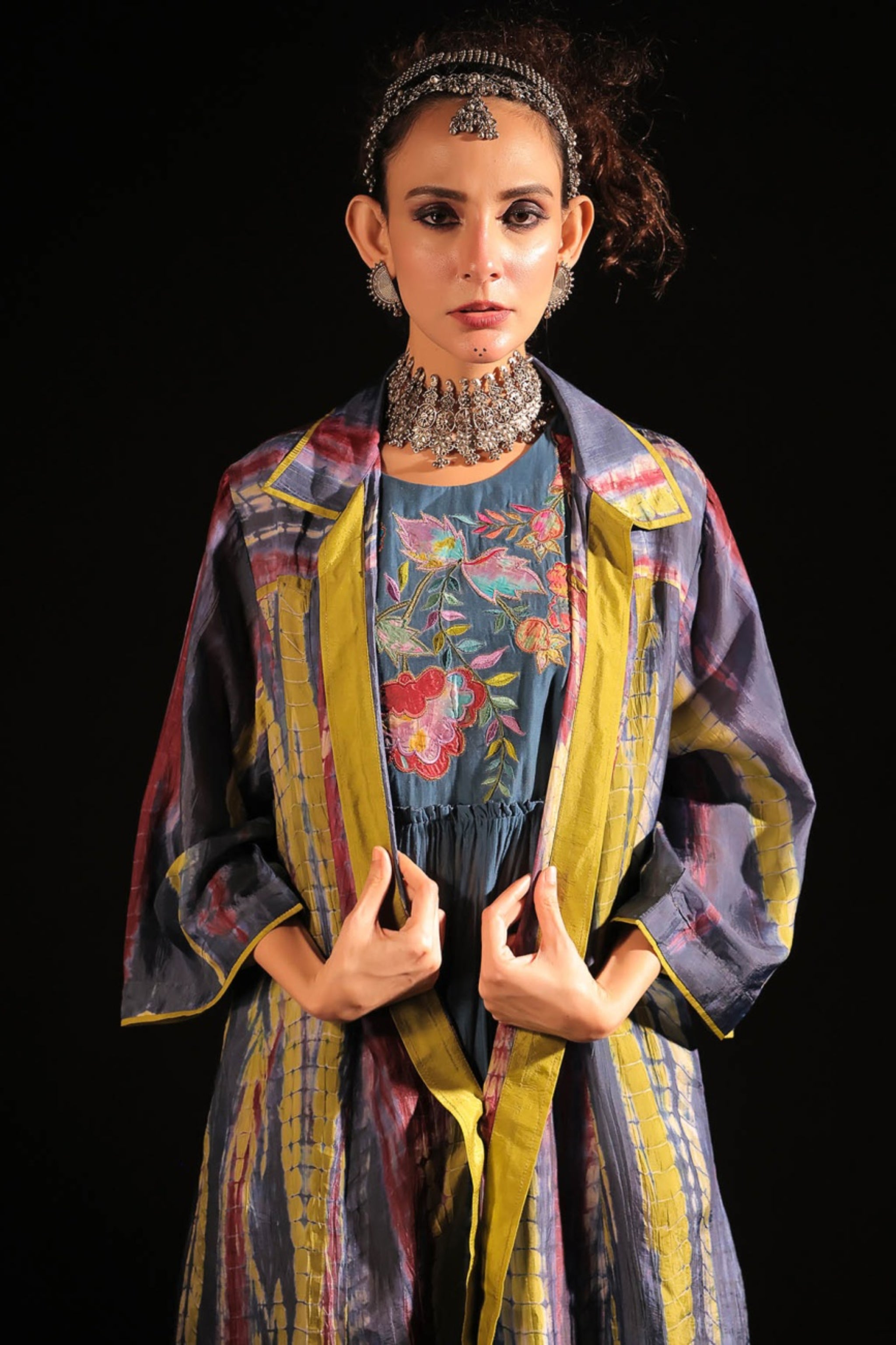 • Emb yoke gathered dress inner tie dye shirt cape