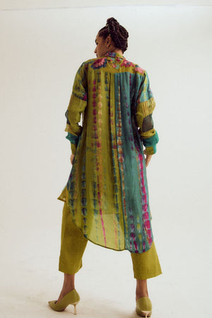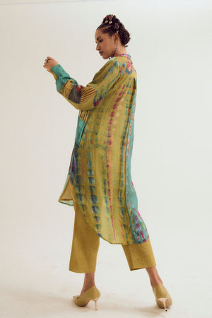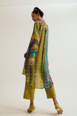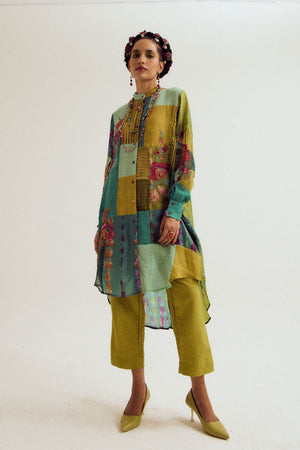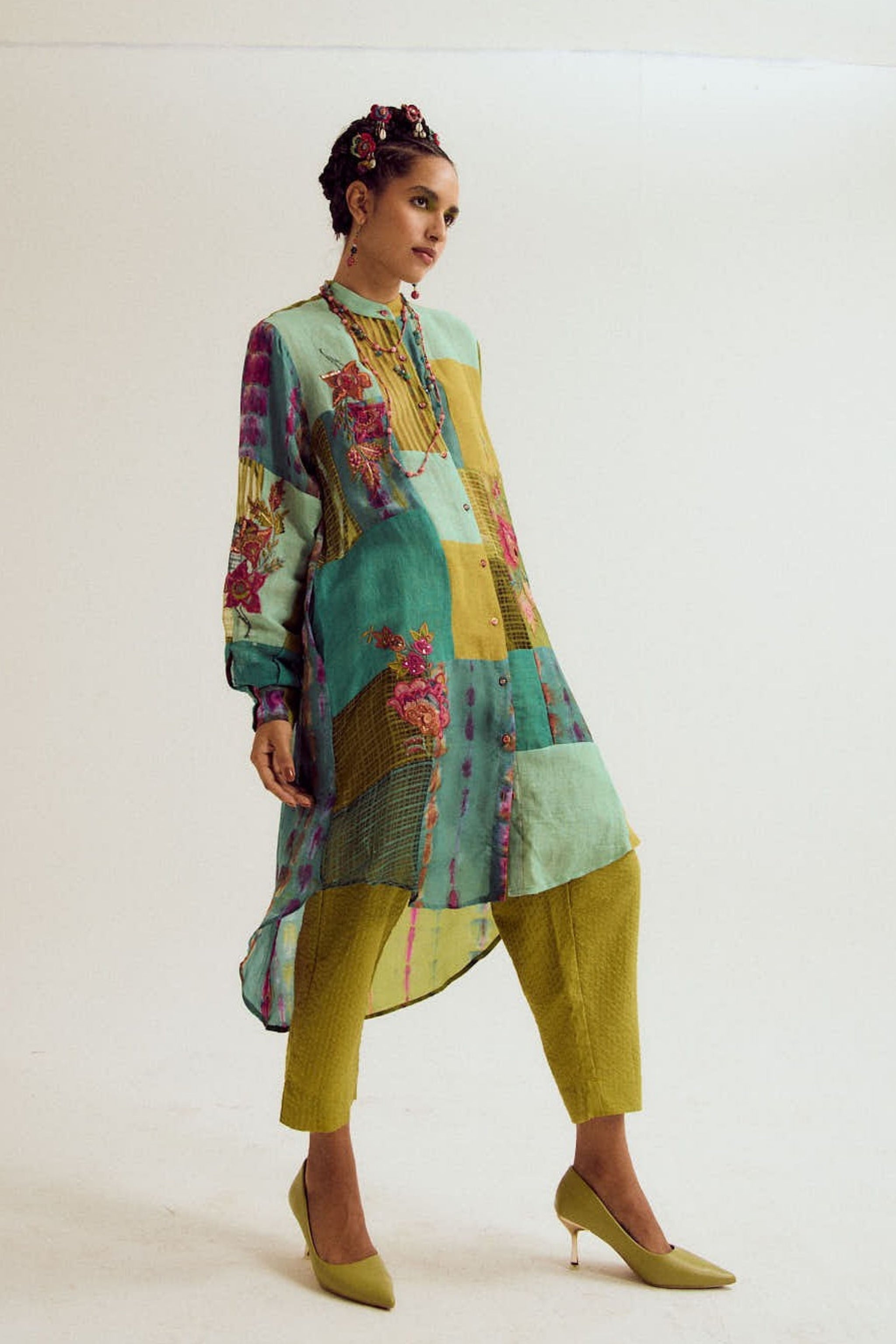 • A contemporary patchwork ensemble featuring a front-open hi-low band-collar kurta, paired with front-open cotton pants for effortless elegance. The pants include a back elastic waistband for comfort and come with an inner lining for a polished finish.